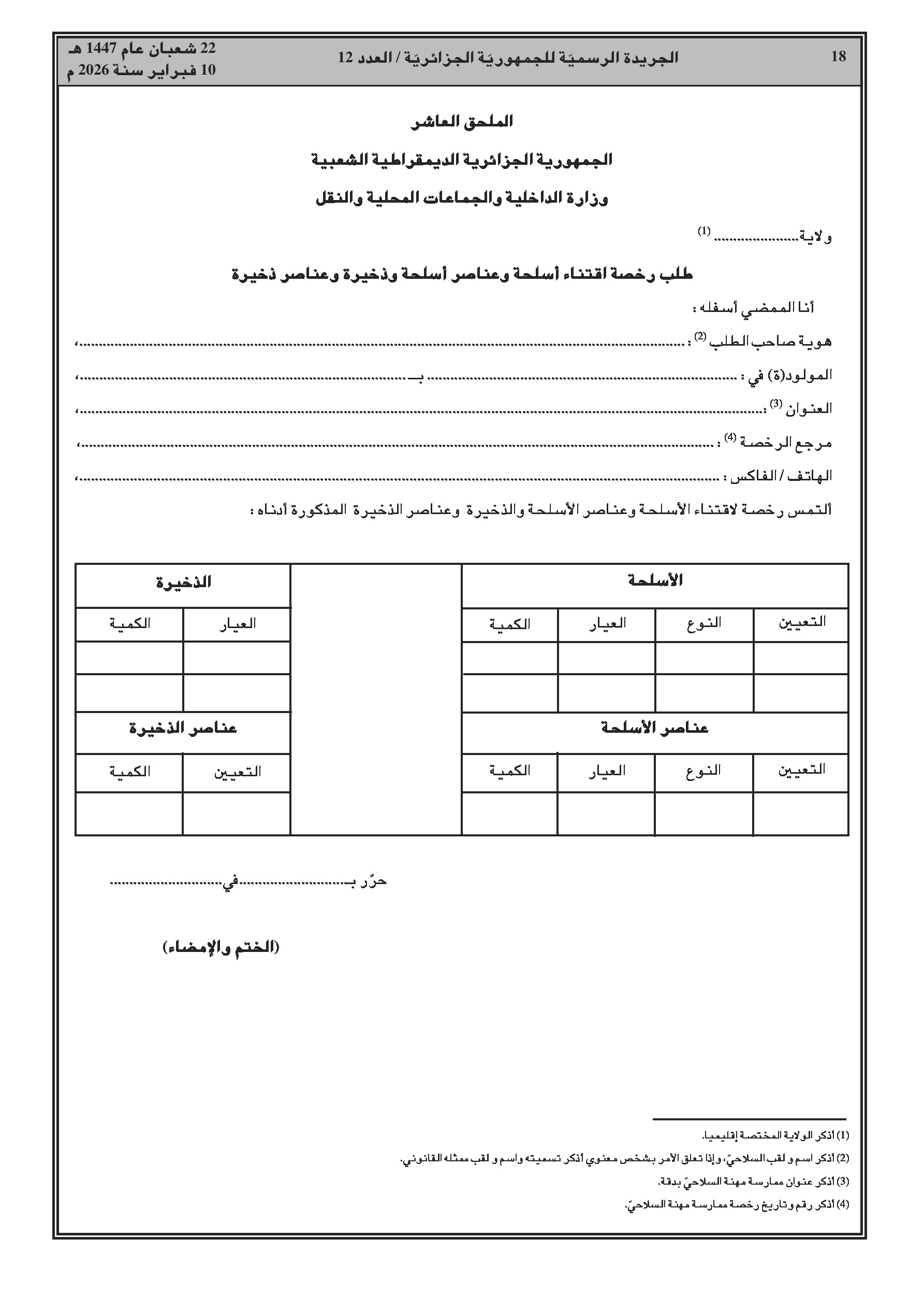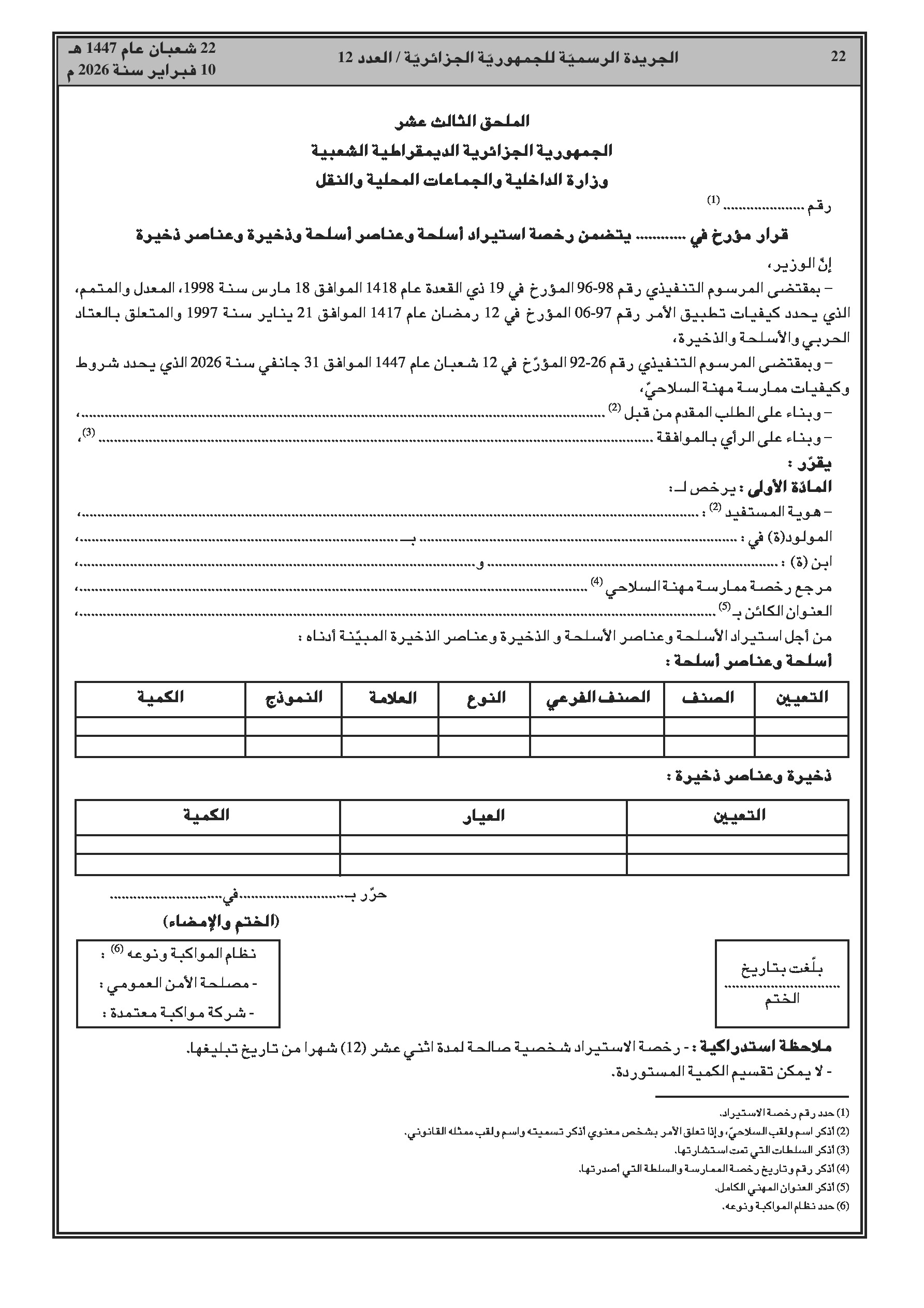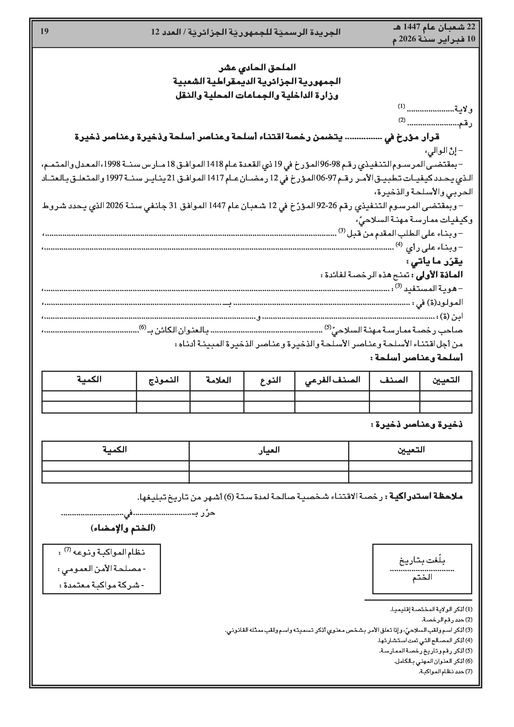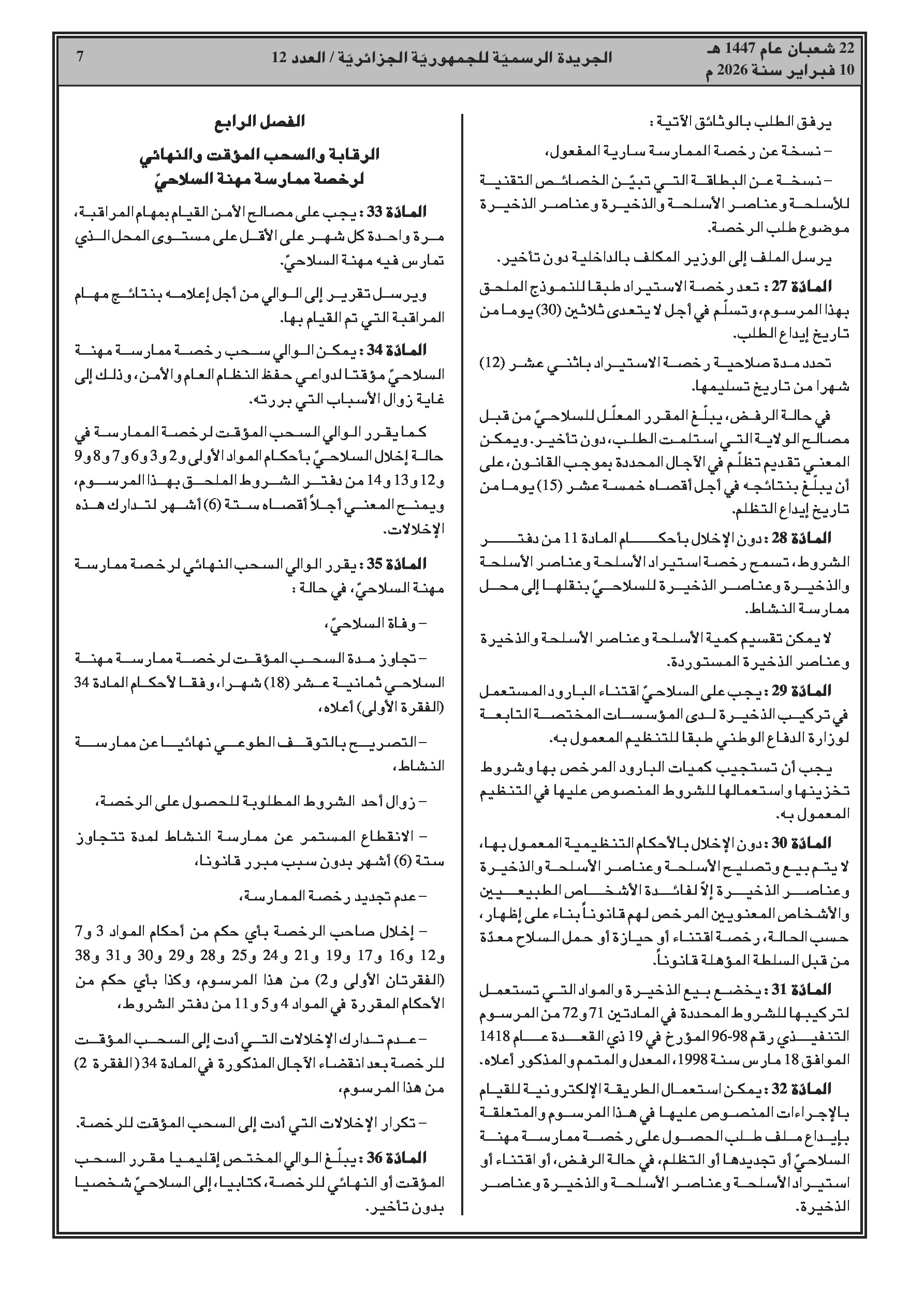 مرسوم تنفيذي يحدد القواعد الصارمة لبيع، شراء، استيراد، وإصلاح الأسلحة والذخيرة، وشروط الأمن المطلوبة.