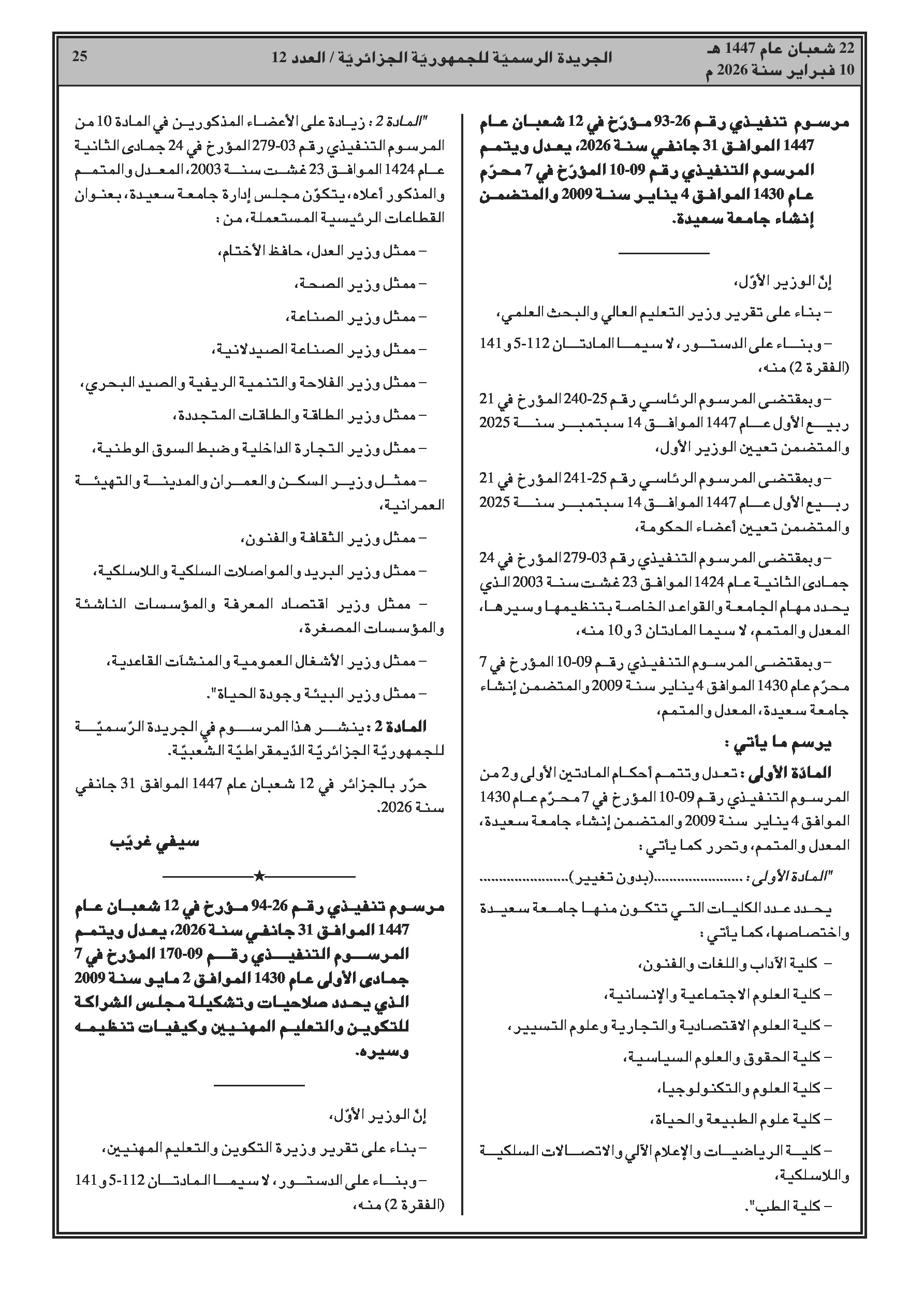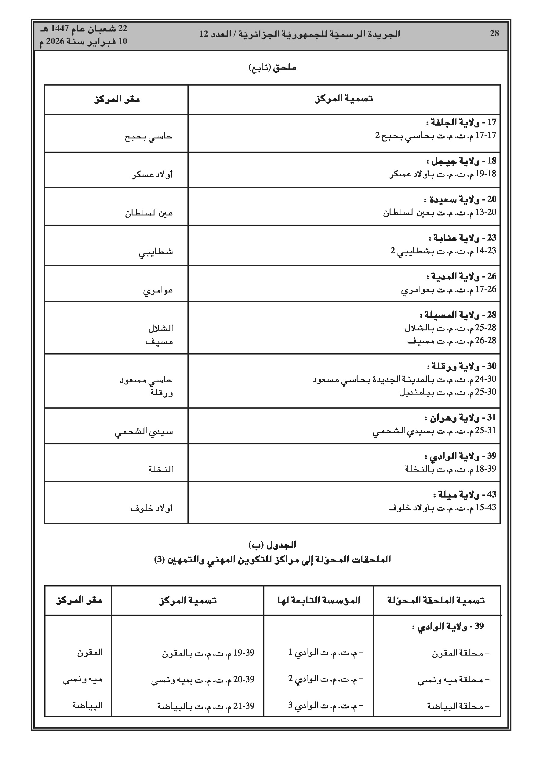 مراسيم بإنشاء مؤسسات تكوين جديدة وتعديل تنظيم جامعة سعيدة ومجلس شراكة التكوين المهني.
