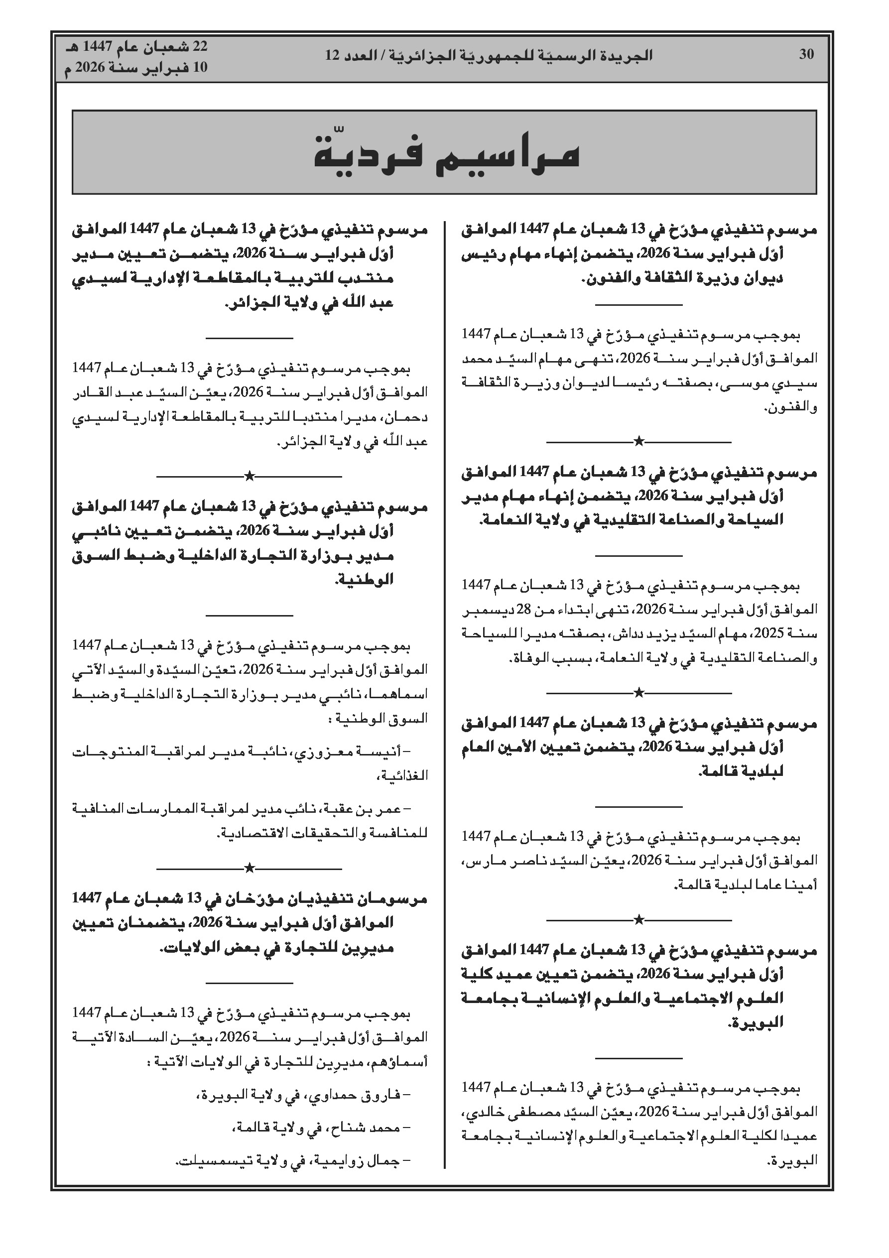 تغييرات في قطاعات الثقافة، السياحة (النعامة)، والجماعات المحلية (قالمة، الجزائر، معسكر).