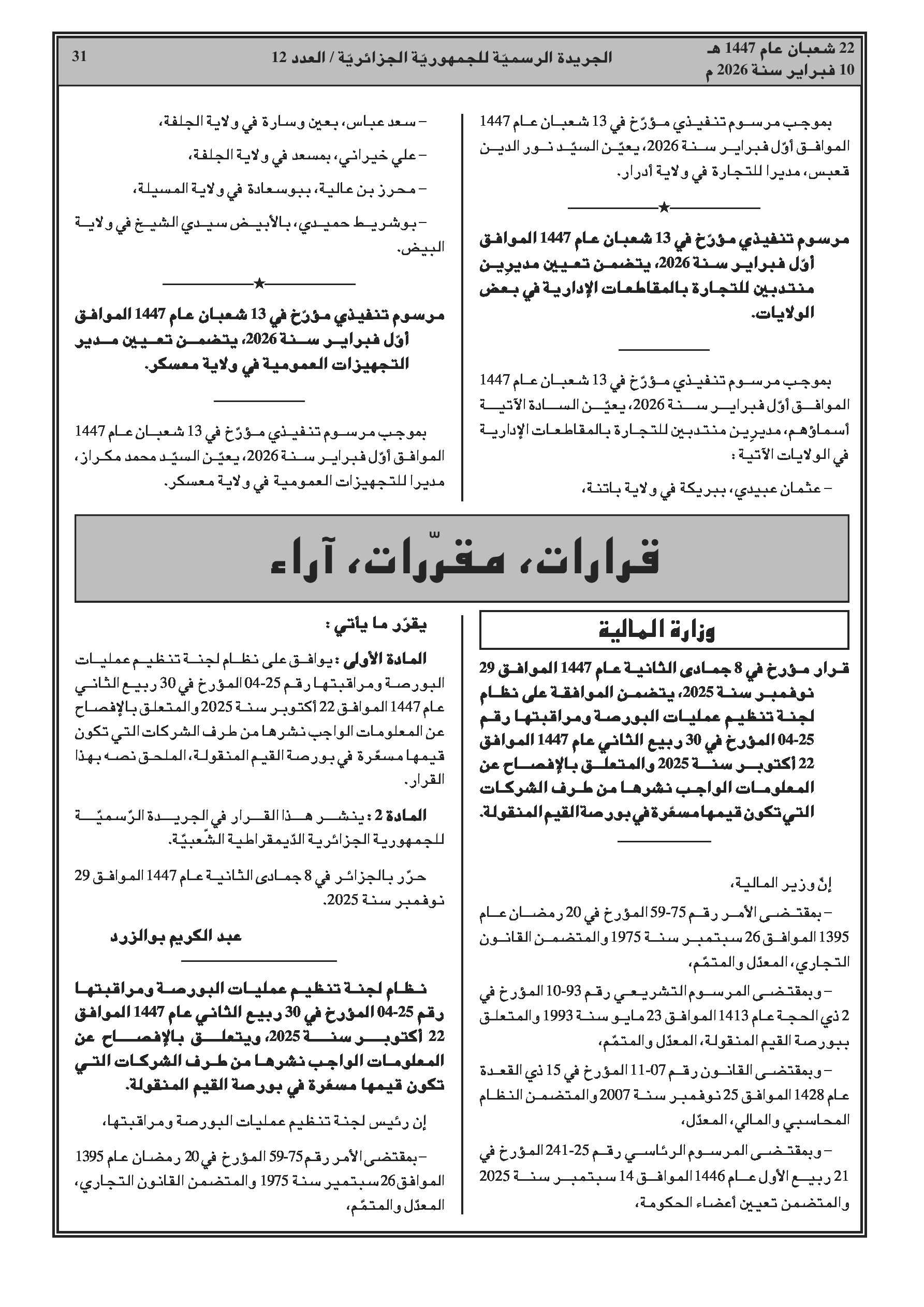 تعيين مديرين ومديرين فرعيين في وزارة التجارة ومديرياتها الولائية.