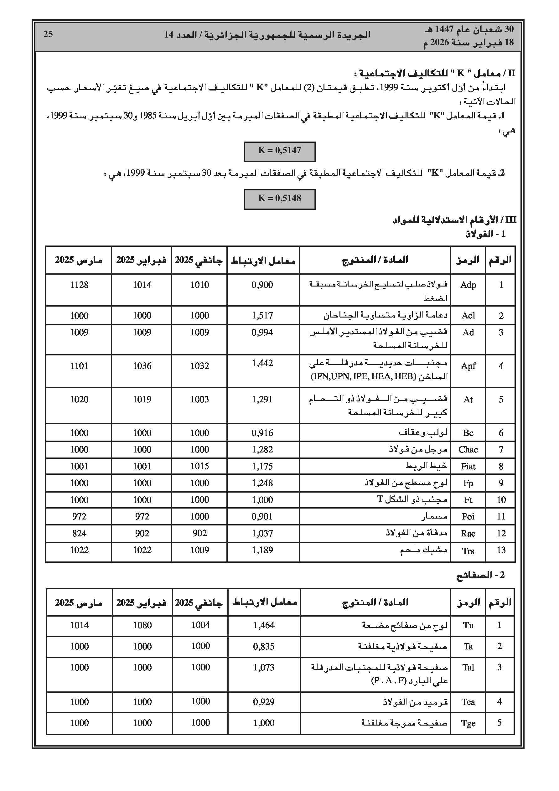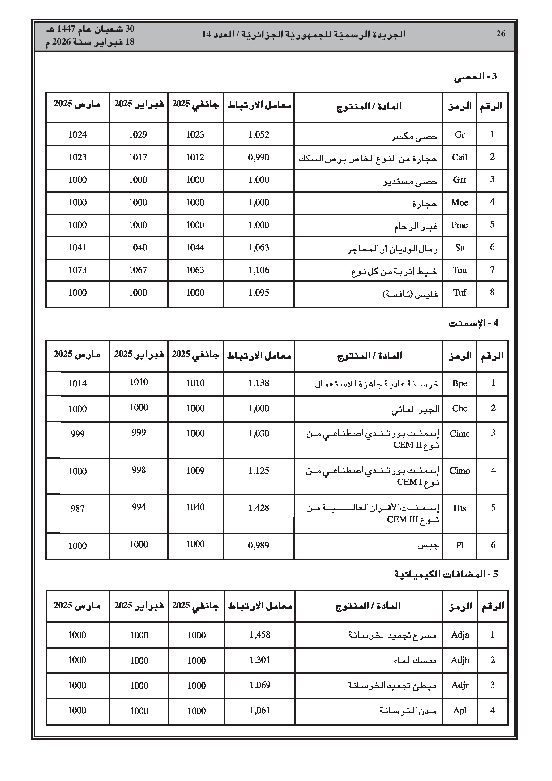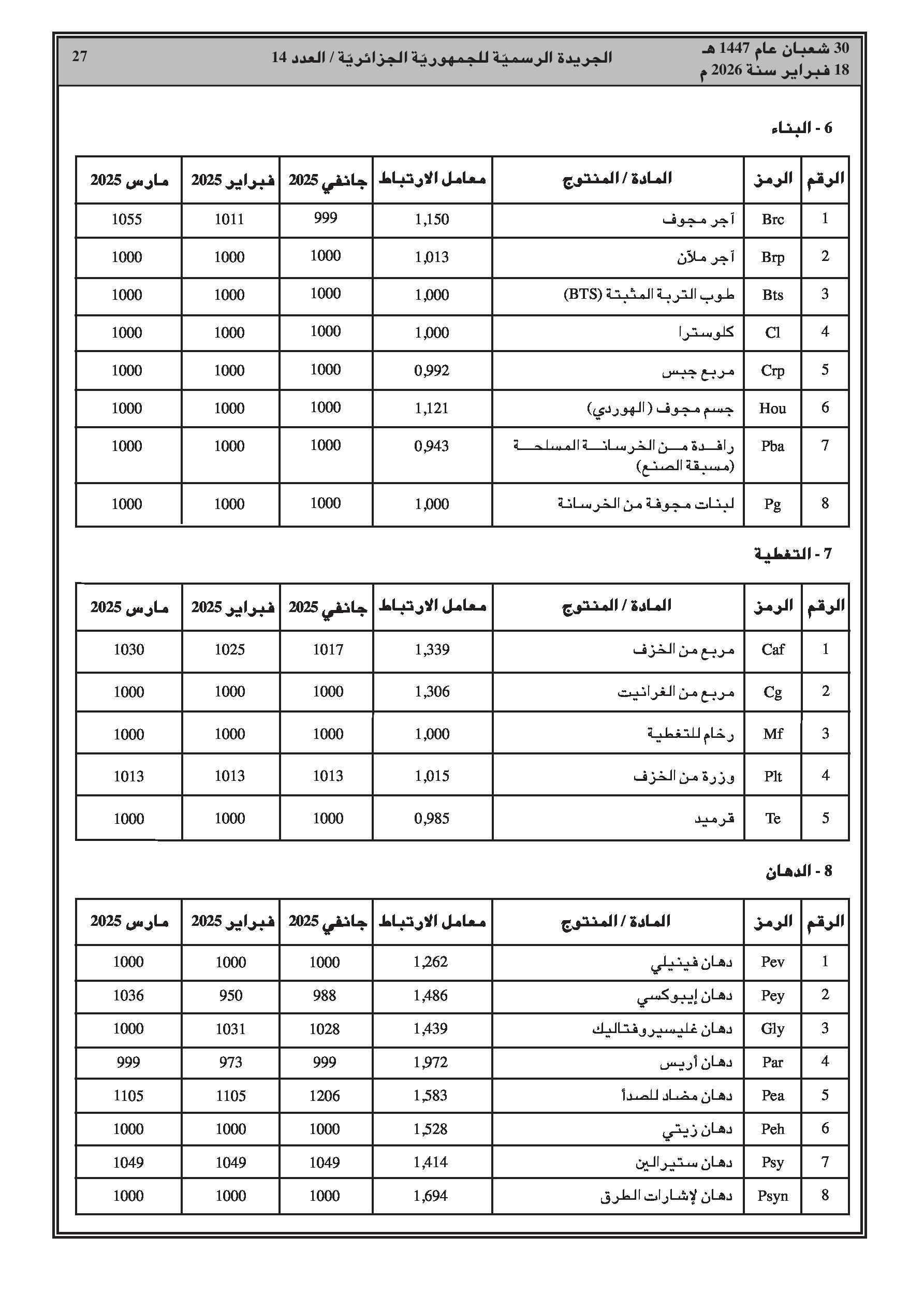 تتضمن جداول مفصلة لمؤشرات الأجور، الإسمنت، الحديد، النقل، والمواد المختلفة للثلاثي الأول من سنة 2025.