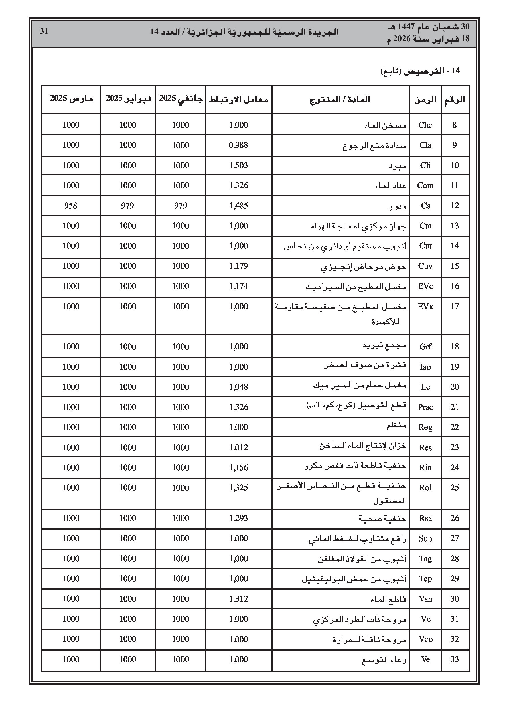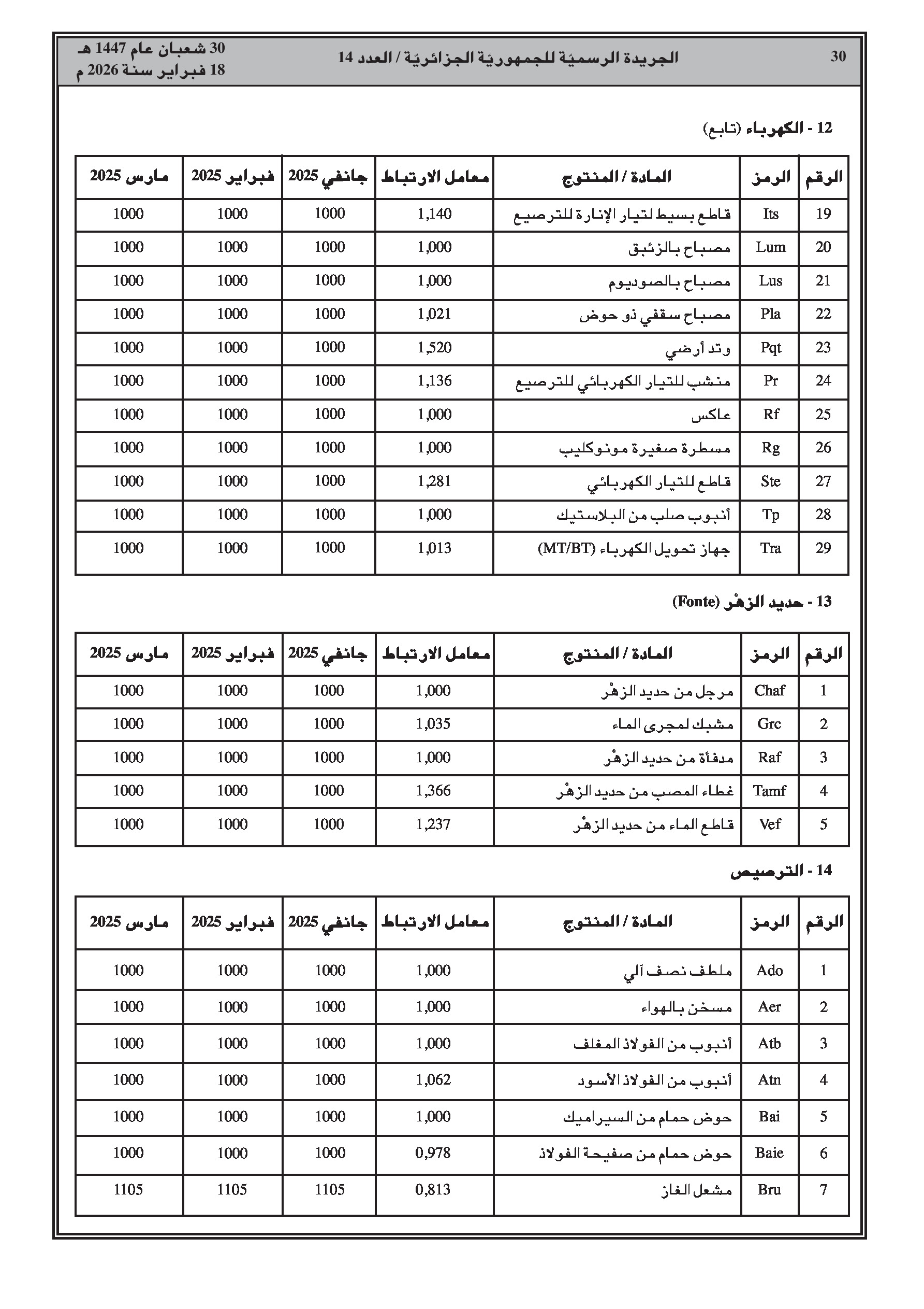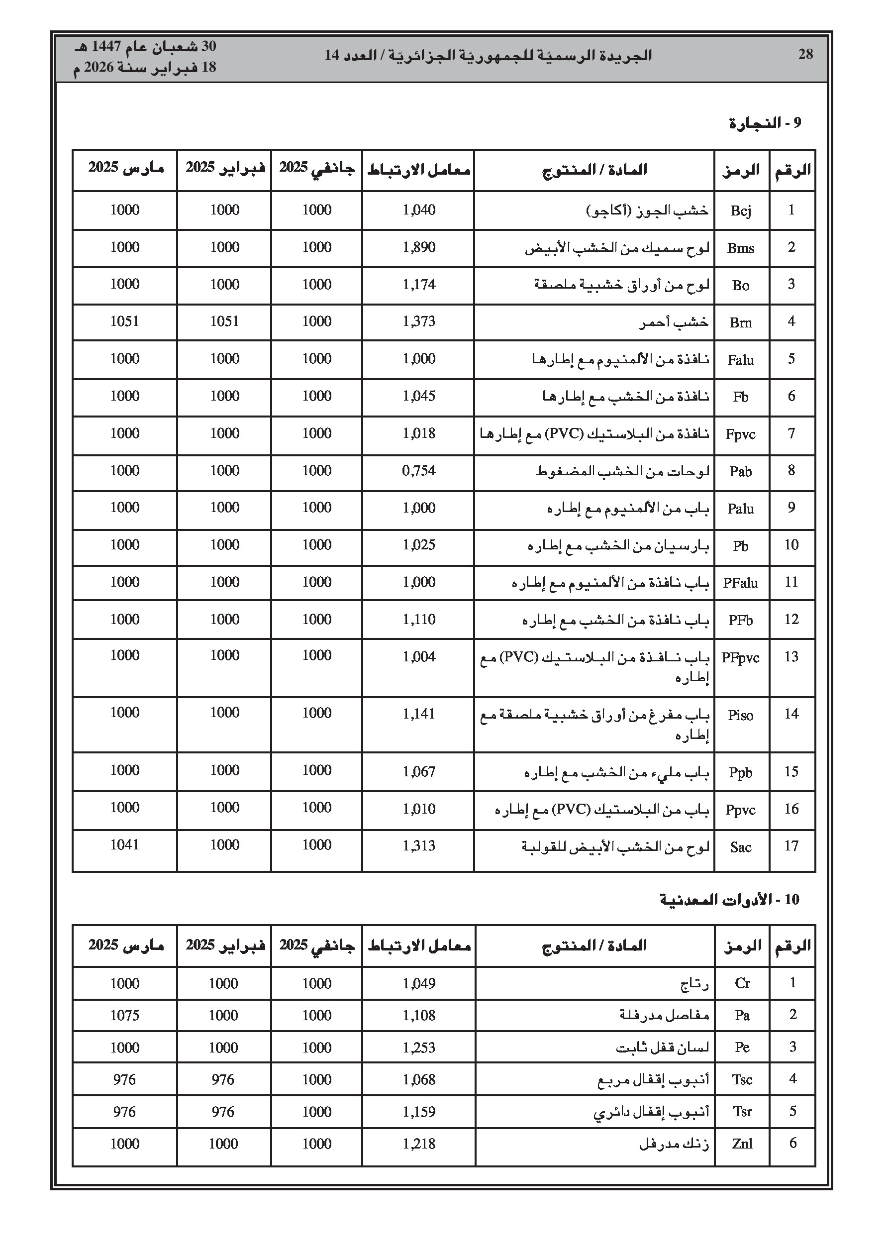 تتضمن جداول مفصلة لمؤشرات الأجور، الإسمنت، الحديد، النقل، والمواد المختلفة للثلاثي الأول من سنة 2025.