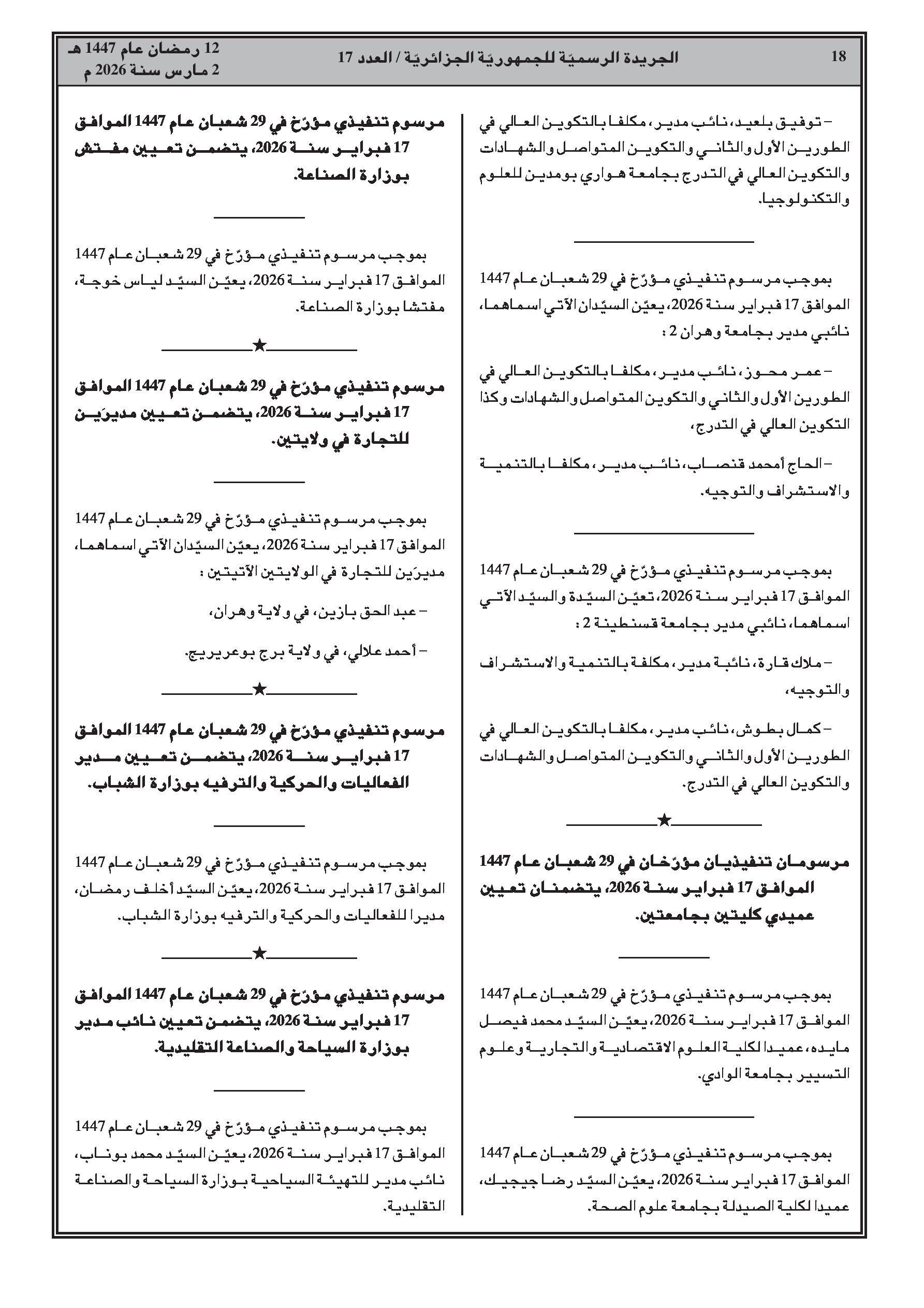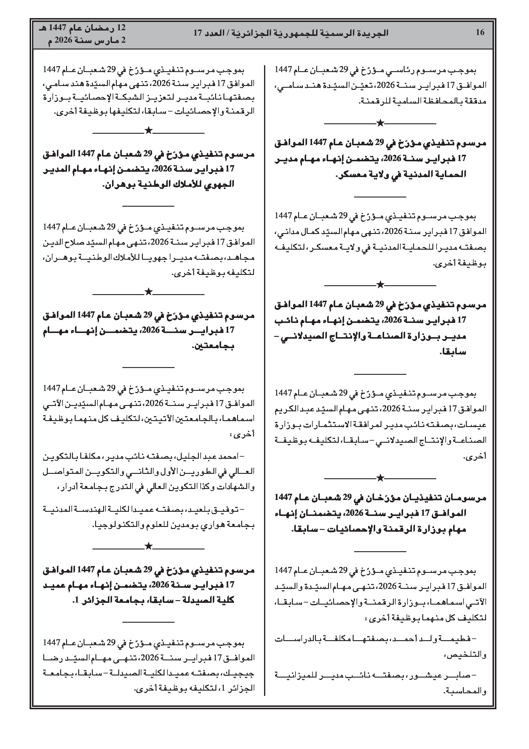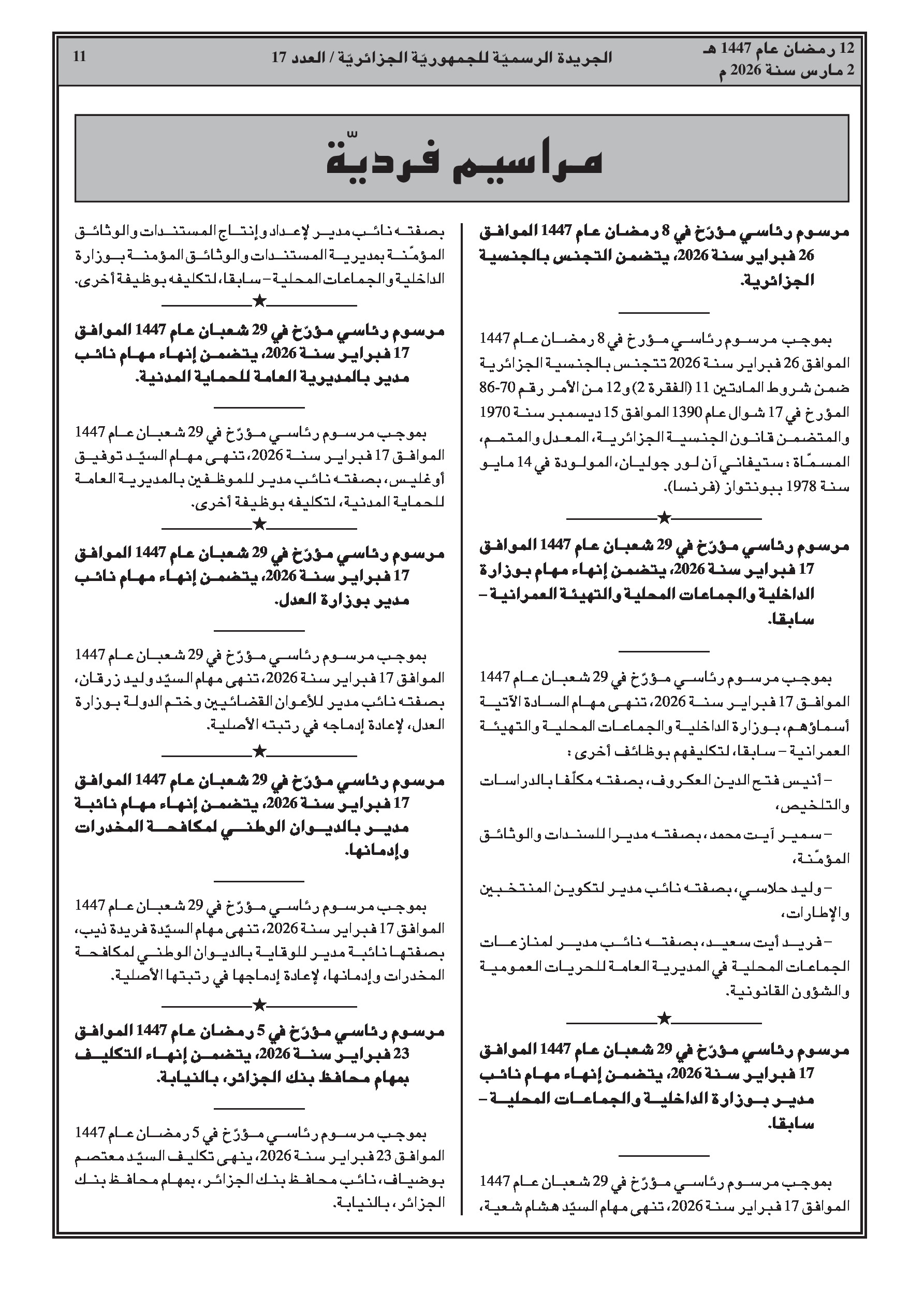 تعيين محمد الأمين لعقاب محافظاً لبنك الجزائر؛ تعيينات في المجلس الاقتصادي والاجتماعي والبيئي؛ تعيينات في التعليم العالي (نواب مدراء وعمداء)؛ منح الجنسية الجزائرية لشخص واحد.