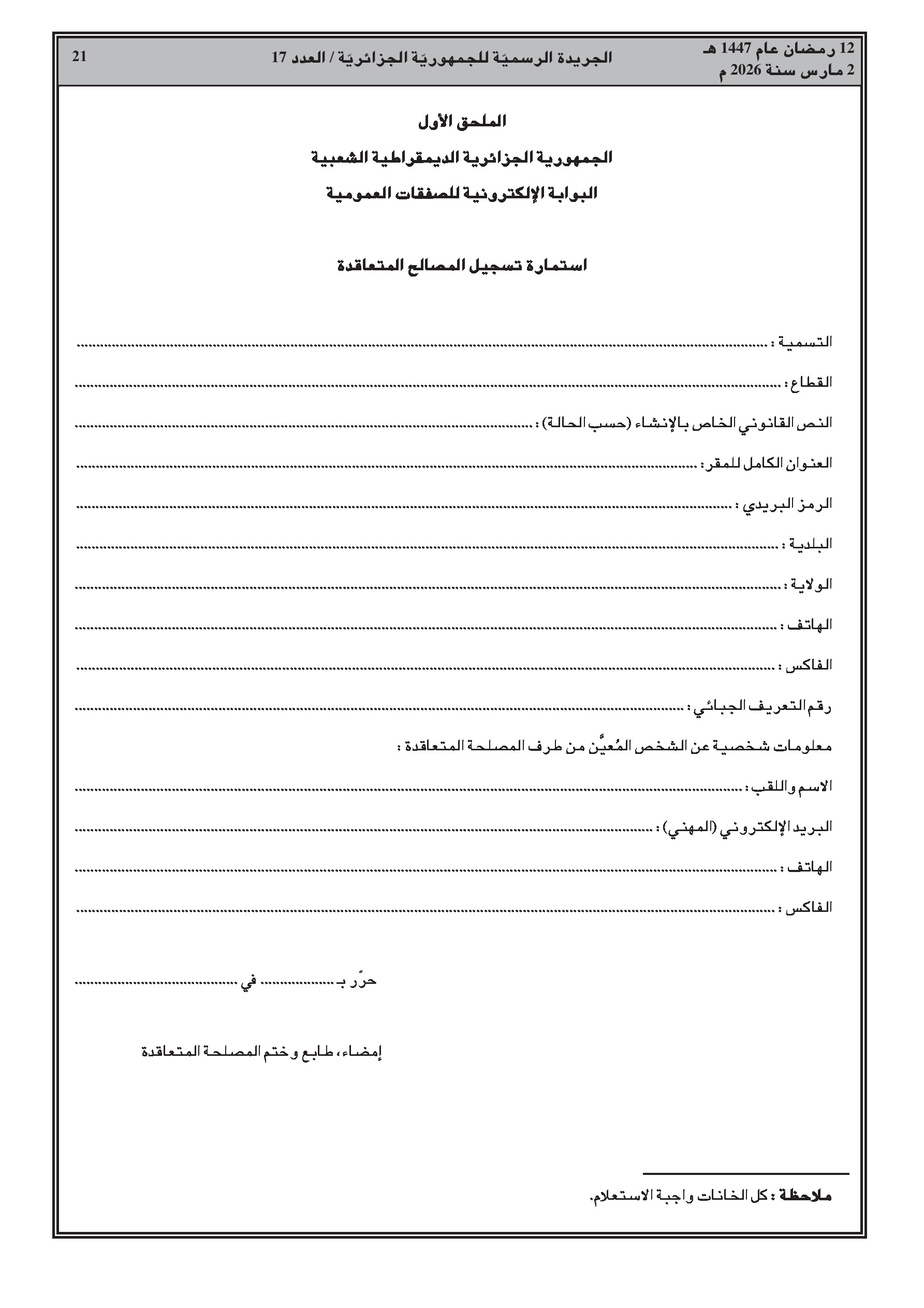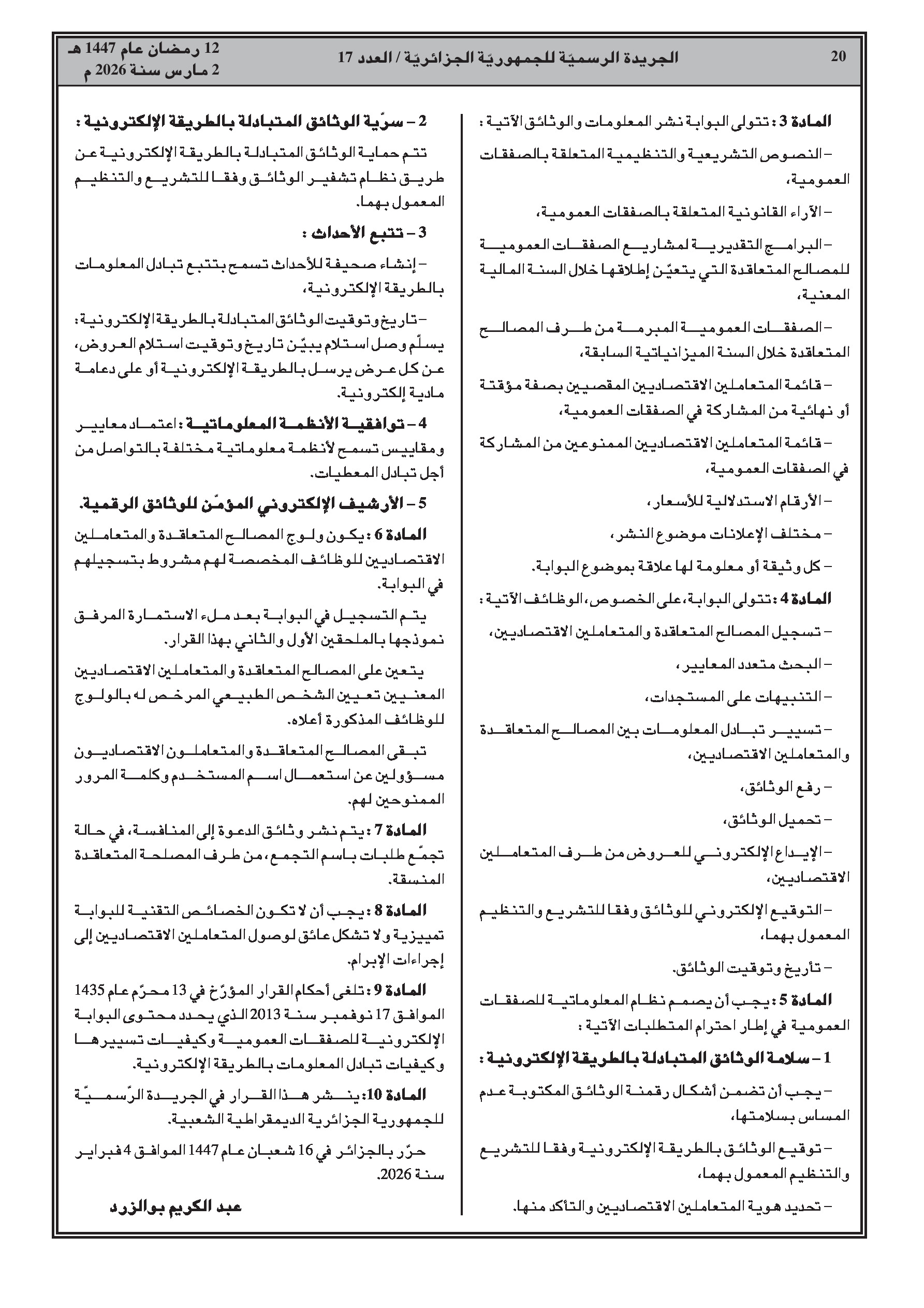 قرار يحدد محتوى وكيفية تسيير البوابة الرقمية المخصصة لنشر وإدارة الصفقات العمومية.