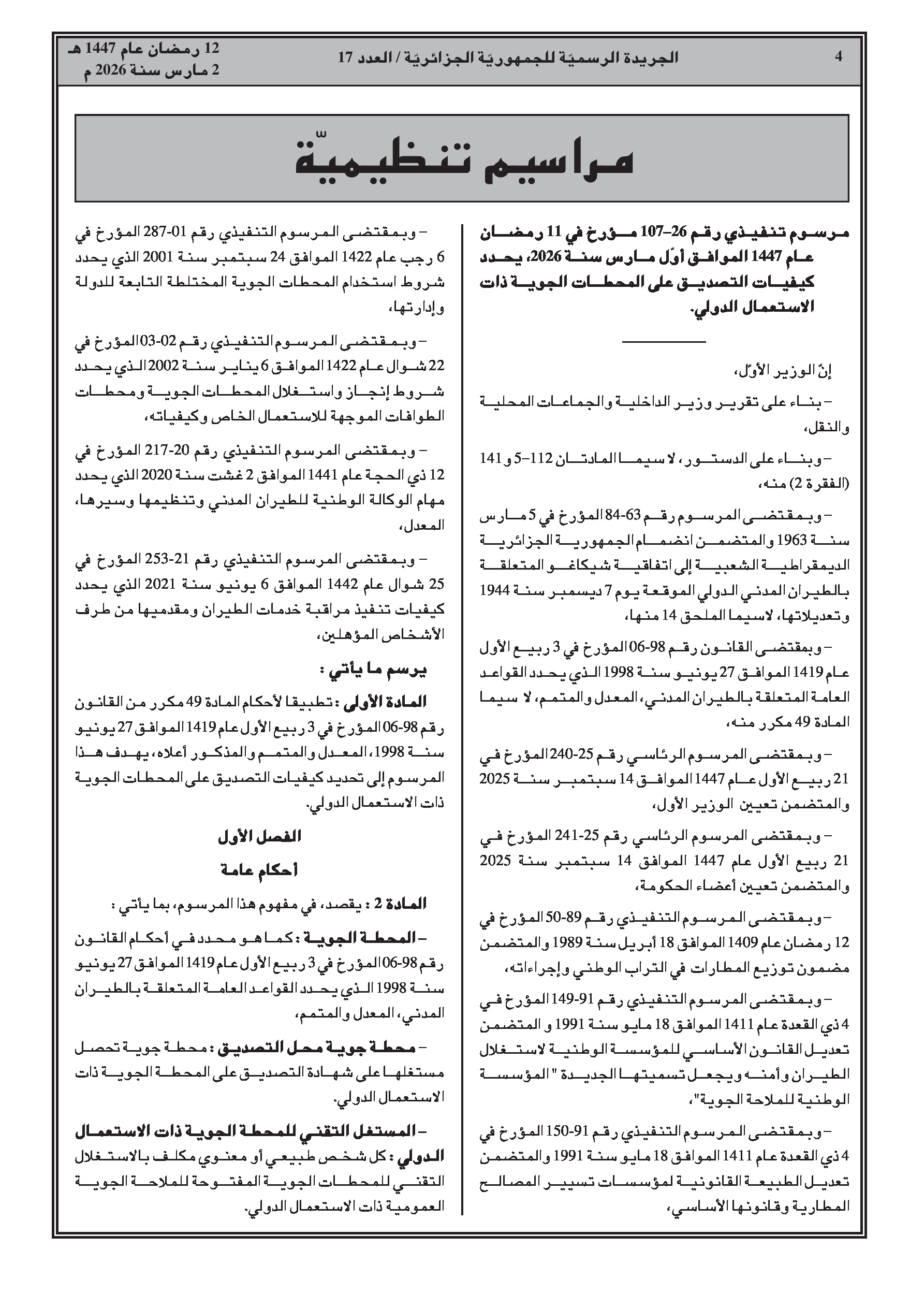 مرسوم تنفيذي يحدد القواعد الجديدة لترخيص المطارات المفتوحة للحركة الجوية الدولية لضمان السلامة.