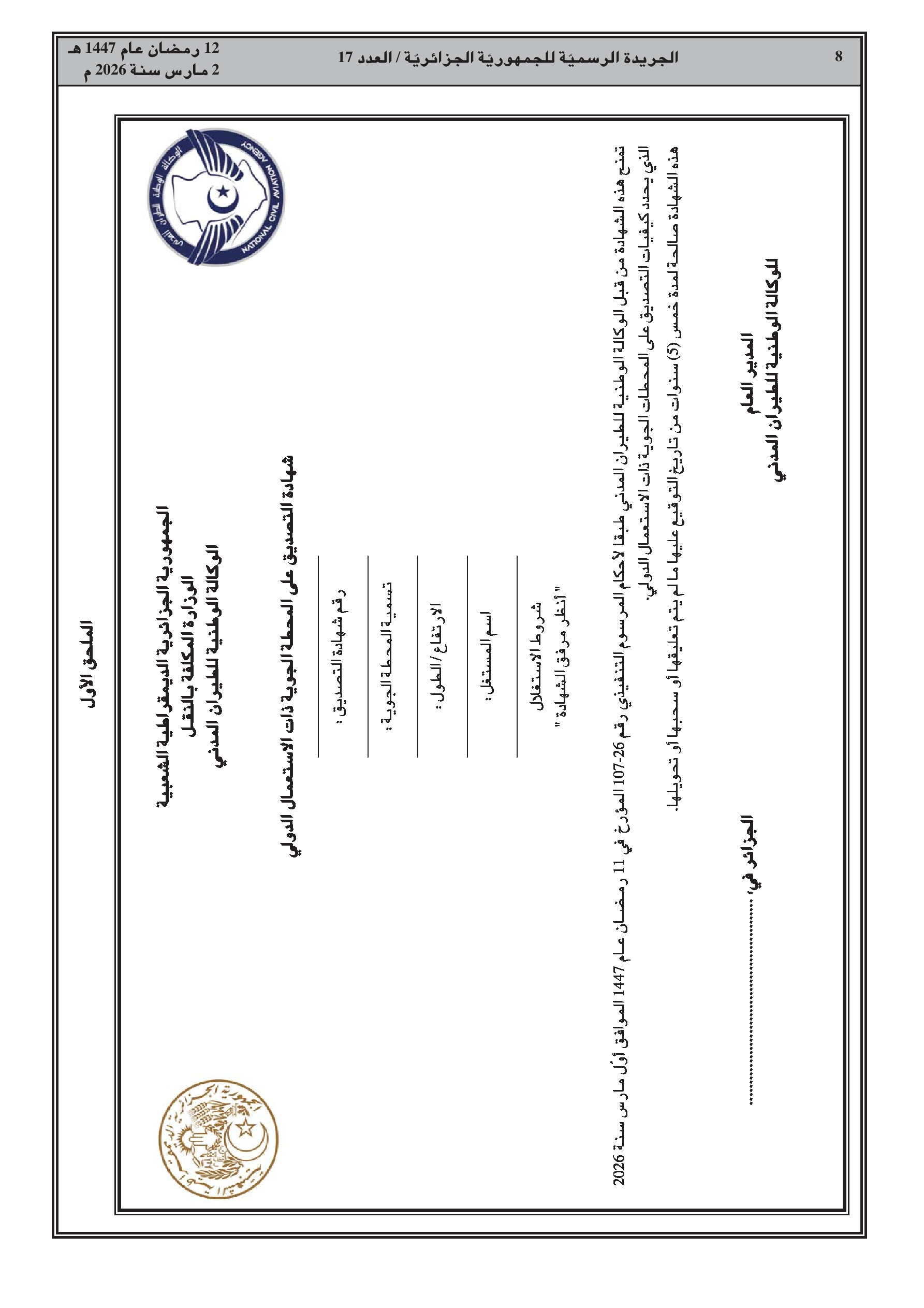 تُسلم الشهادة من الوكالة الوطنية للطيران المدني لمدة 5 سنوات قابلة للتجديد؛ إلزامية نظام إدارة السلامة (SGS)؛ تحديد مواصفات دليل المطار.