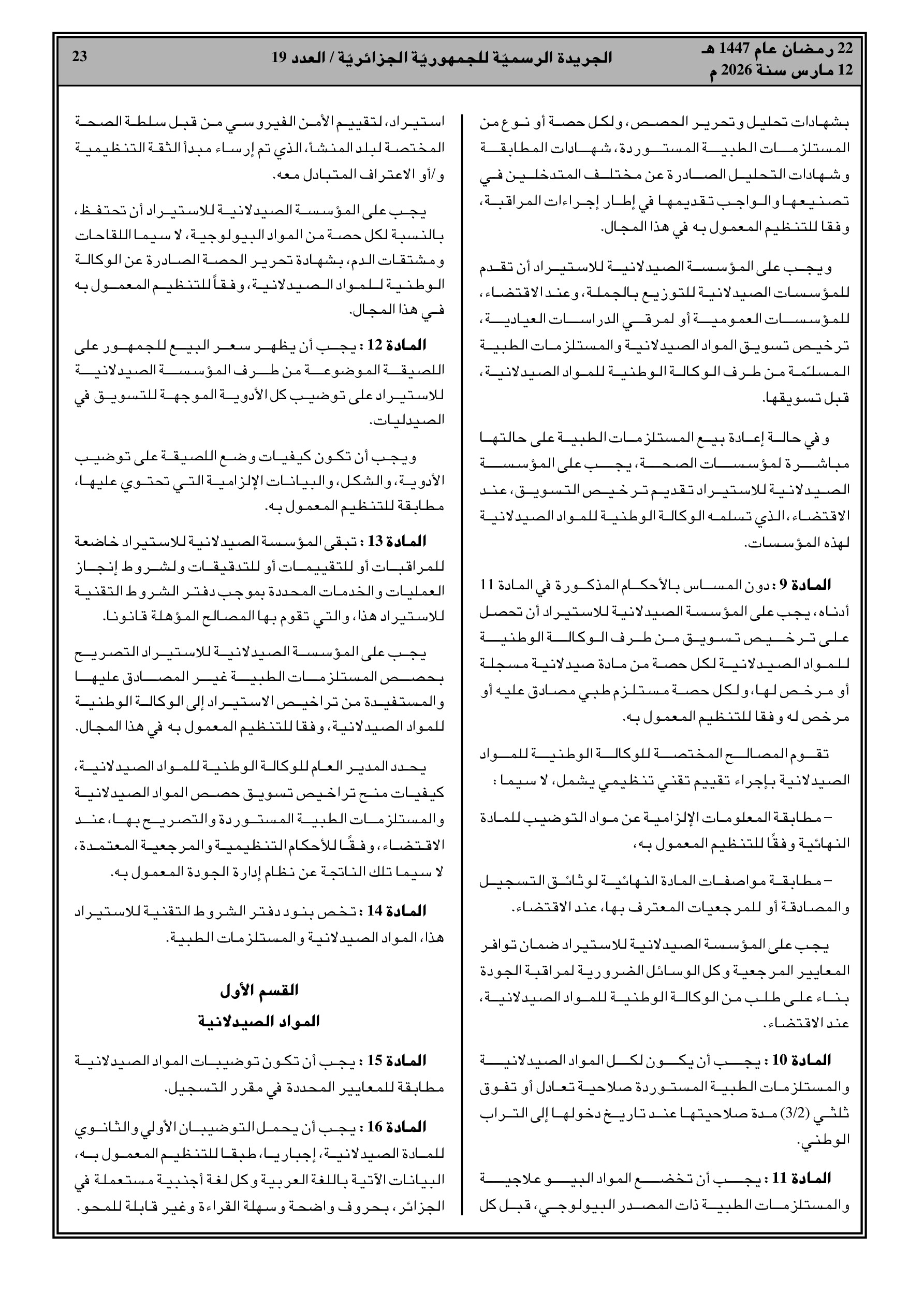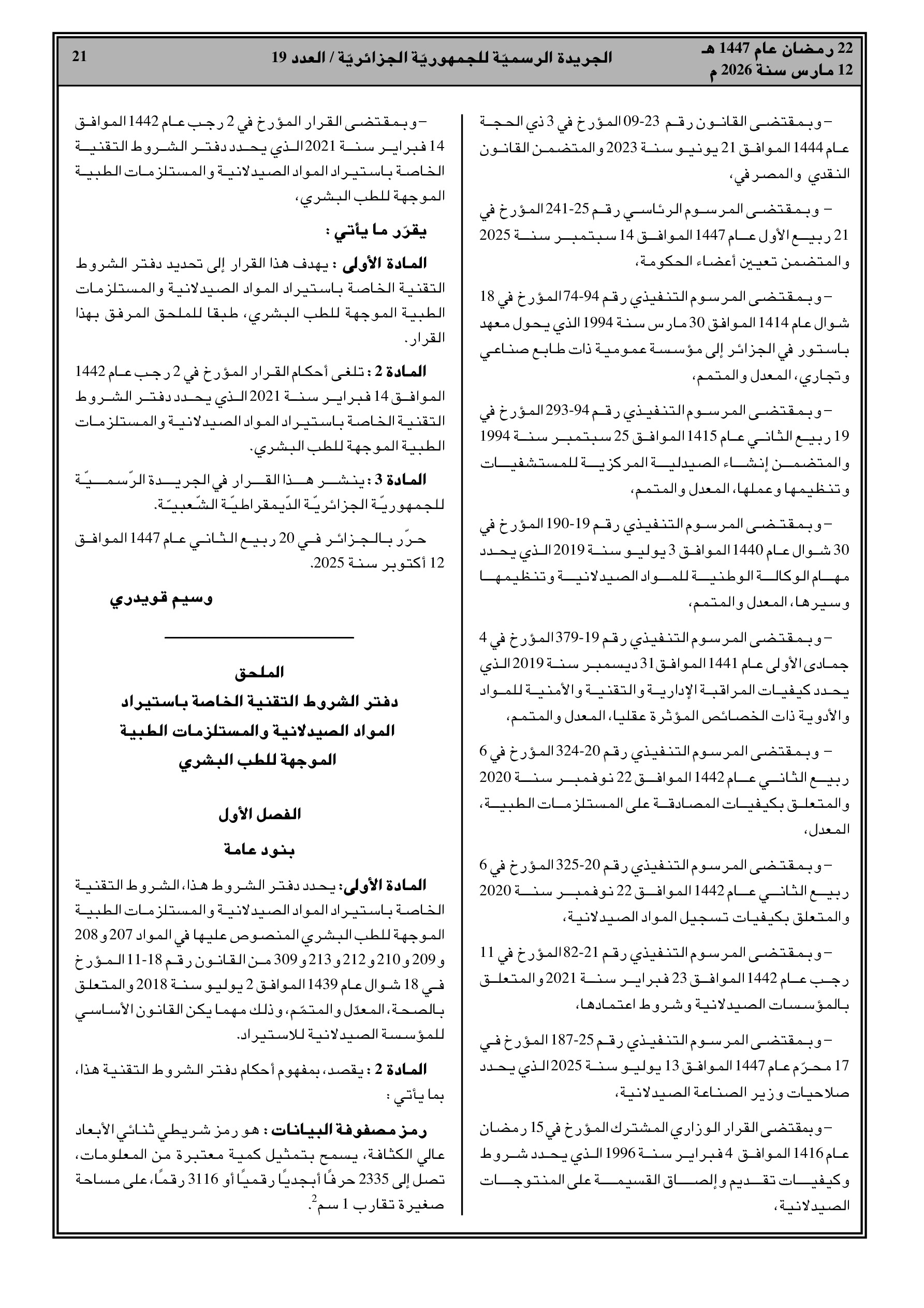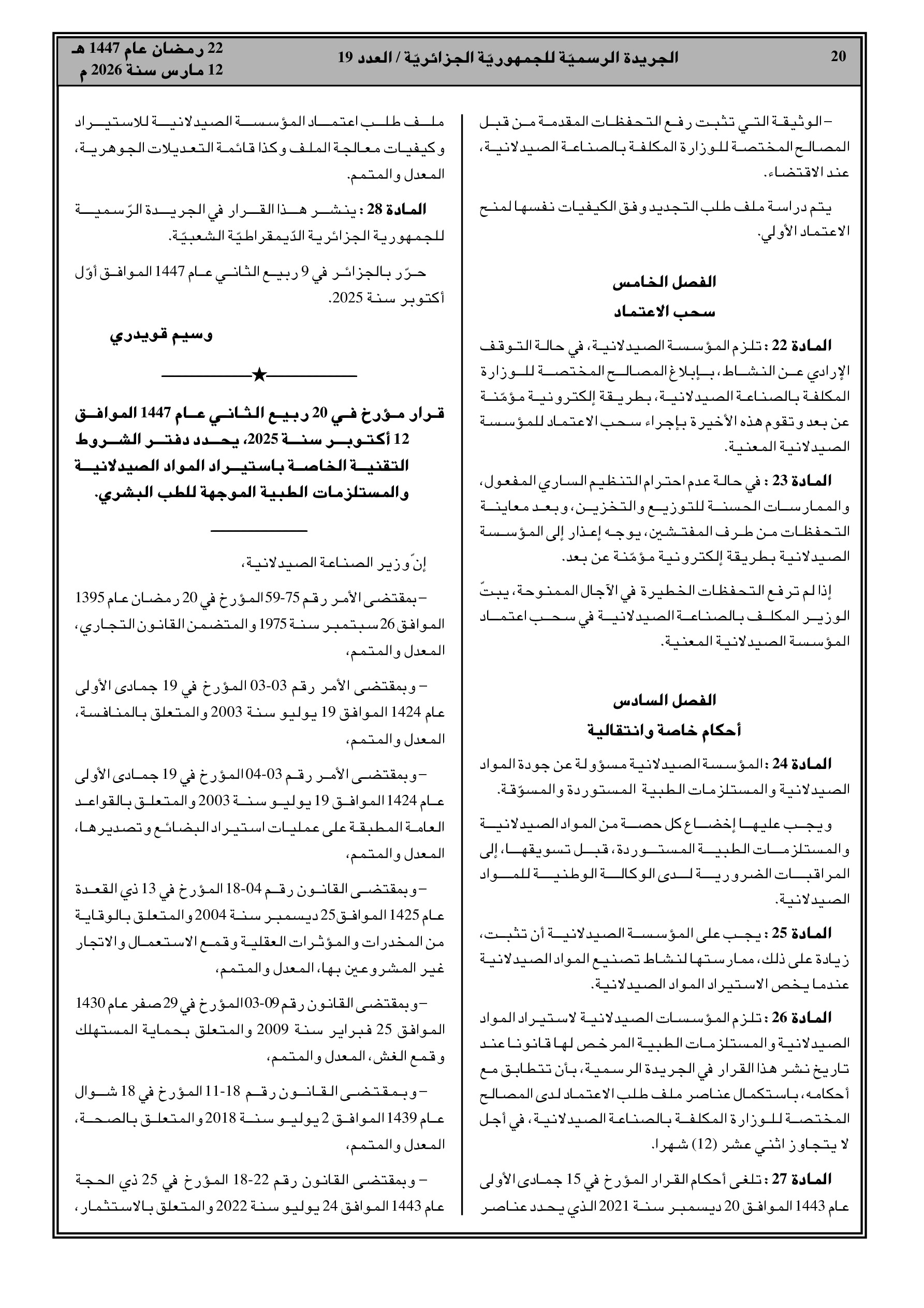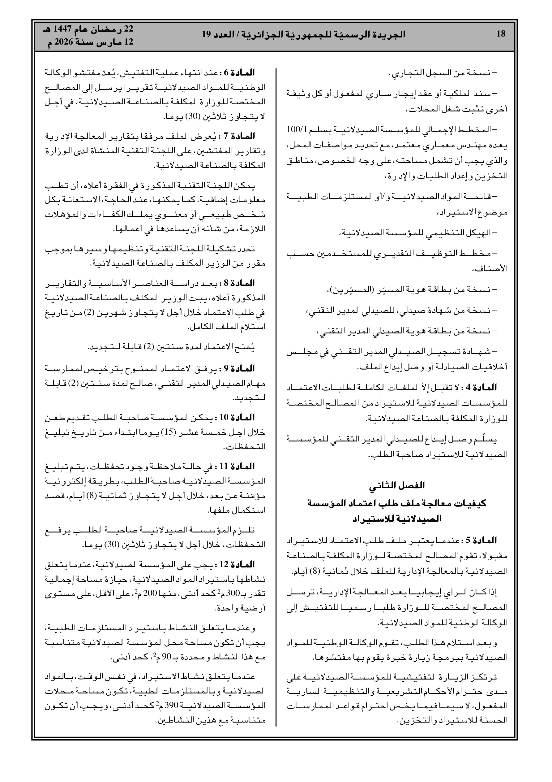 تحديد الشروط التقنية الجديدة وملفات الاعتماد لمؤسسات استيراد واستغلال المواد الصيدلانية والمستلزمات الطبية.