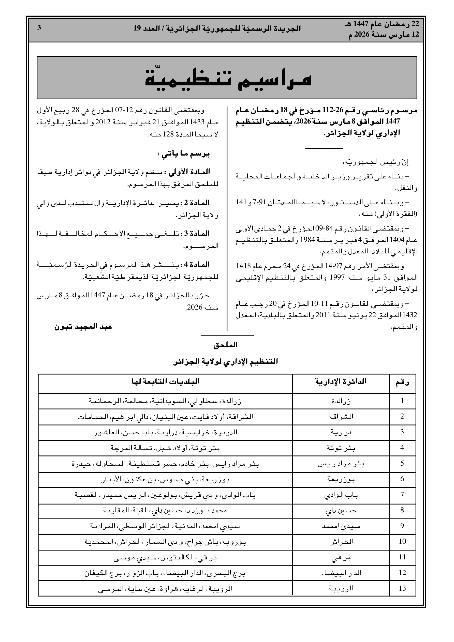 مرسوم رئاسي يعيد تحديد المقاطعات الإدارية للعاصمة والبلديات التابعة لها.