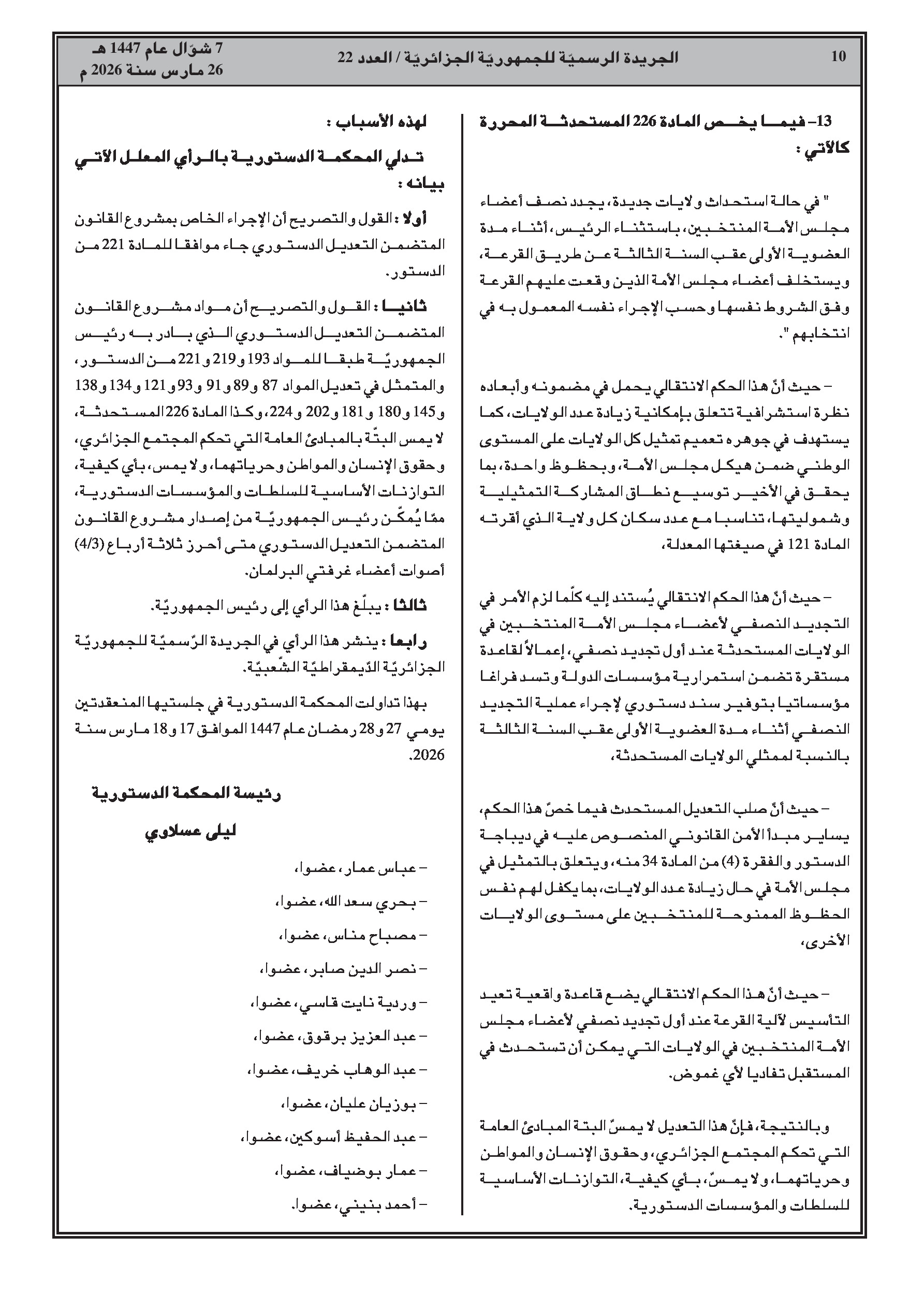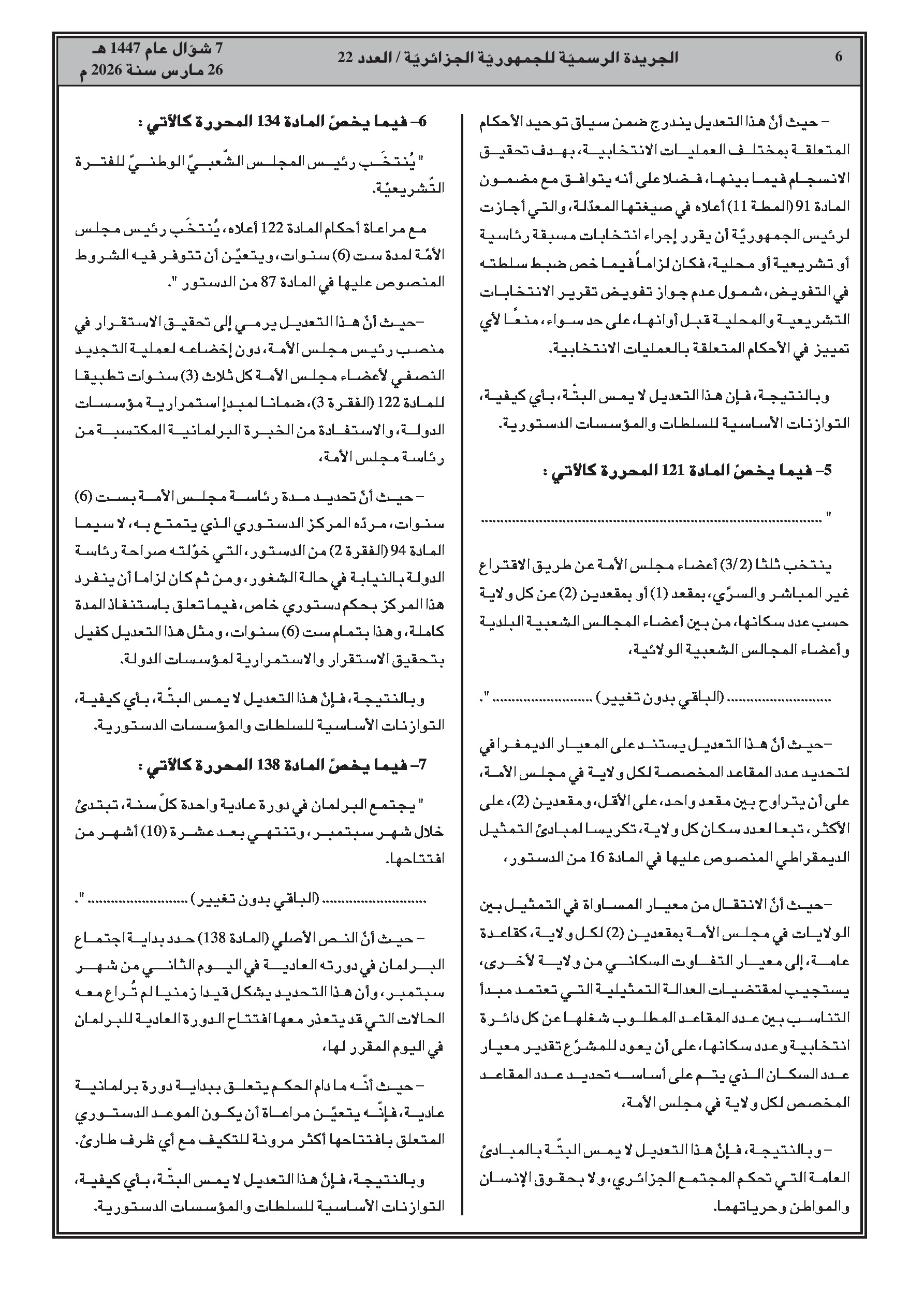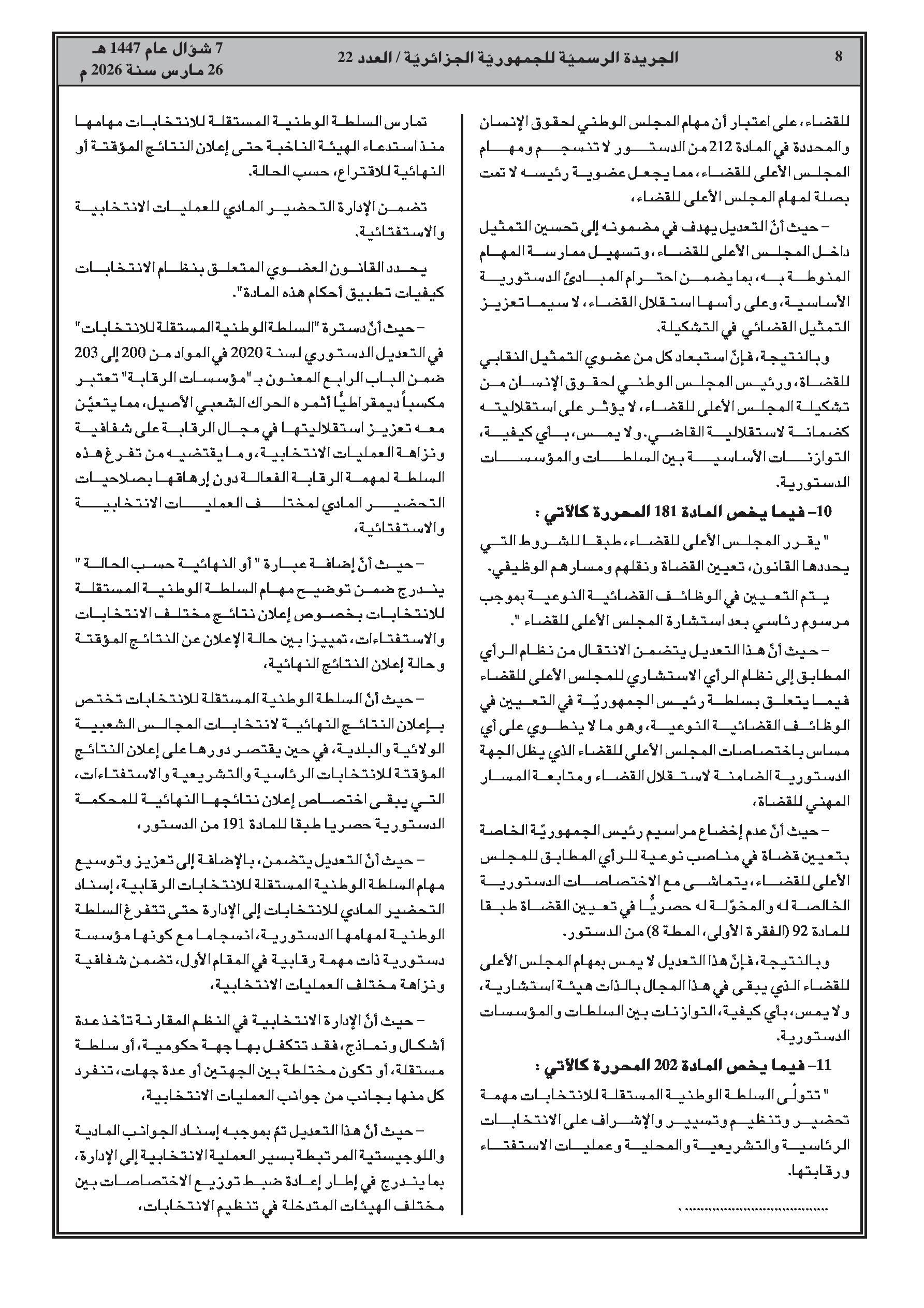 - تعديل تشكيلة المجلس الأعلى للقضاء ومجلس الأمة.