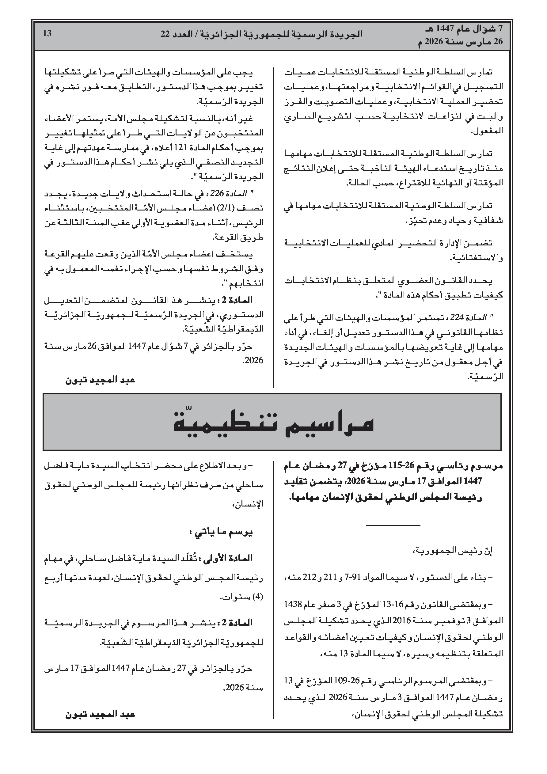 مراسيم رئاسية لاستدعاء البرلمان بغرفتيه، وتنصيب رئيسة المجلس الوطني لحقوق الإنسان، وتعيينات وإنهاء مهام في عدة وزارات وهيئات حكومية.
