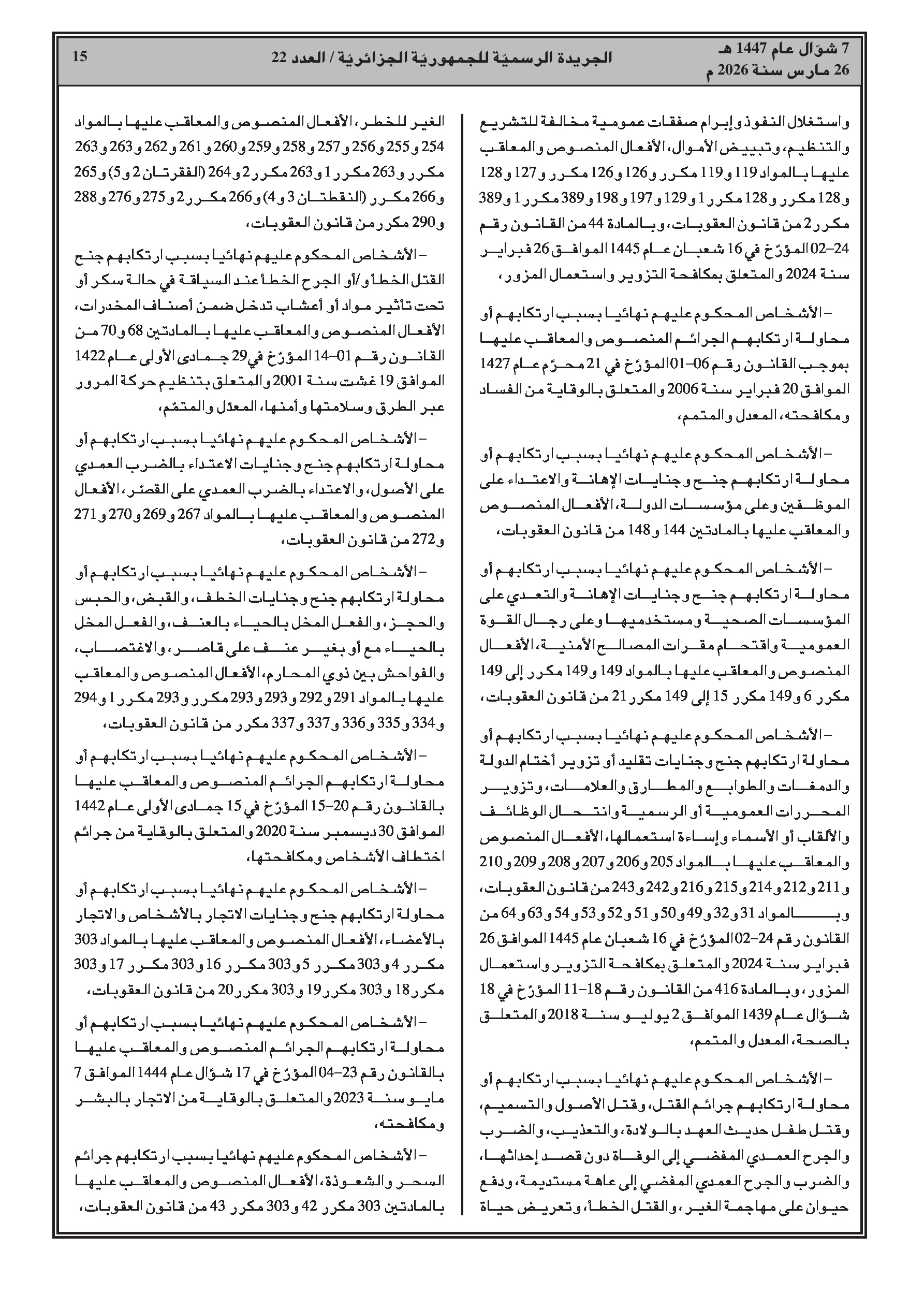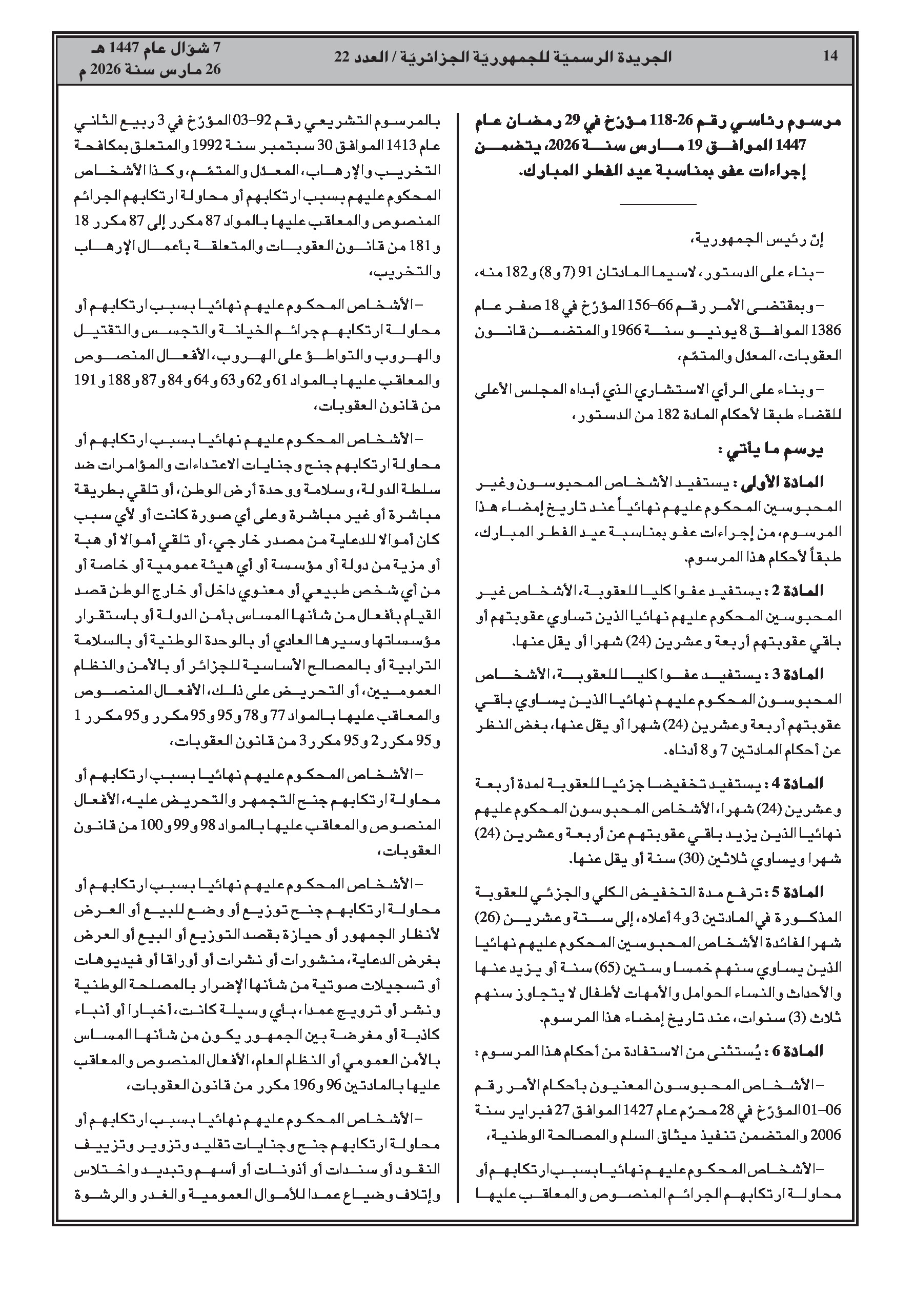 مرسوم رئاسي يتضمن تدابير عفو لصالح الأشخاص المحبوسين وغير المحبوسين المحكوم عليهم نهائيا بمناسبة عيد الفطر المبارك، مع استثناء المدانين في جرائم خطيرة محددة.