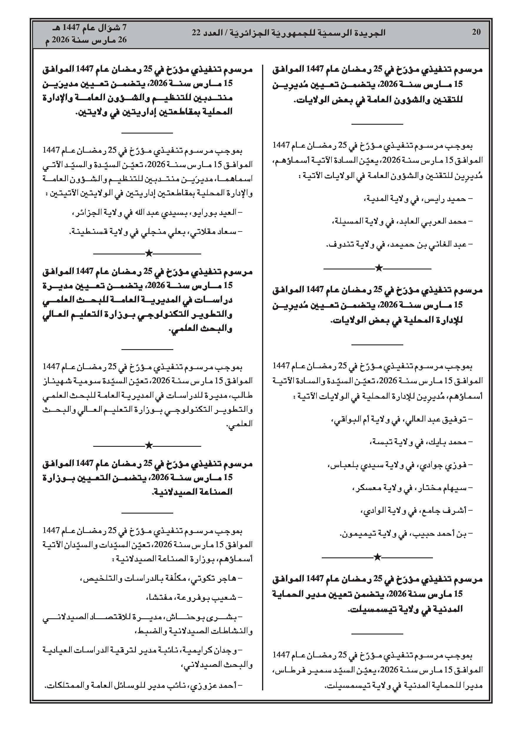 - حركية وتعيينات لمفتشين ومدراء في الإدارات المحلية ومختلف الوزارات.