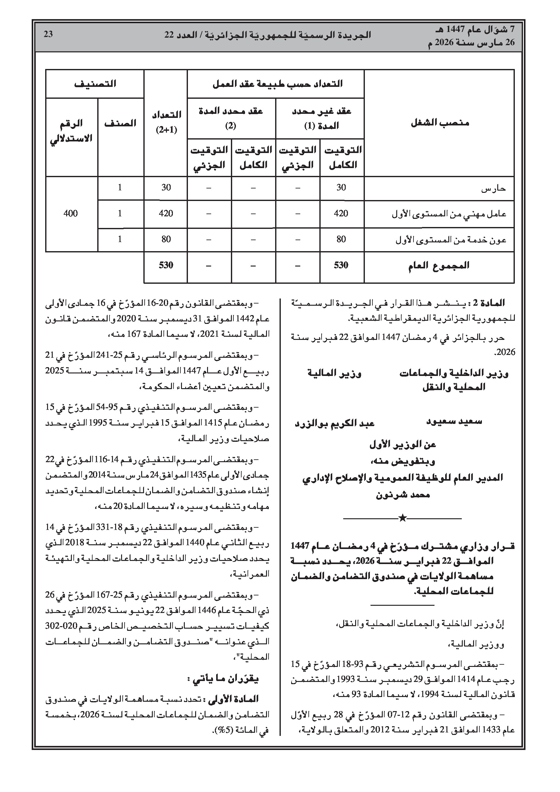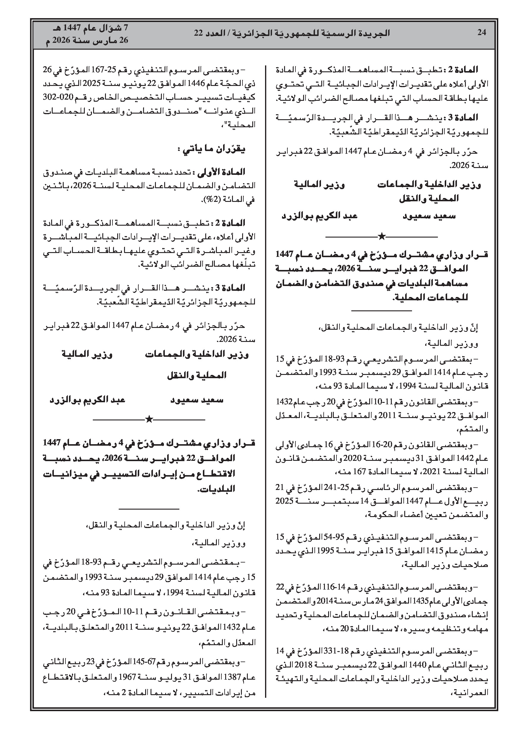 - تحديد نسب مساهمة البلديات والولايات في صندوق التضامن والضمان للجماعات المحلية لسنة 2026.