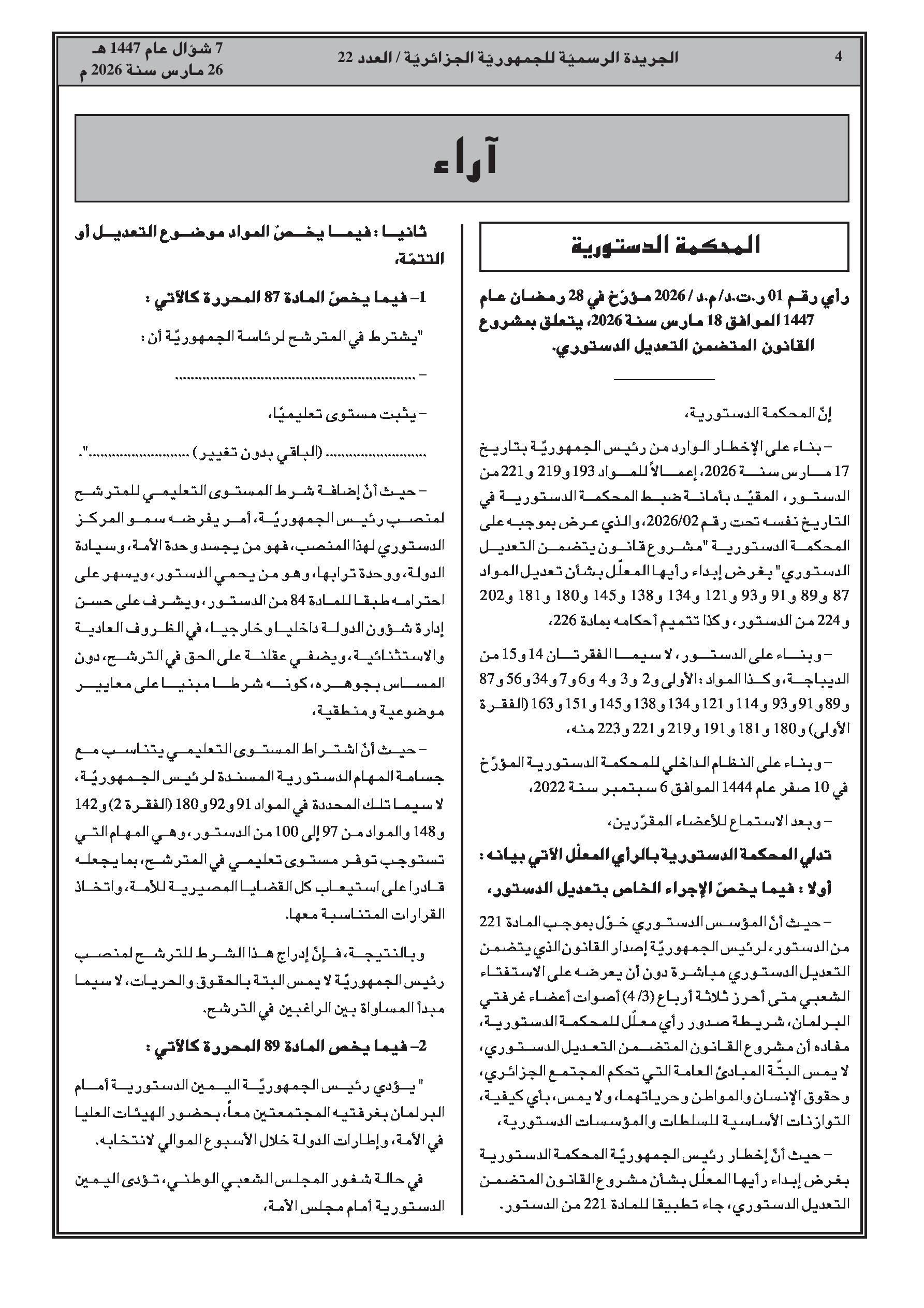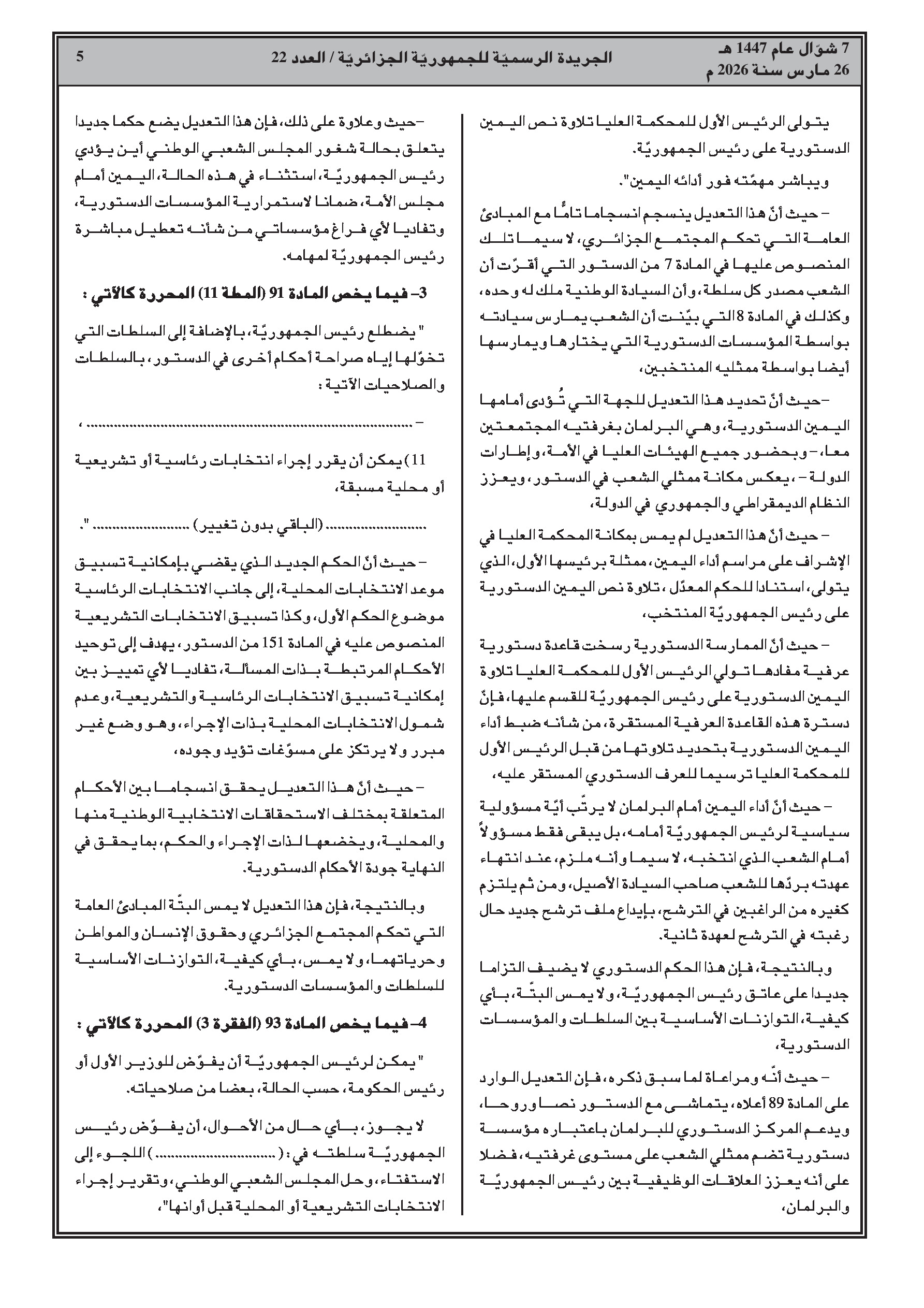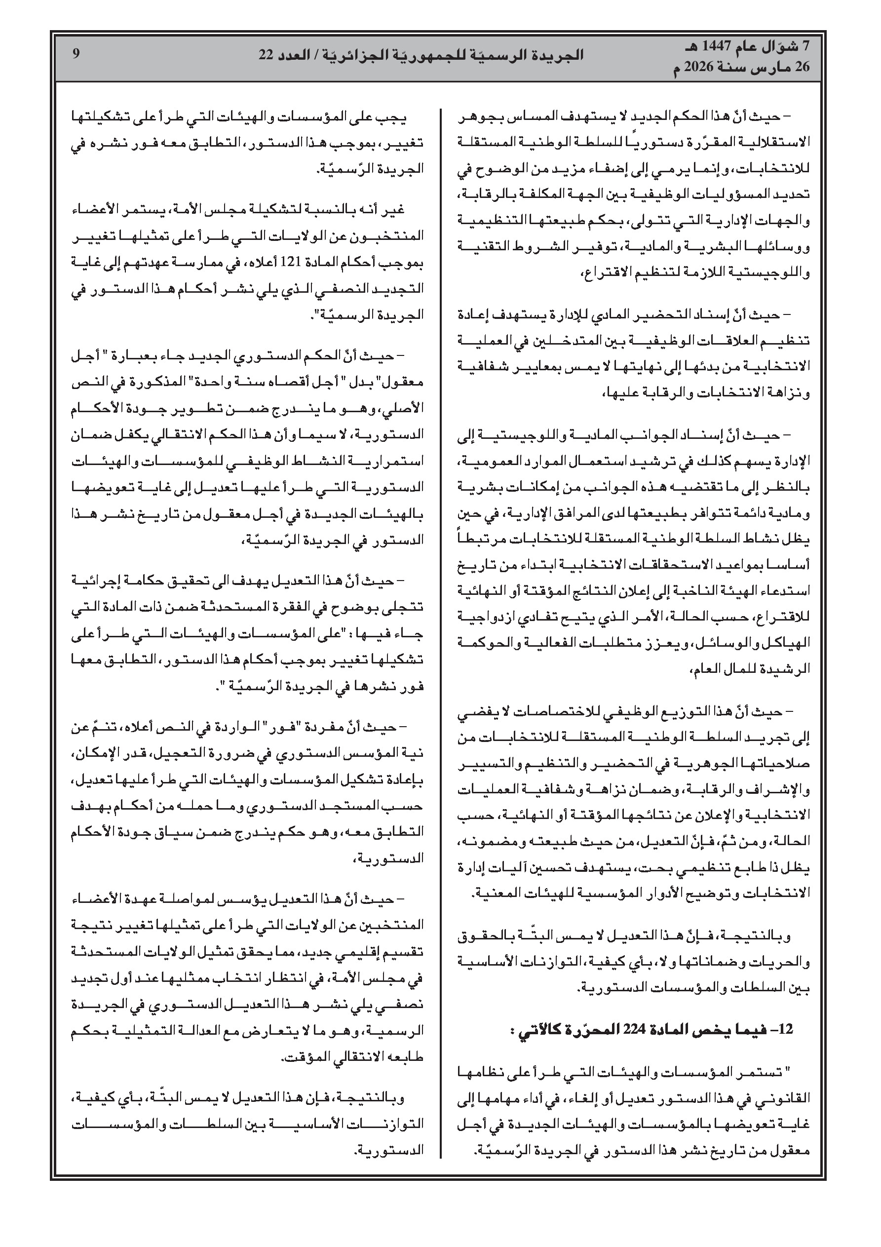 صدور القانون المتعلق بالتعديل الدستوري بعد رأي المحكمة الدستورية، والذي يمس شروط الترشح للرئاسة وصلاحيات السلطة المستقلة للانتخابات والمجلس الأعلى للقضاء والبرلمان.