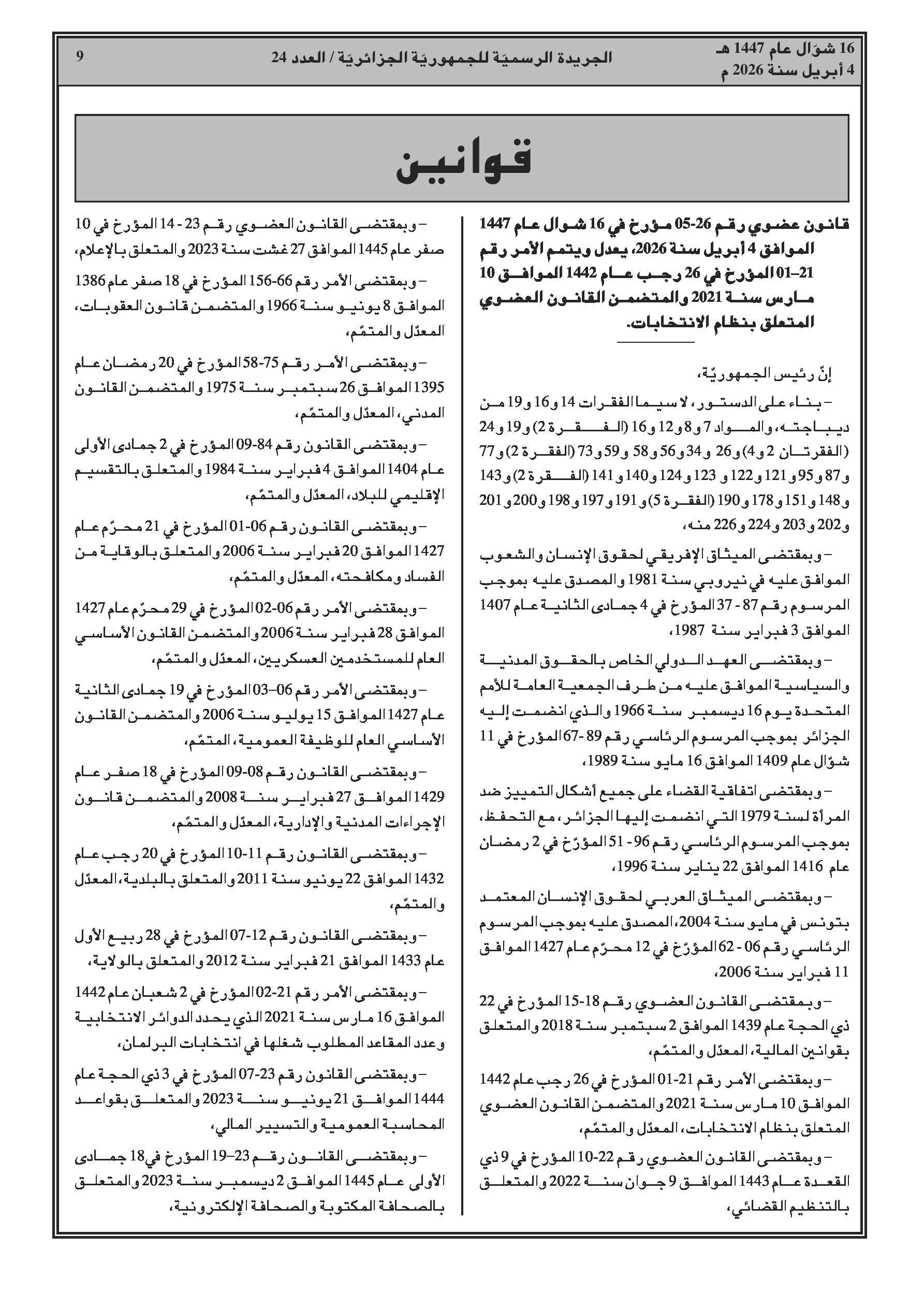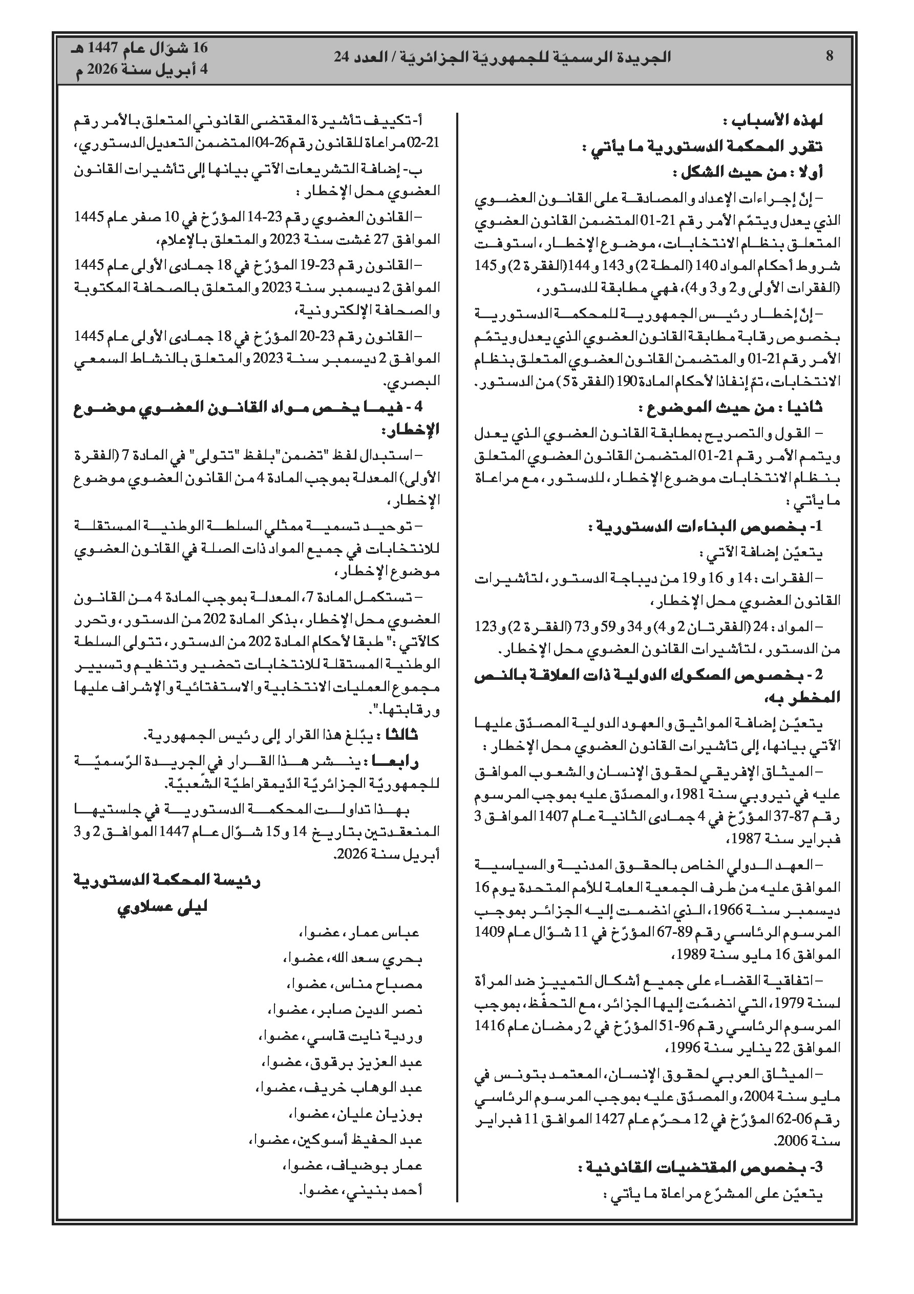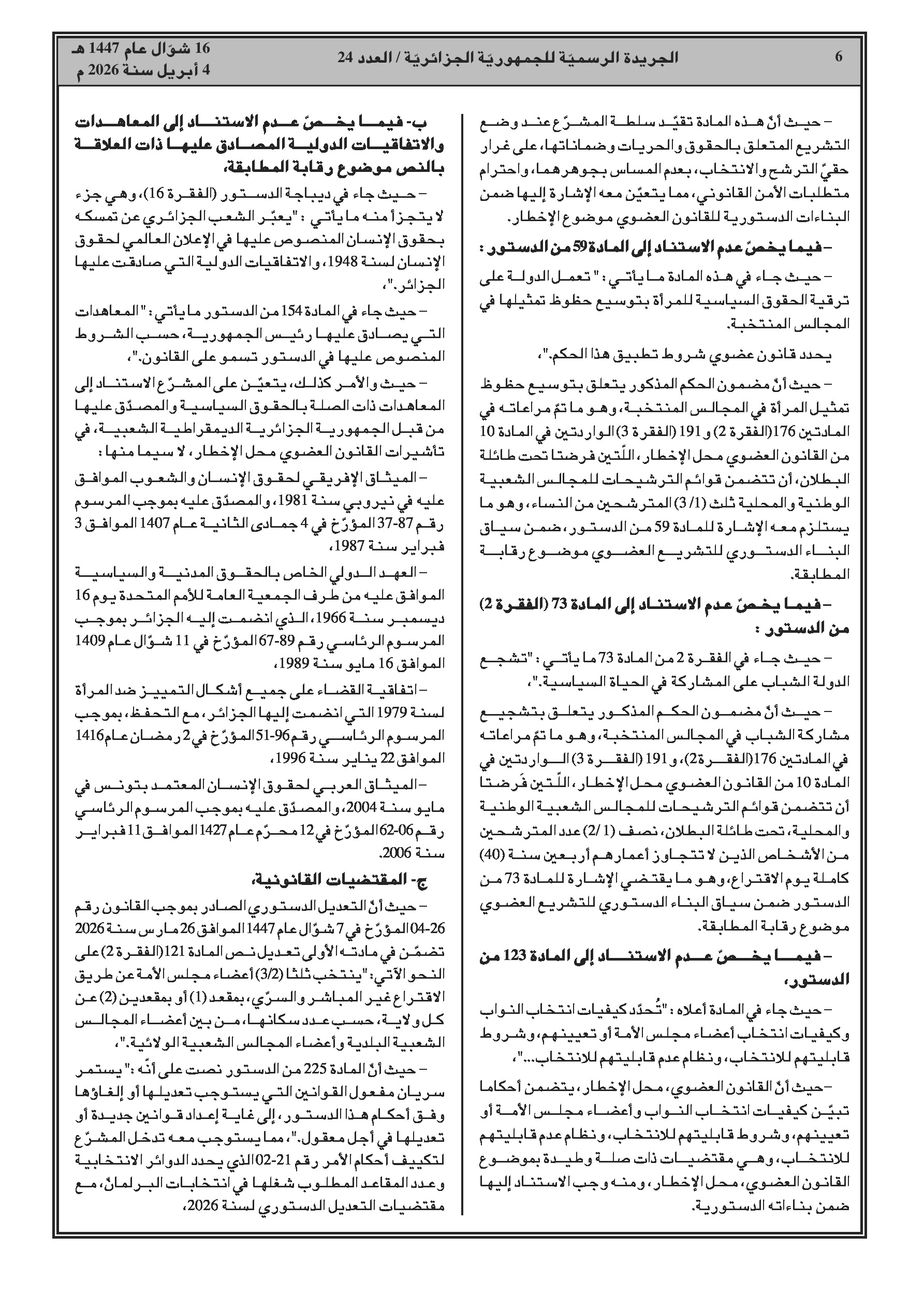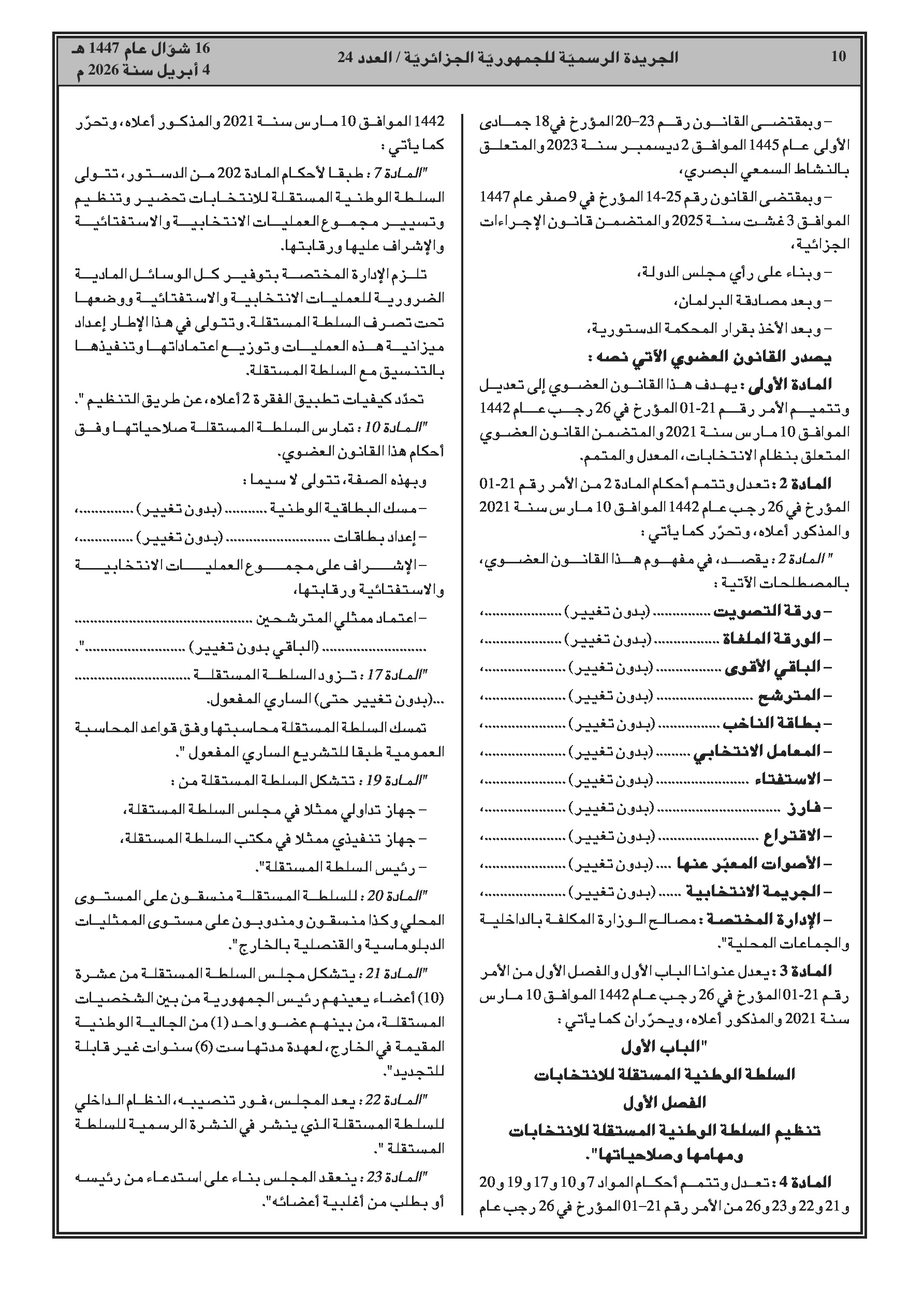 - المحكمة الدستورية تصادق على القانون العضوي المعدل للنظام الانتخابي. - القانون يعيد تنظيم السلطة الوطنية المستقلة للانتخابات وصلاحيات المنسقين. - شروط جديدة للترشح تشمل حصصاً للشباب والنساء والمستوى الجامعي. - تحديد 2 يوليو 2026 موعداً لإجراء الانتخابات التشريعية.