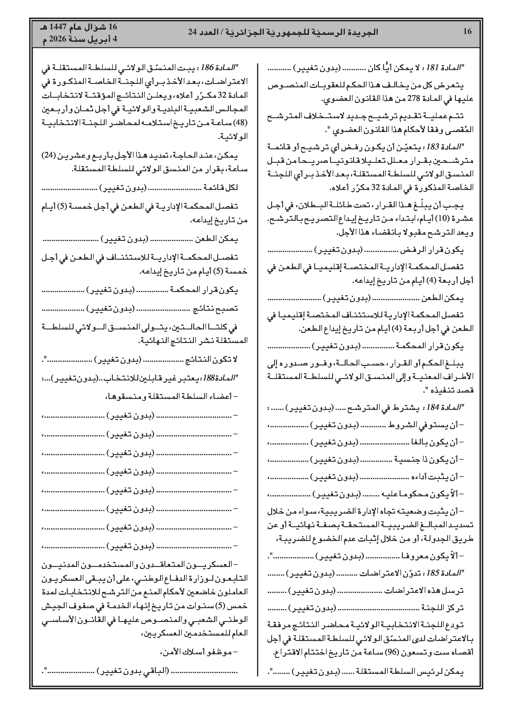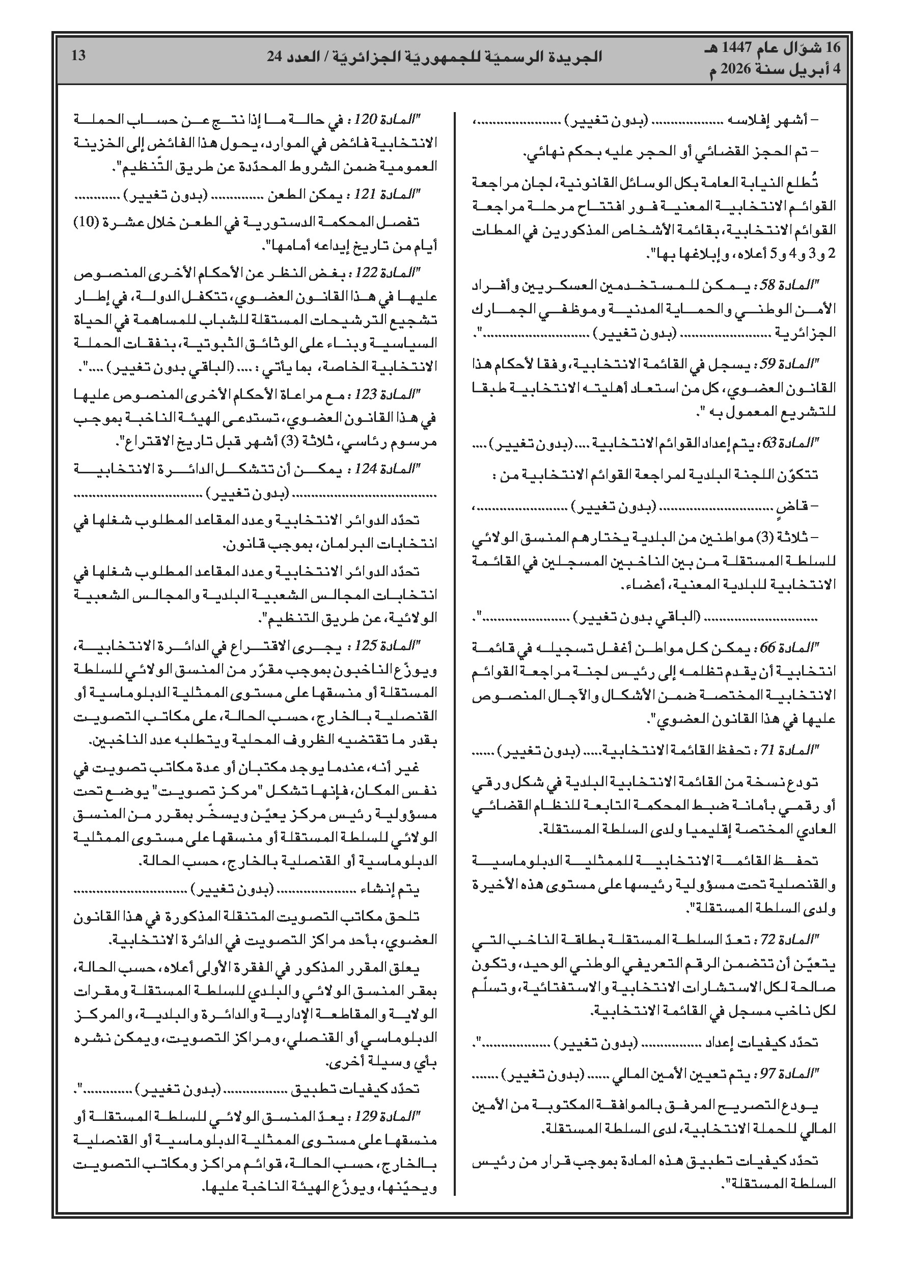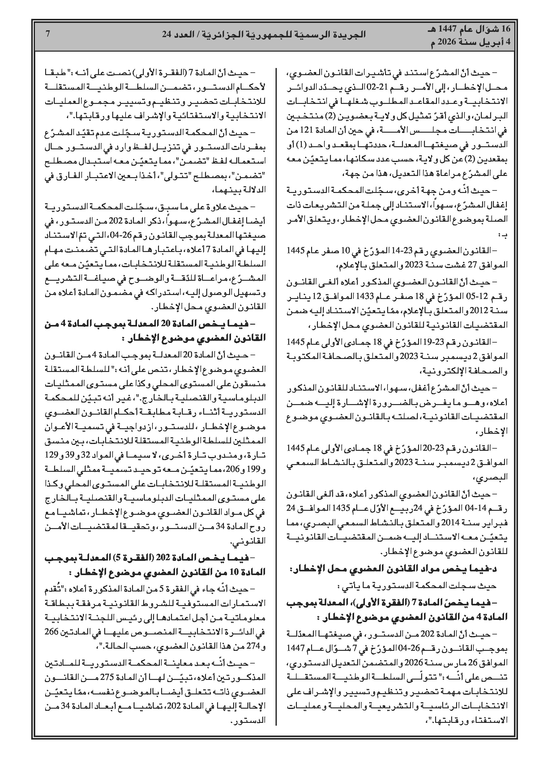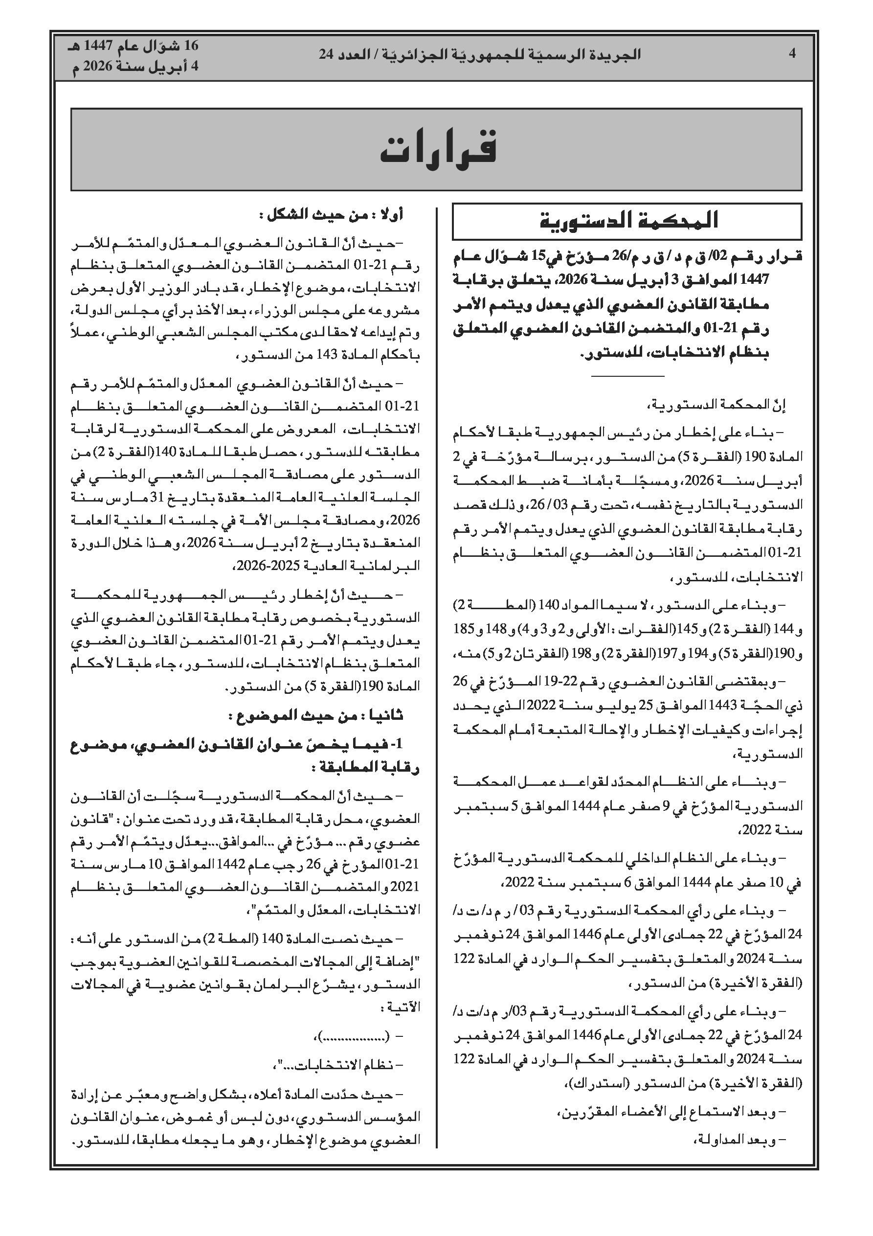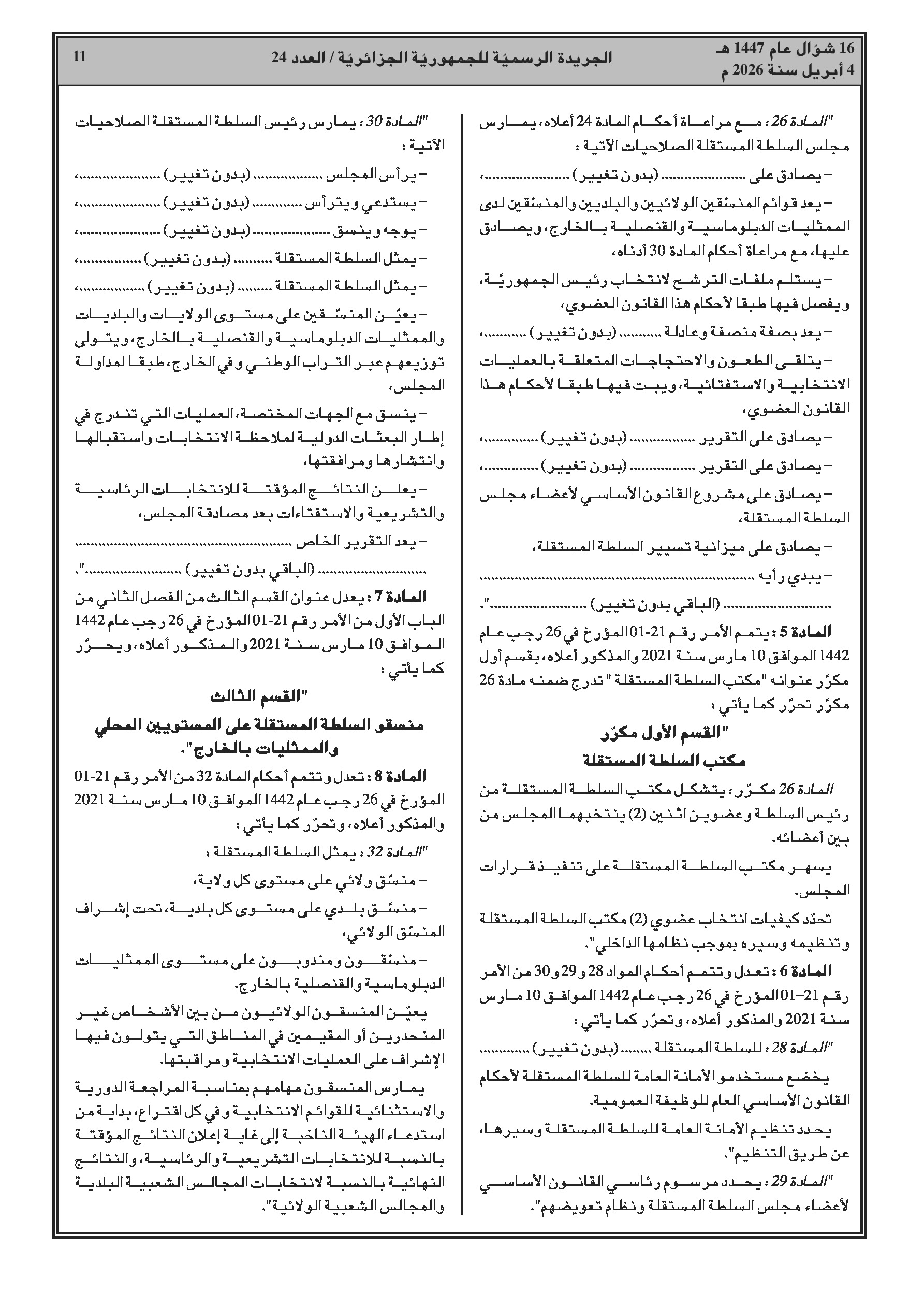 - المحكمة الدستورية تصادق على القانون العضوي المعدل للنظام الانتخابي. - القانون يعيد تنظيم السلطة الوطنية المستقلة للانتخابات وصلاحيات المنسقين. - شروط جديدة للترشح تشمل حصصاً للشباب والنساء والمستوى الجامعي. - تحديد 2 يوليو 2026 موعداً لإجراء الانتخابات التشريعية.