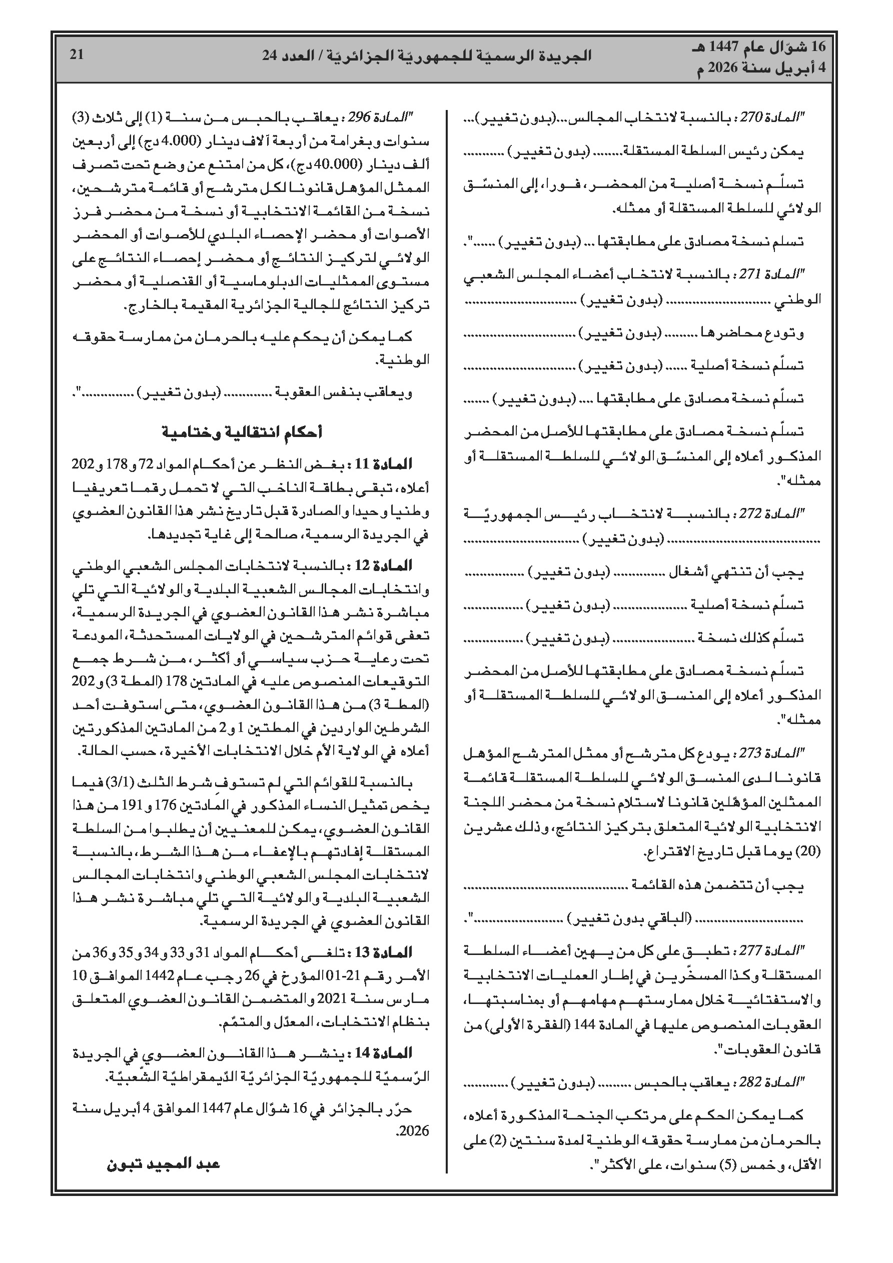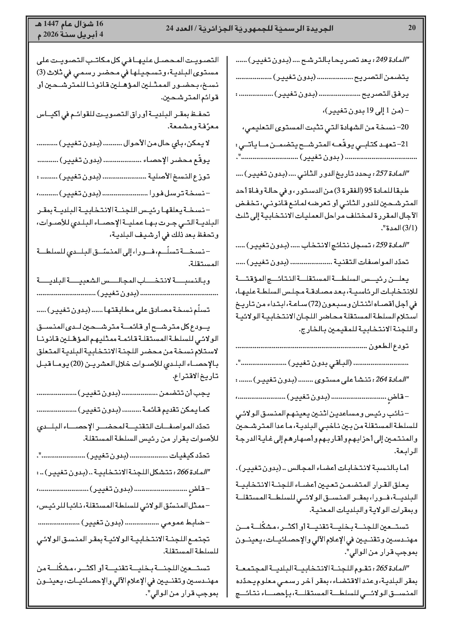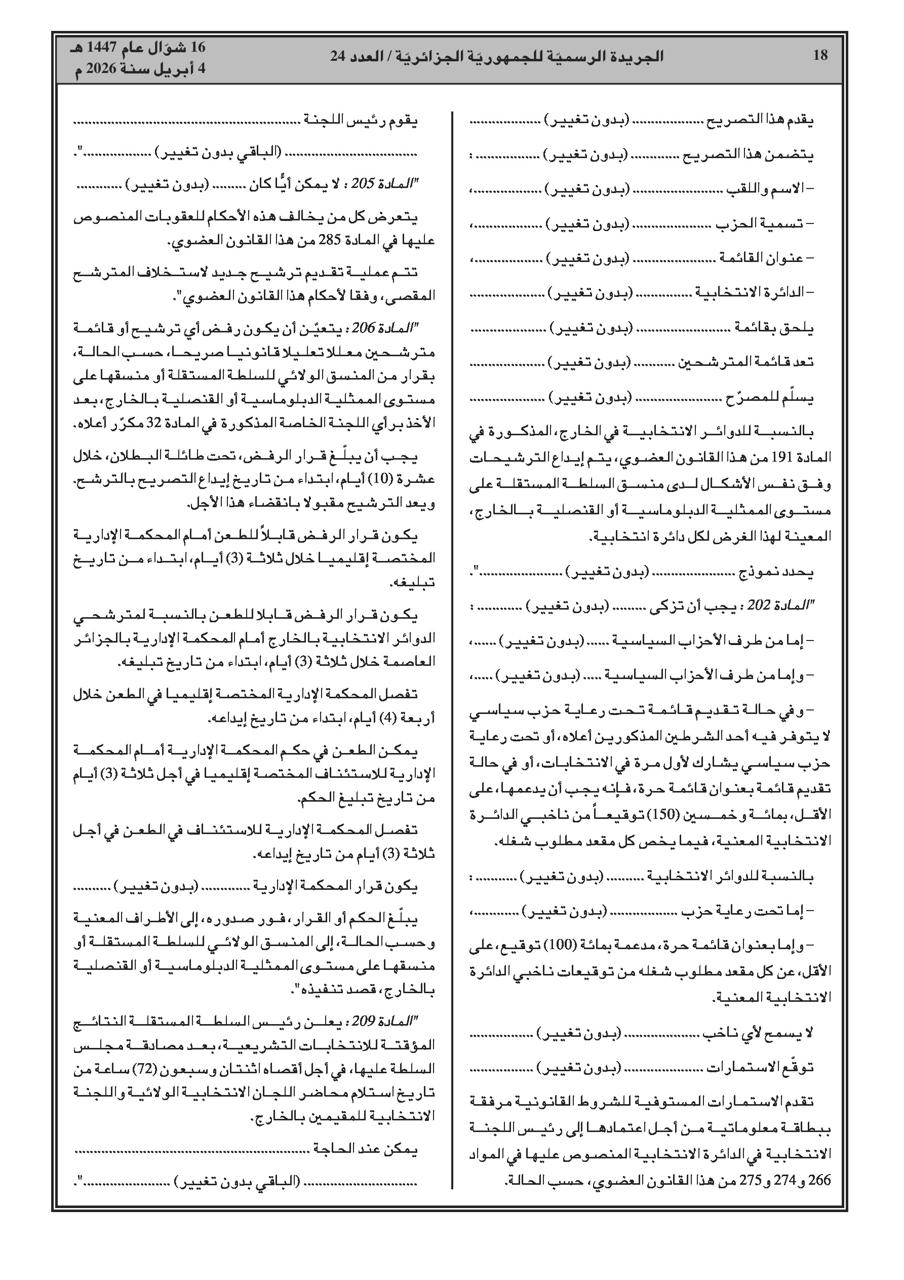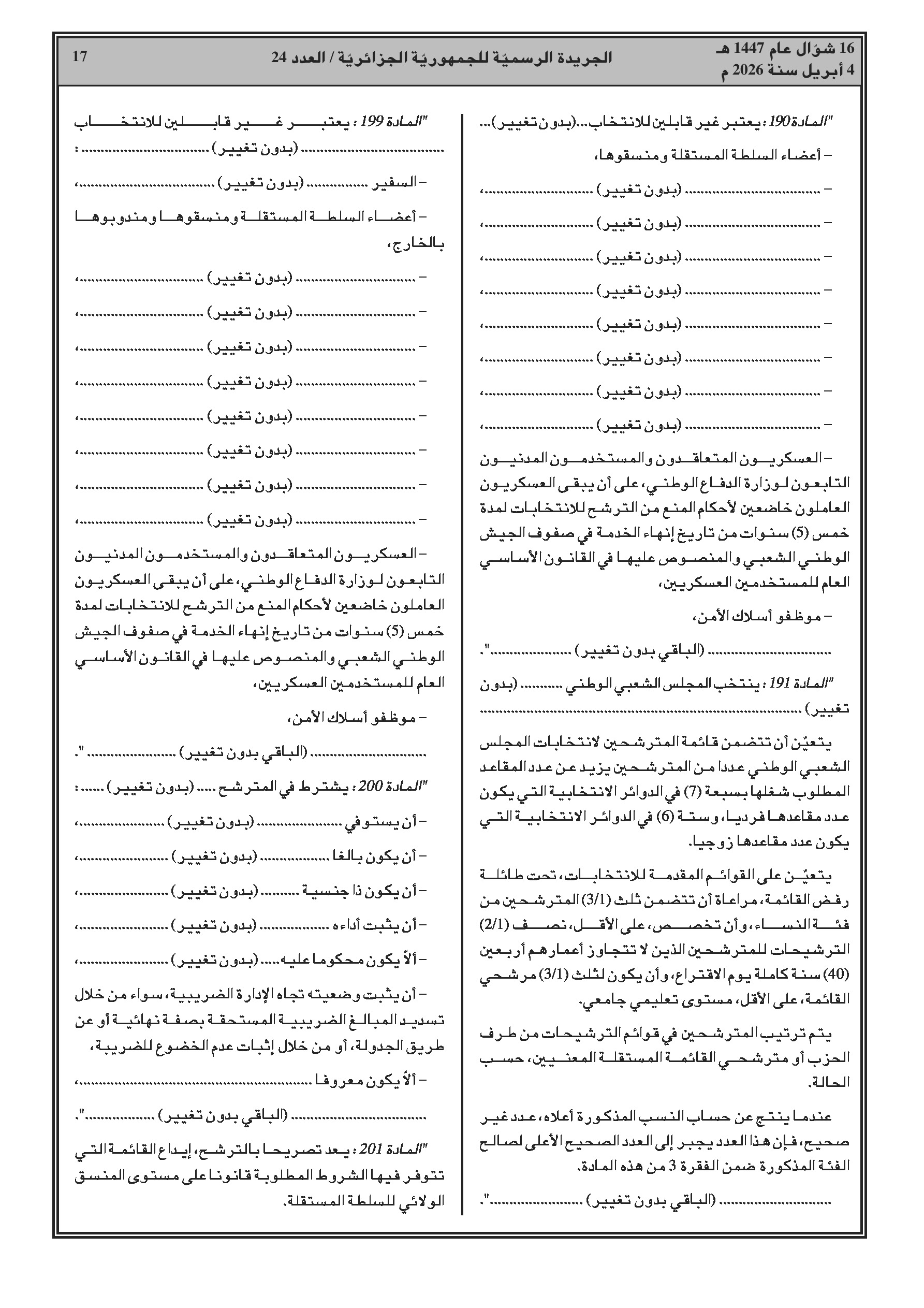 - المحكمة الدستورية تصادق على القانون العضوي المعدل للنظام الانتخابي. - القانون يعيد تنظيم السلطة الوطنية المستقلة للانتخابات وصلاحيات المنسقين. - شروط جديدة للترشح تشمل حصصاً للشباب والنساء والمستوى الجامعي. - تحديد 2 يوليو 2026 موعداً لإجراء الانتخابات التشريعية.