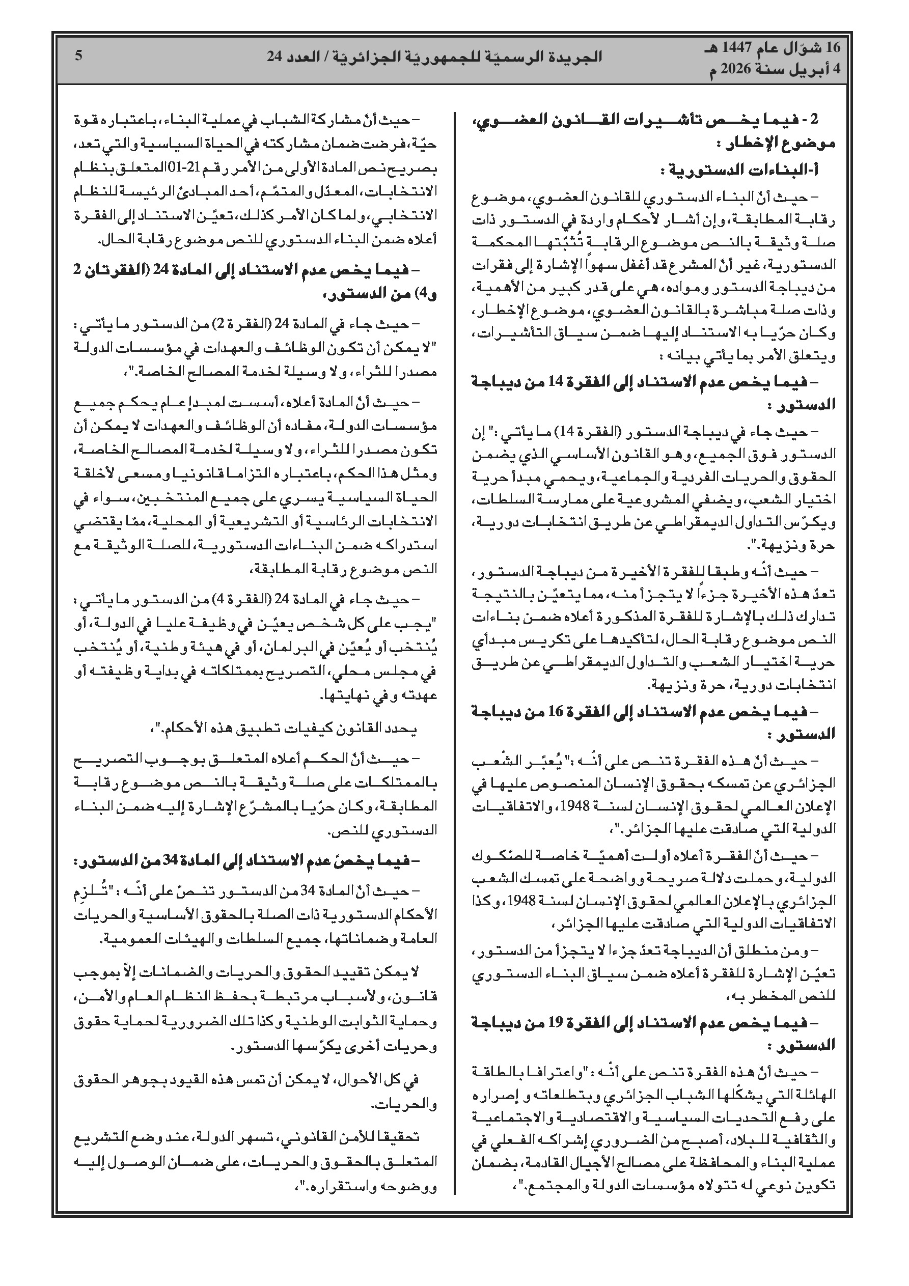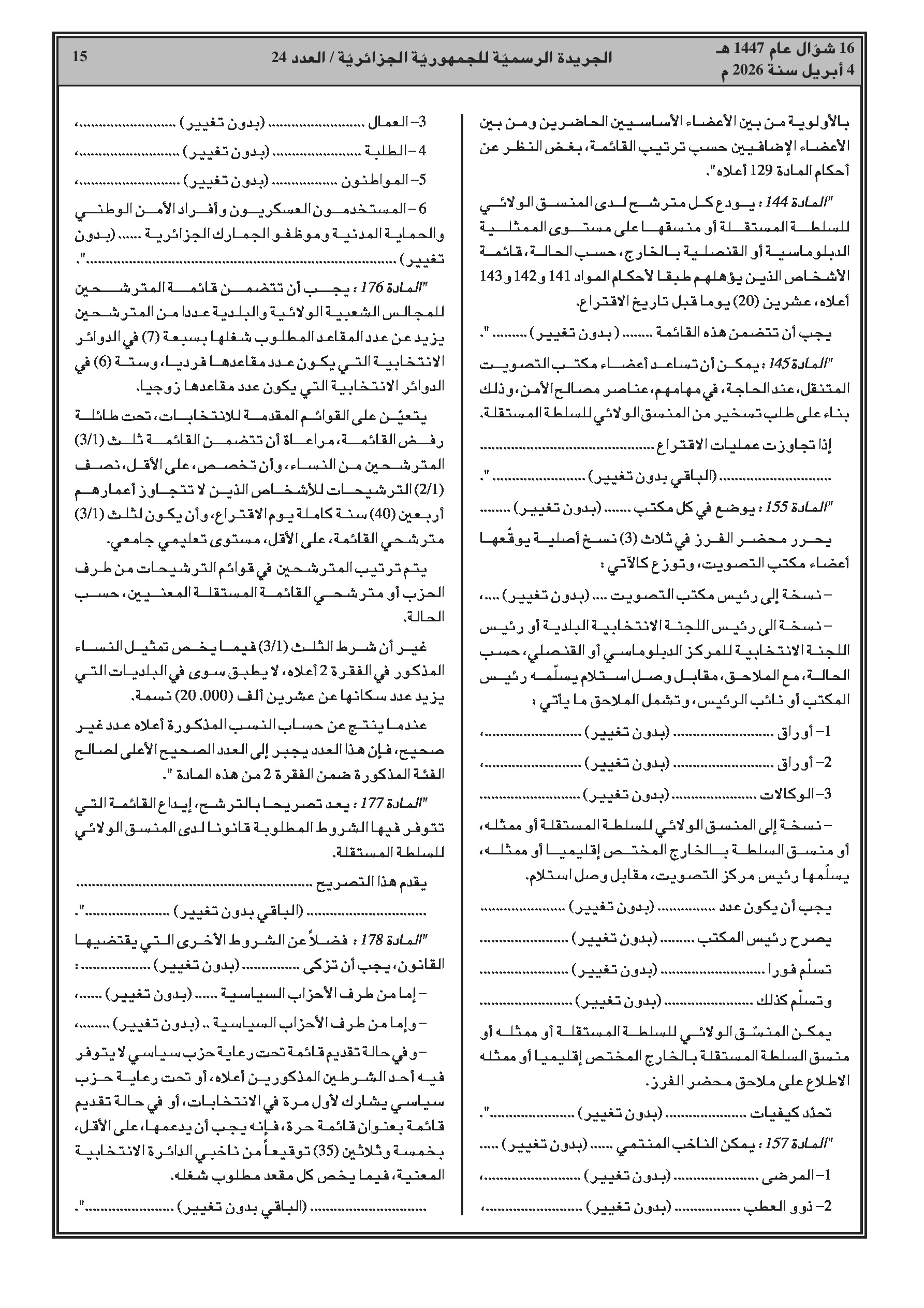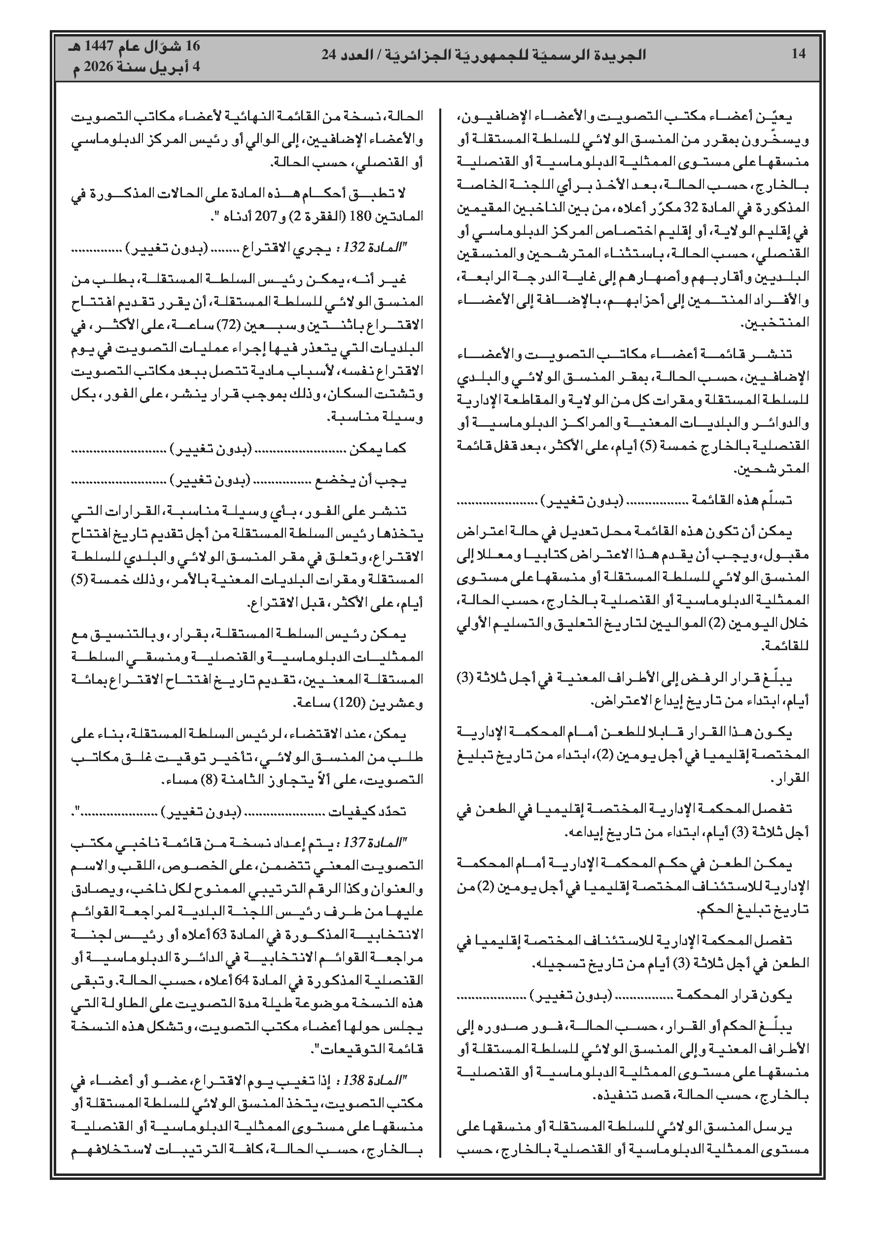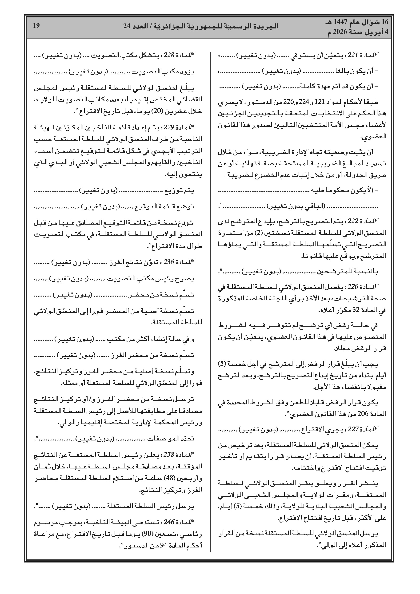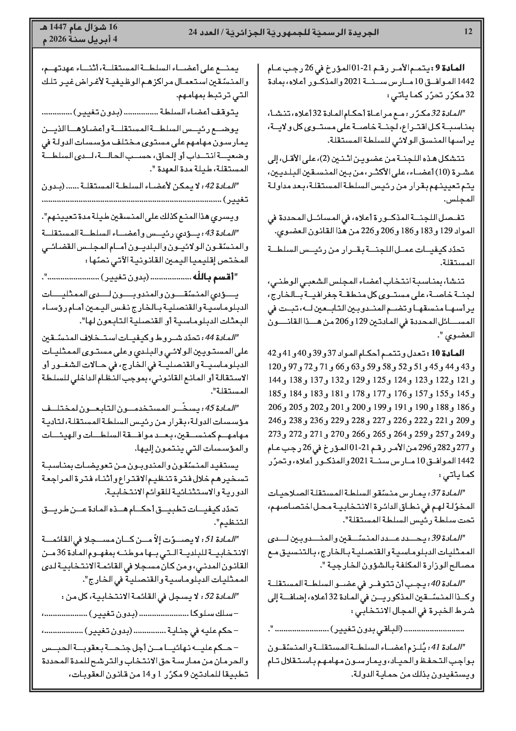 - المحكمة الدستورية تصادق على القانون العضوي المعدل للنظام الانتخابي. - القانون يعيد تنظيم السلطة الوطنية المستقلة للانتخابات وصلاحيات المنسقين. - شروط جديدة للترشح تشمل حصصاً للشباب والنساء والمستوى الجامعي. - تحديد 2 يوليو 2026 موعداً لإجراء الانتخابات التشريعية.