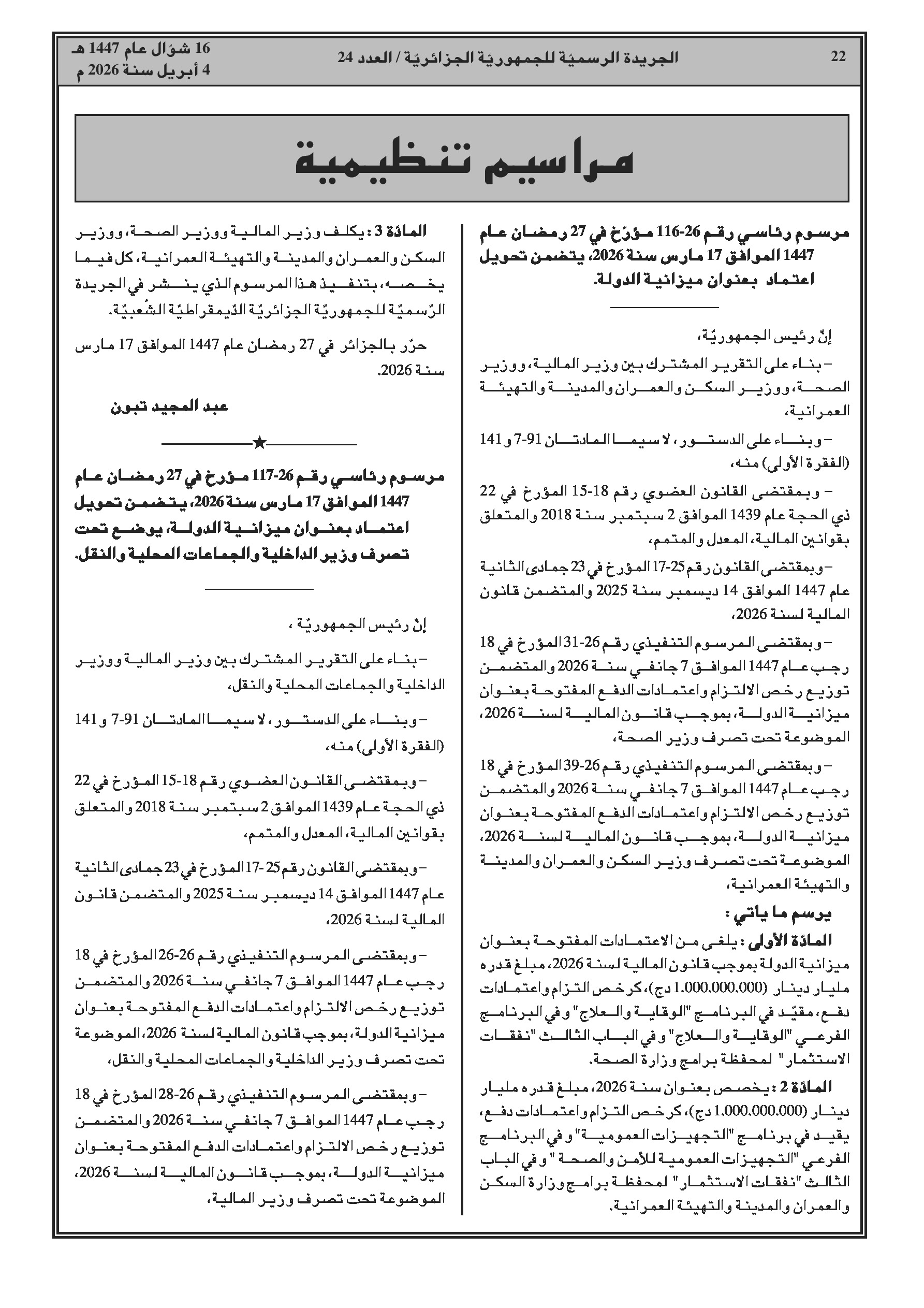 مراسيم رئاسية تقضي بتحويل اعتمادات مالية لصالح قطاعات السكن والداخلية والجماعات المحلية.