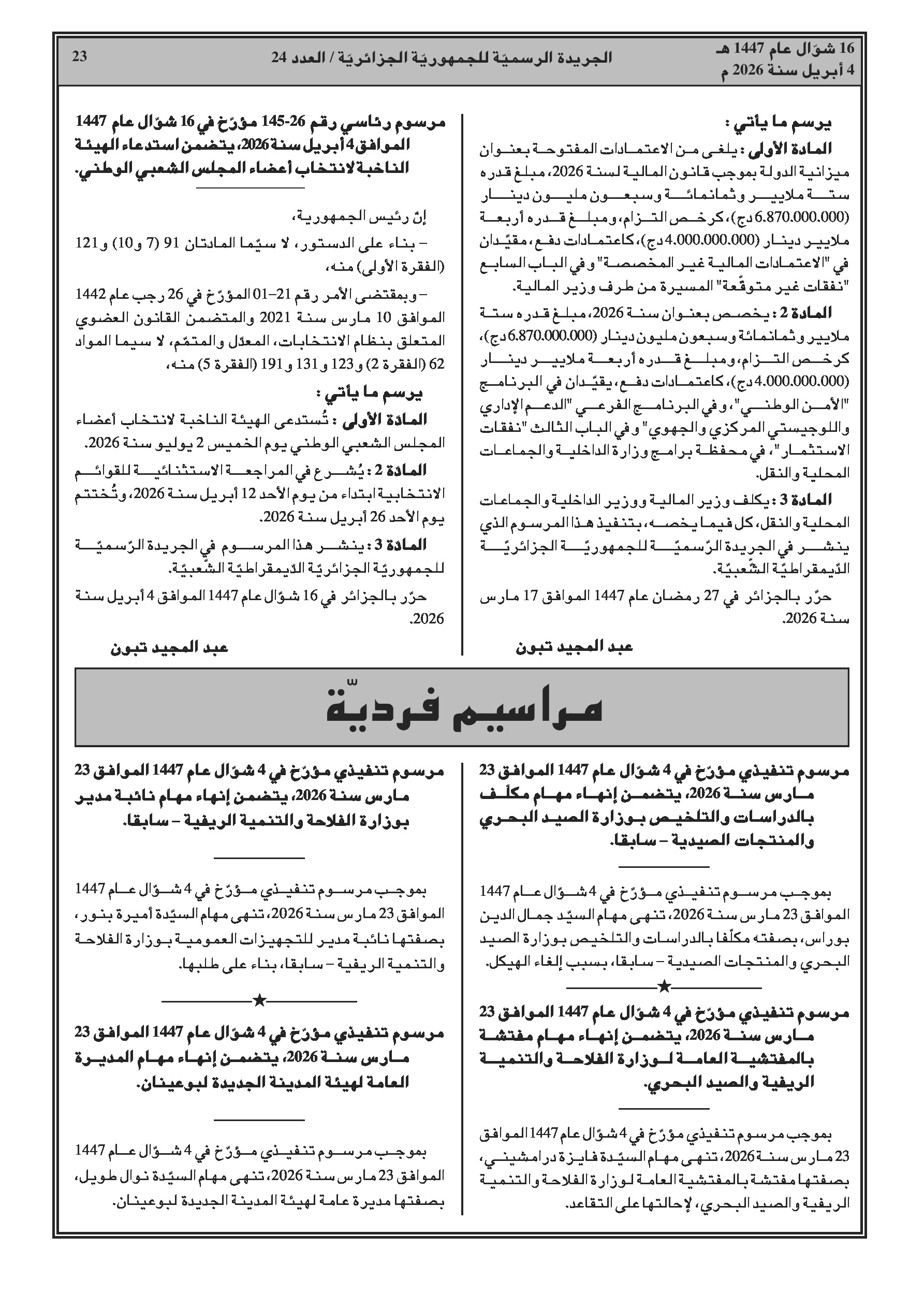 سلسلة من المراسيم التنفيذية لتعيين وإنهاء مهام إطارات سامية في عدة قطاعات حكومية ومحلية.