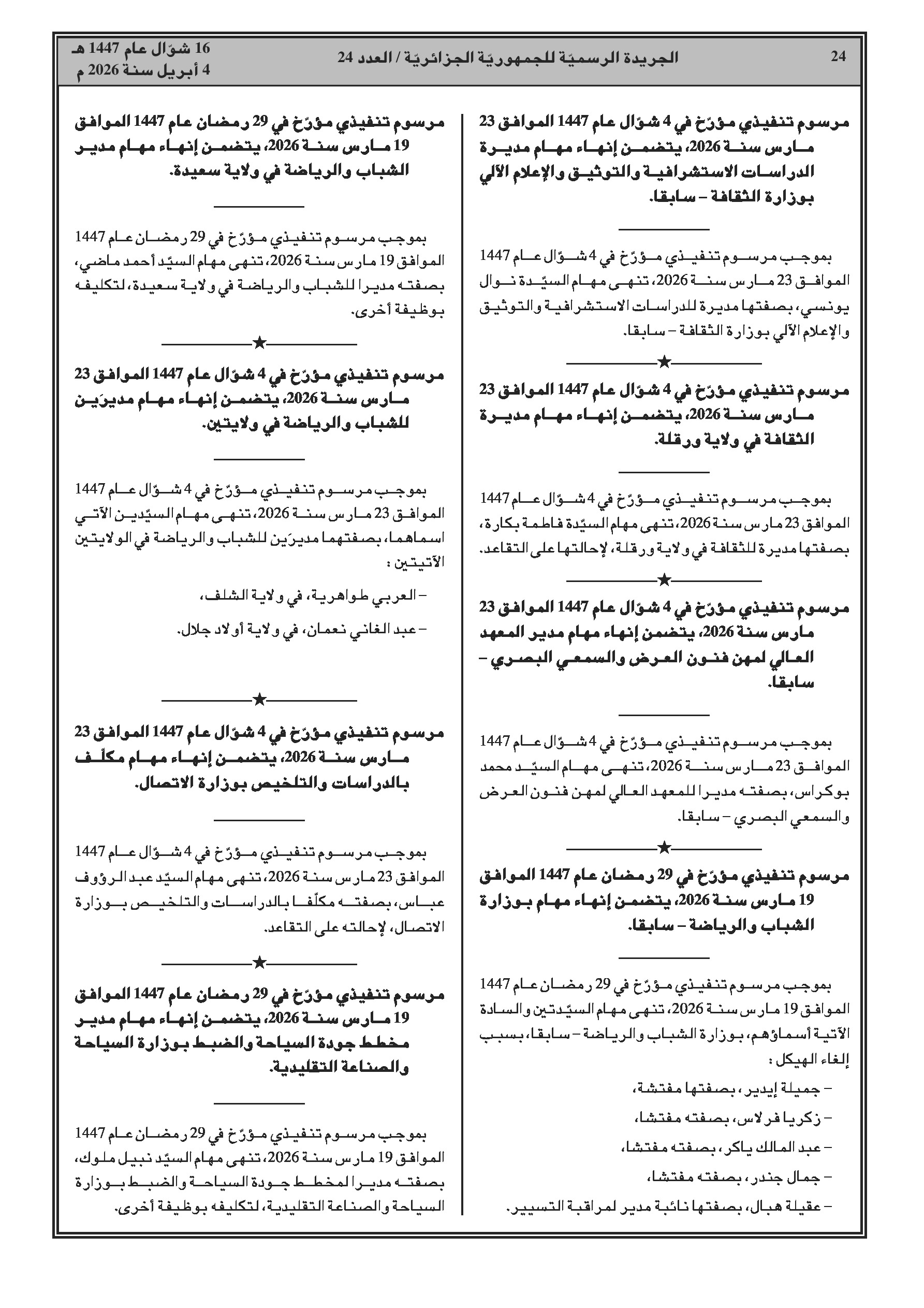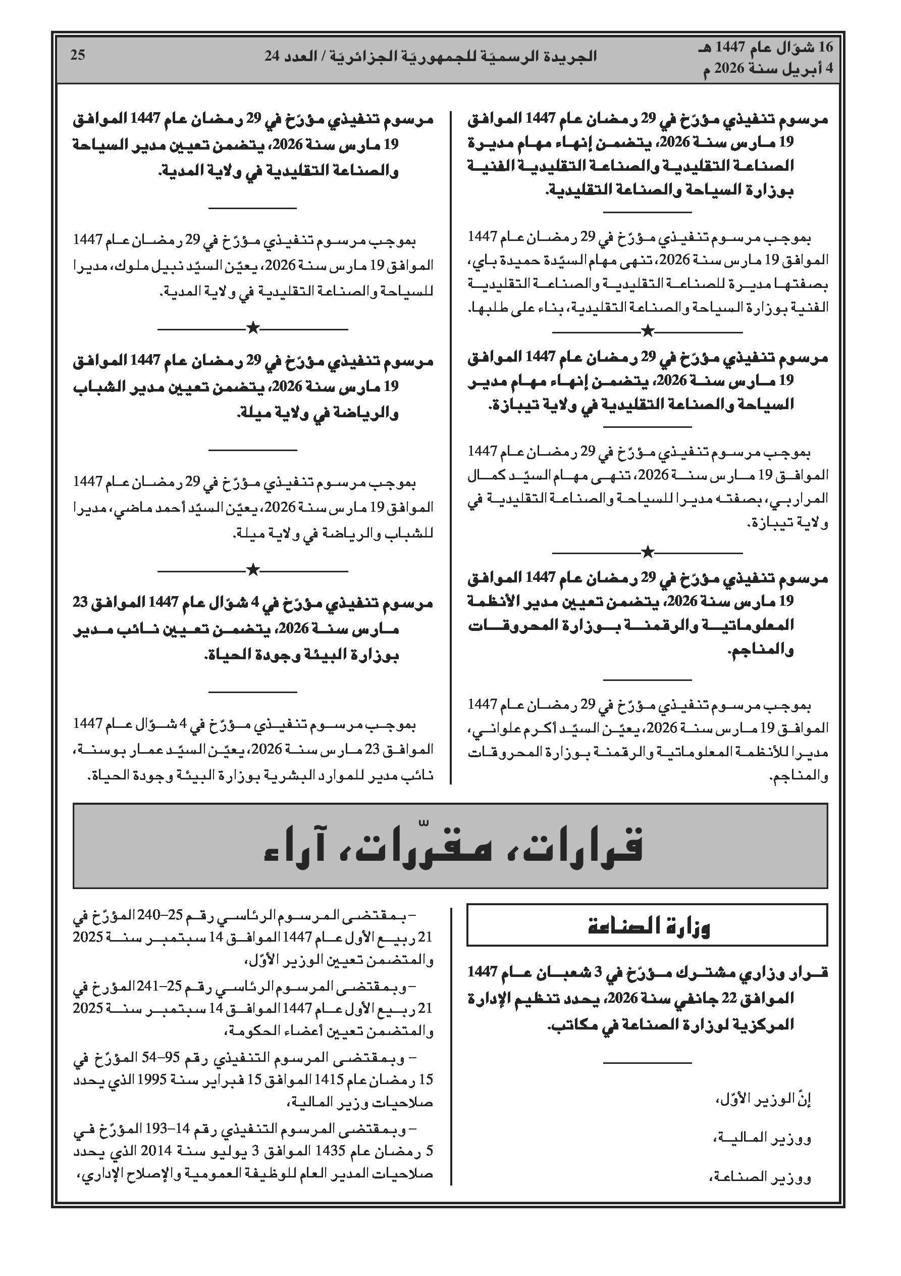 - إنهاء مهام وتعيينات في وزارات الصيد البحري، الفلاحة، والثقافة. - تعيين مدراء ولائيين لقطاعي الشباب والرياضة والسياحة. - تعيينات إدارية جديدة بوزارتي البيئة والطاقة.