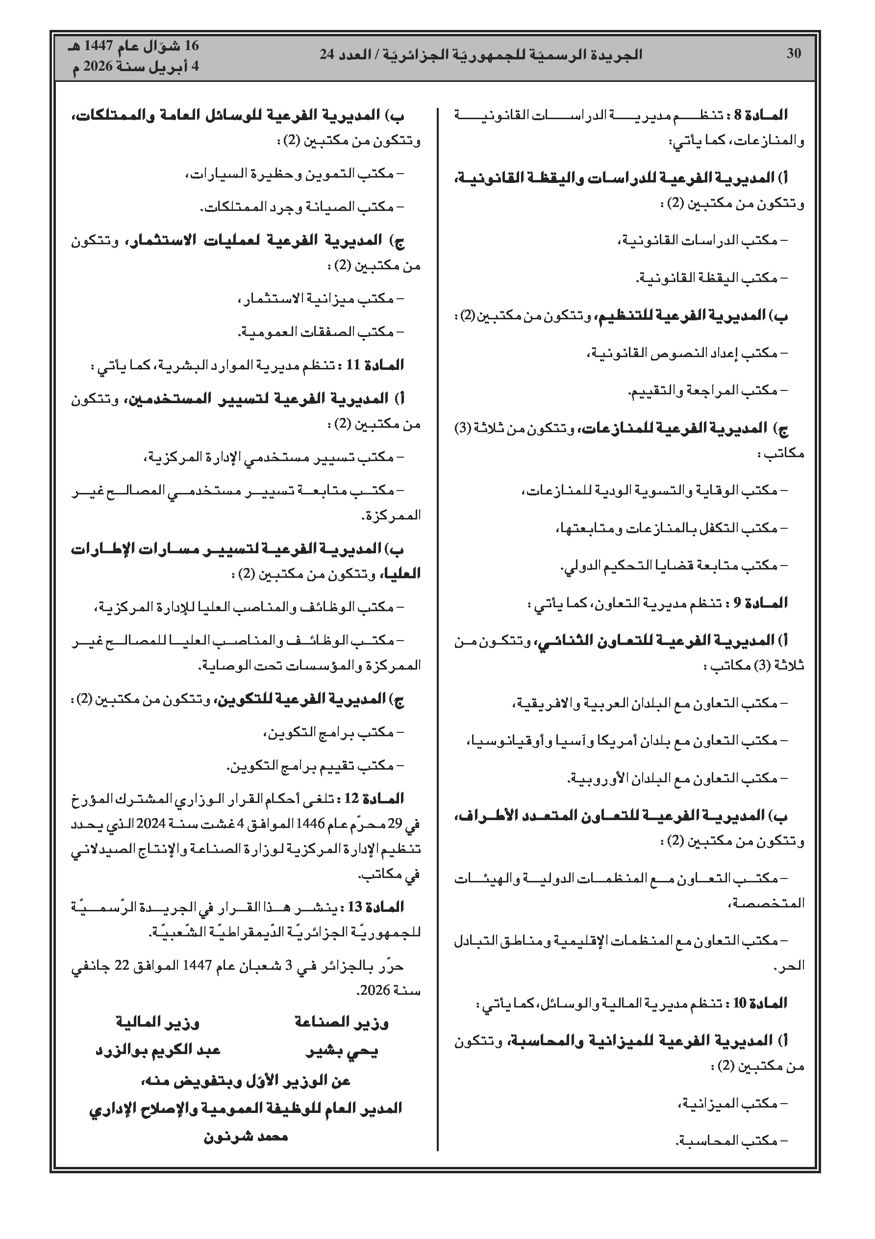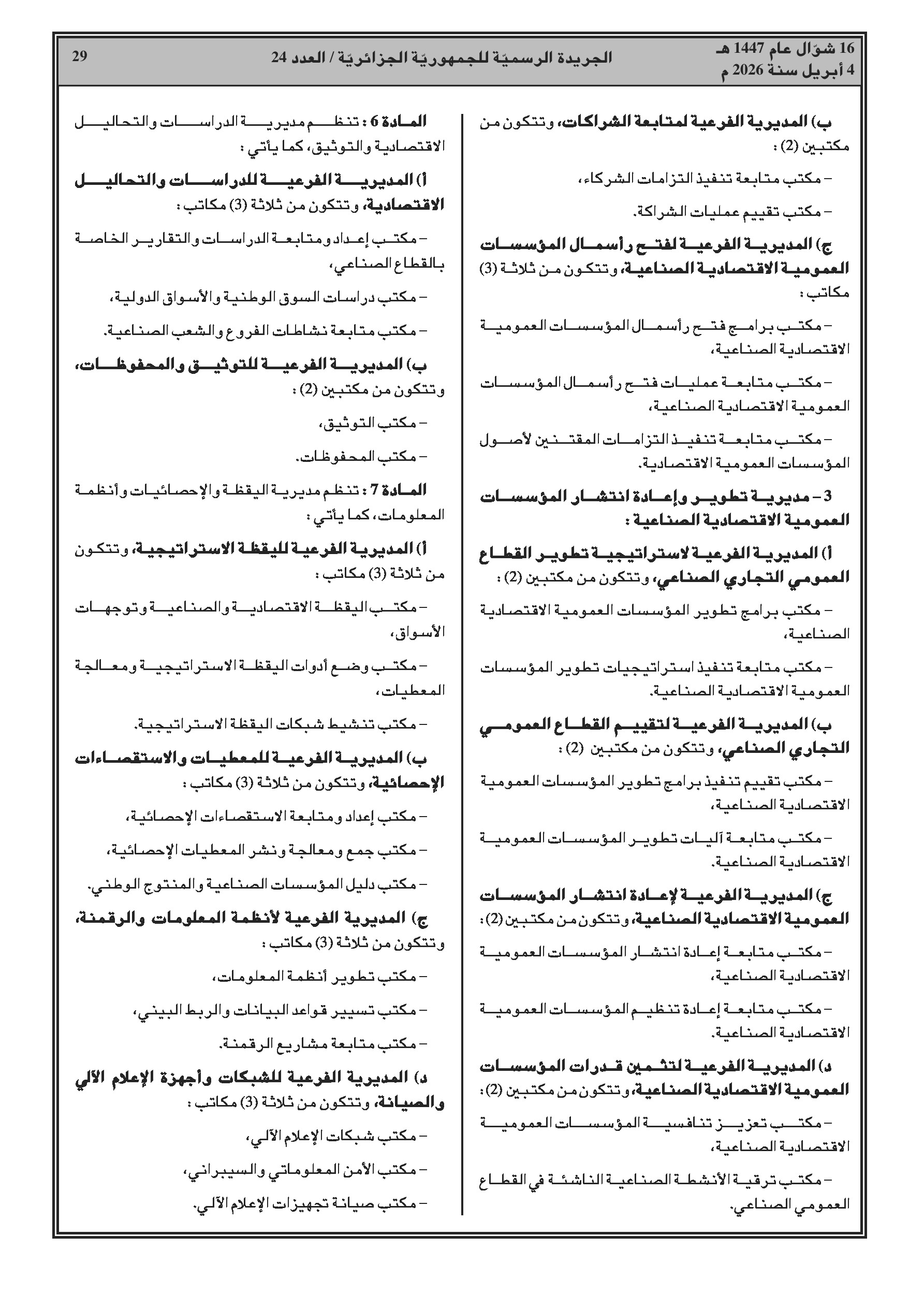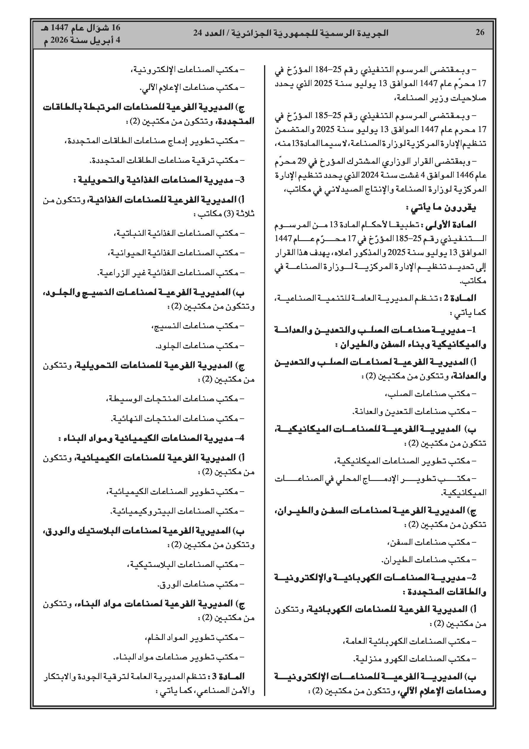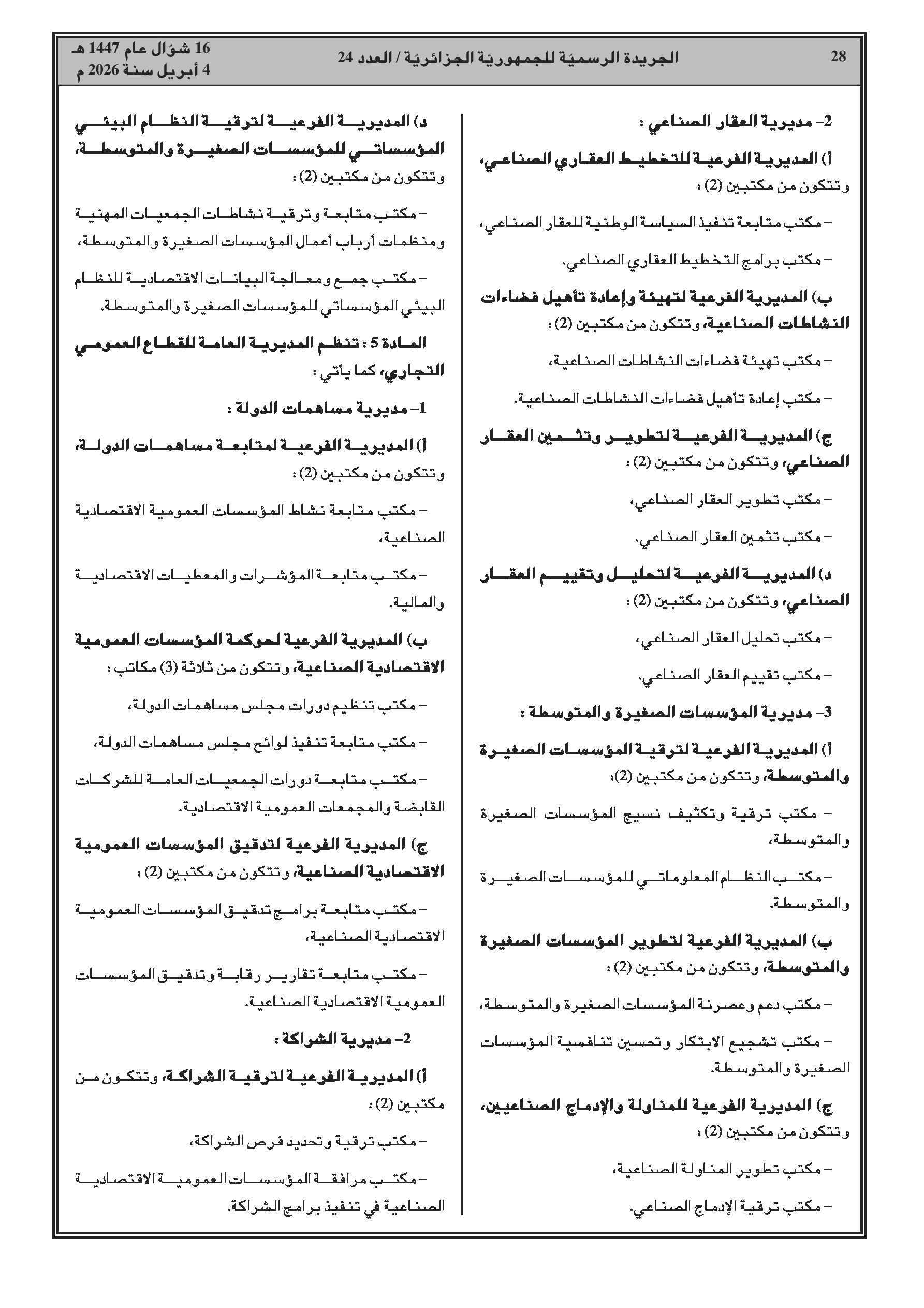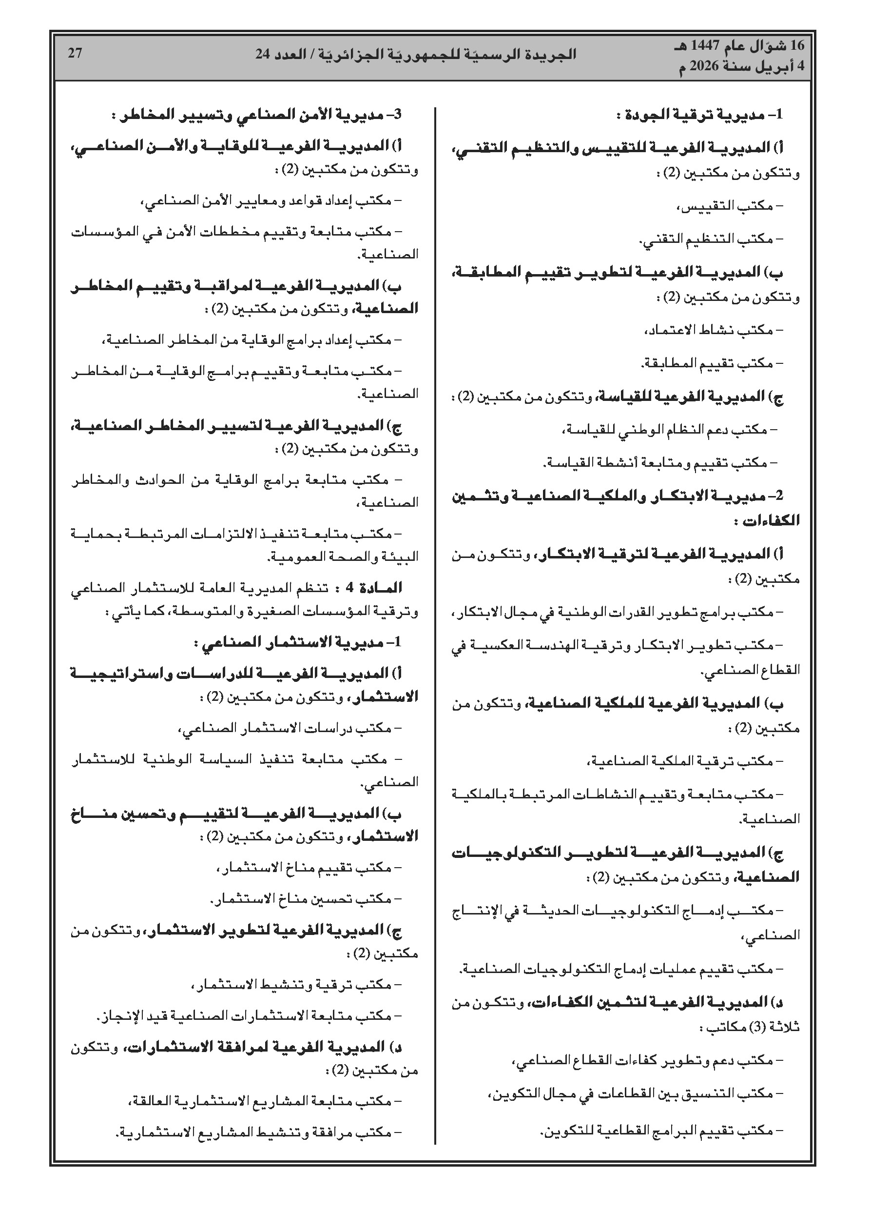 - هيكلة الإدارة المركزية لوزارة الصناعة لتشمل مديريات متخصصة للتطوير الصناعي والجودة والاستثمار. - تعيين رئيس وأعضاء لجنة الجائزة الوطنية للمؤسسة الصغيرة والمتوسطة المبتكرة.