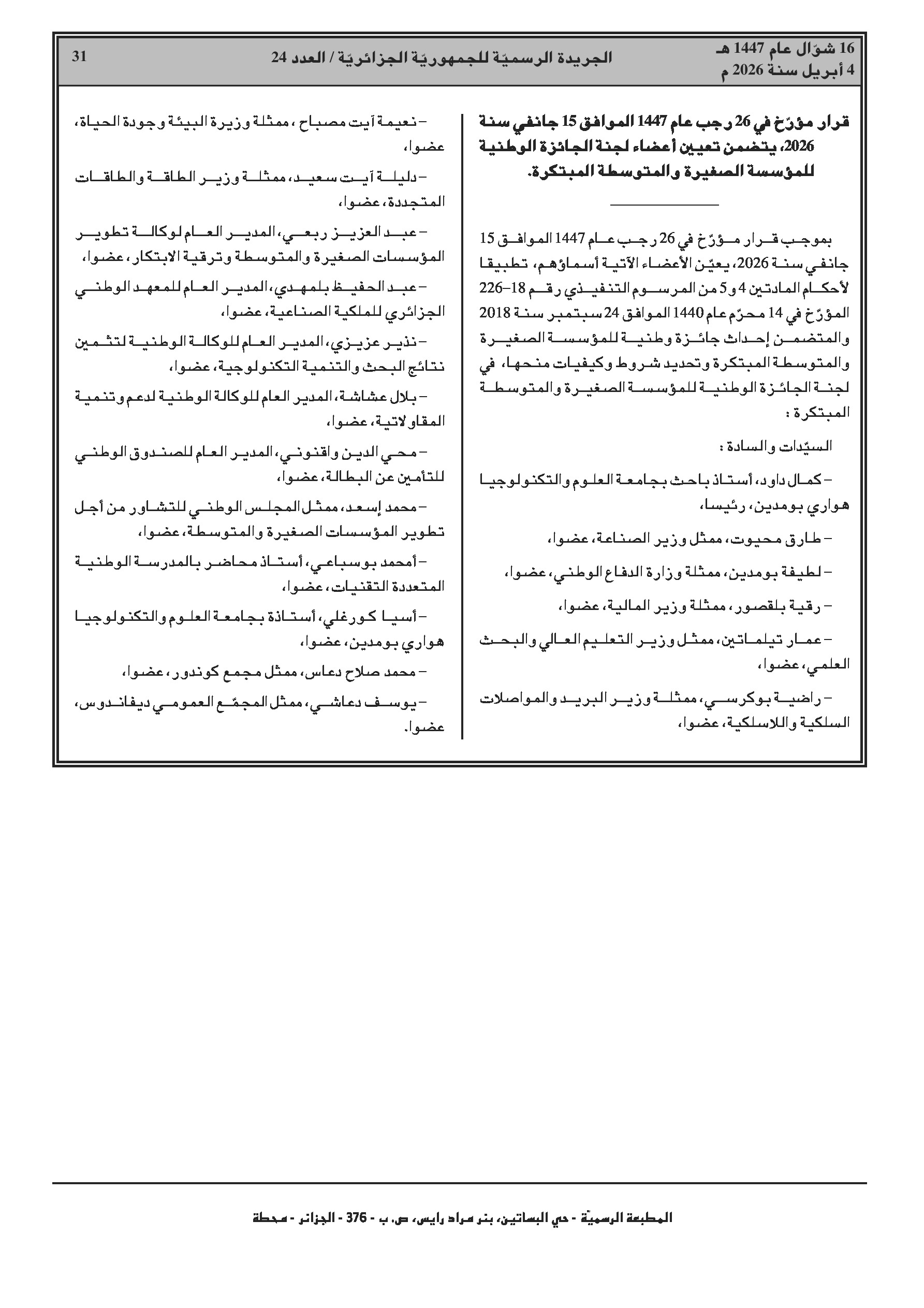 قرار وزاري يحدد الهيكل التنظيمي لوزارة الصناعة، وتعيين أعضاء لجنة جائزة المؤسسات الصغيرة والمتوسطة المبتكرة.