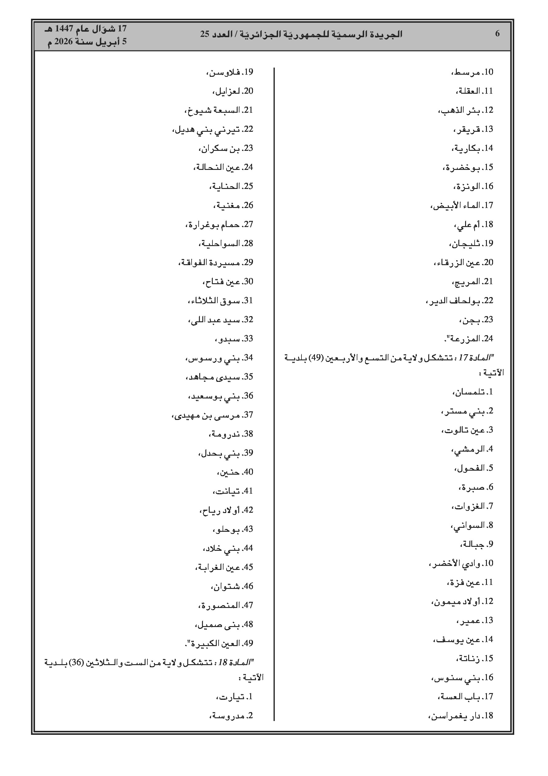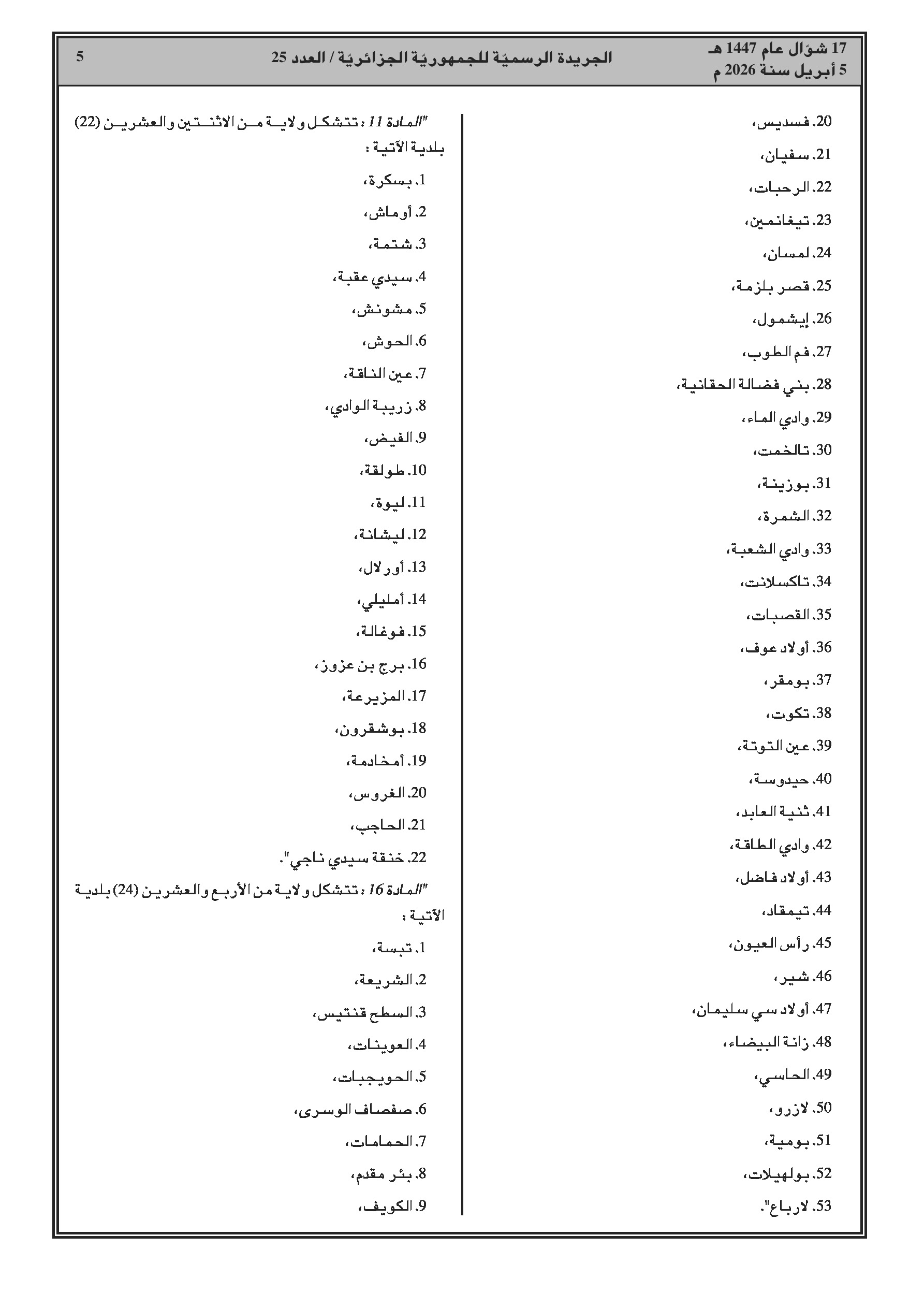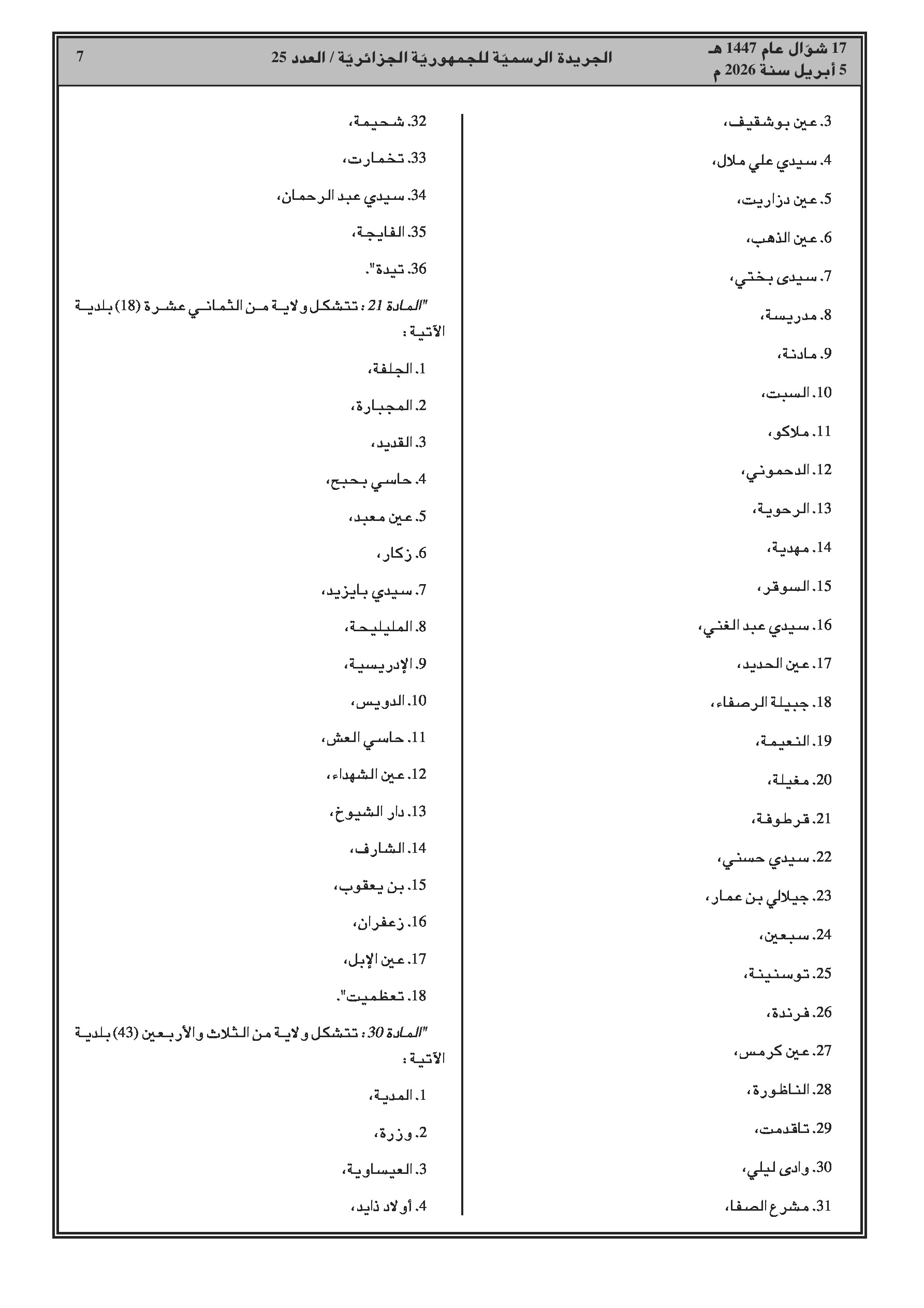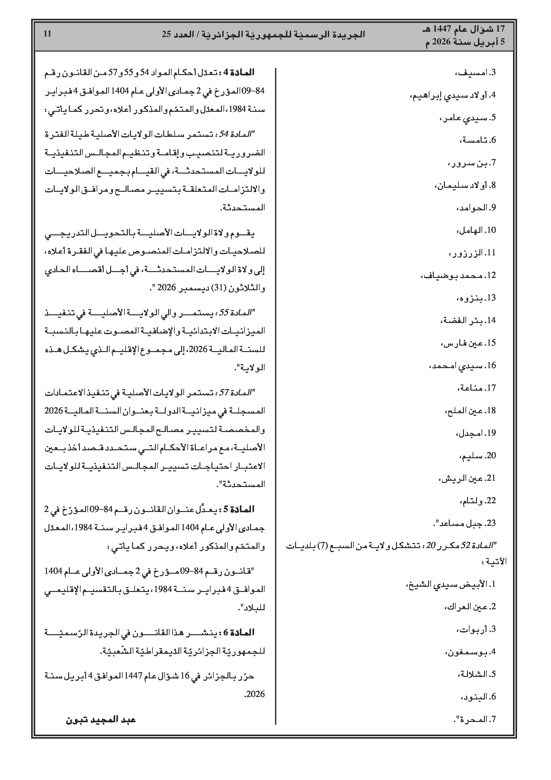 - استمرار الولايات الأم في تسيير شؤون الولايات الجديدة وتغطية ميزانيتها إلى غاية تنصيب أجهزتها بشكل كامل في أجل أقصاه نهاية سنة 2026.