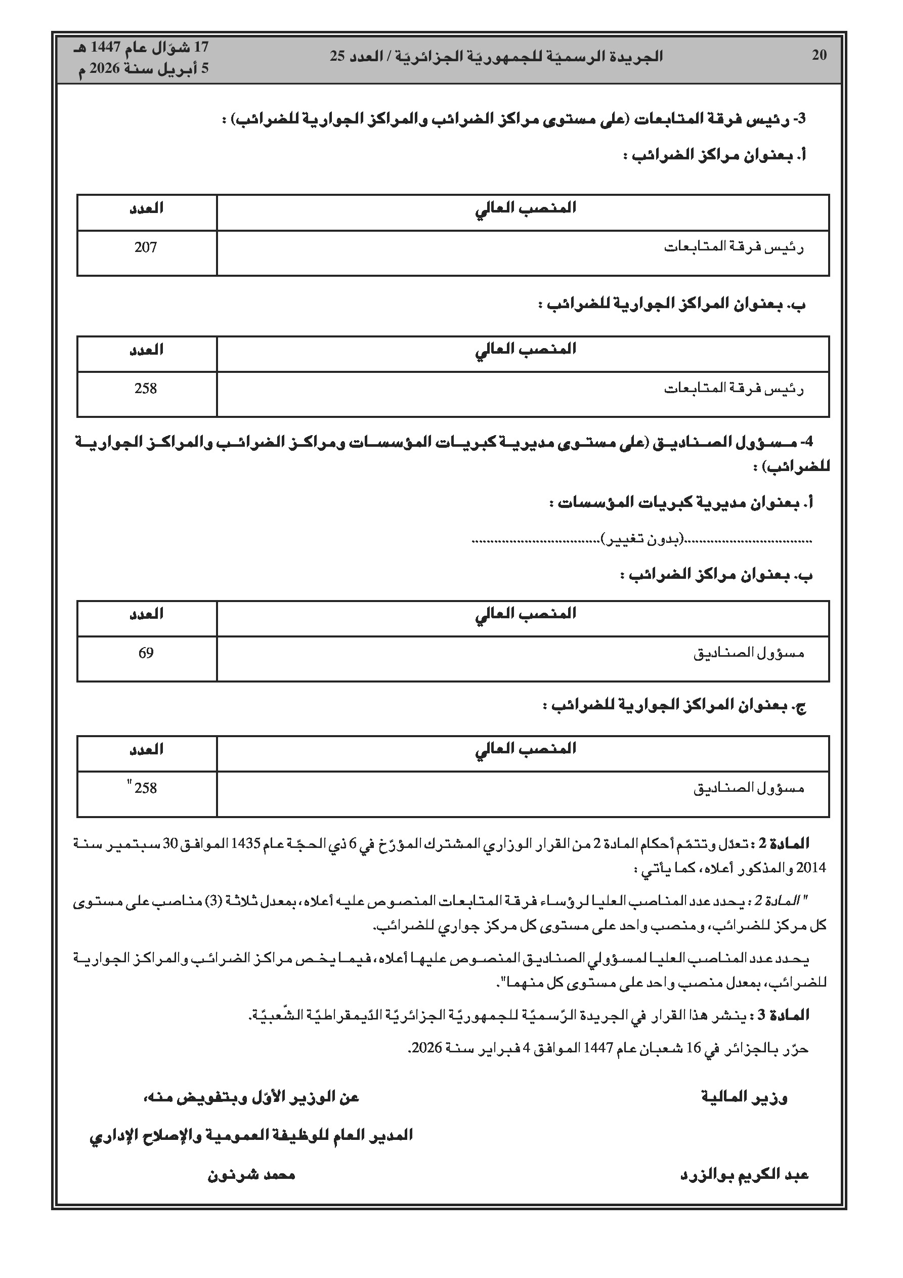 تعديل الهيكل التنظيمي للإدارة المركزية بوزارة المالية وتحديد المناصب العليا في الإدارة الجبائية.