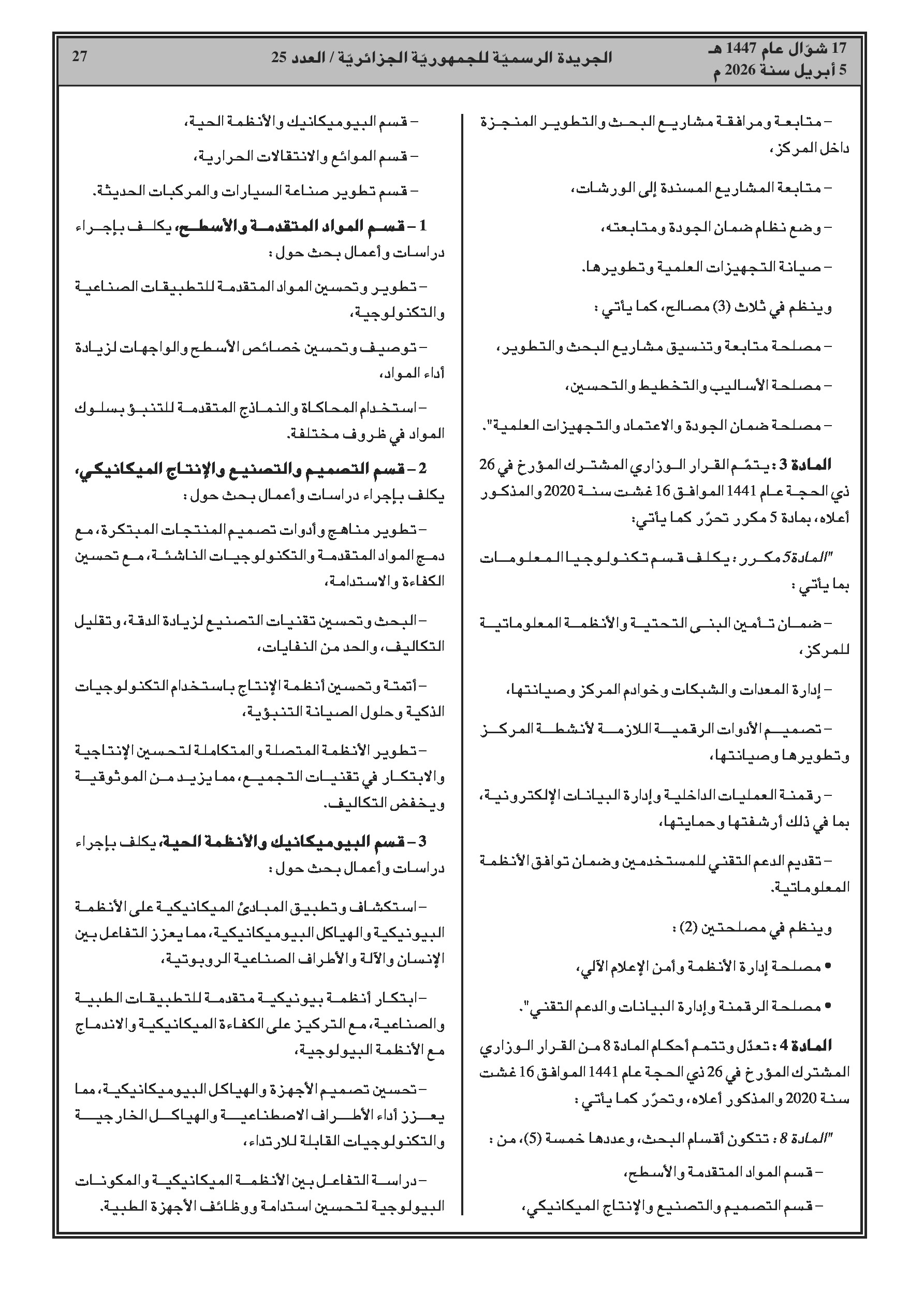تحديد التنظيم الداخلي لثلاثة مراكز بحث وطنية متخصصة في الميكانيكا، تكنولوجيا النانو، والرياضيات التطبيقية.