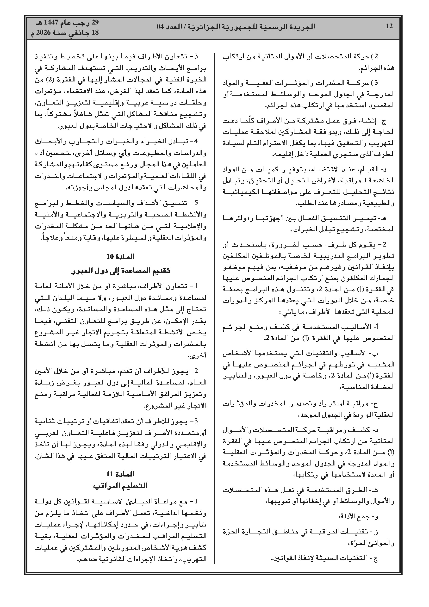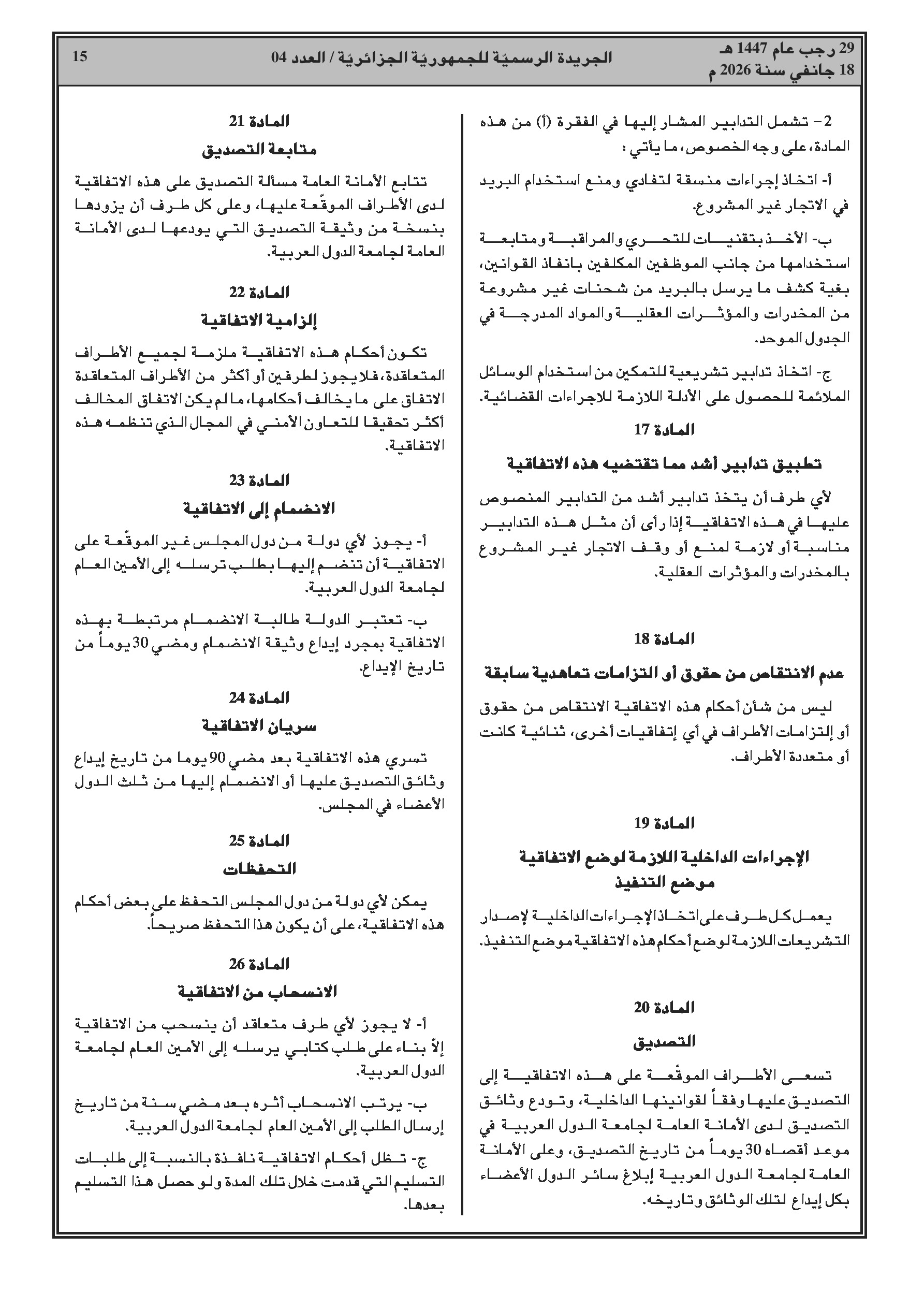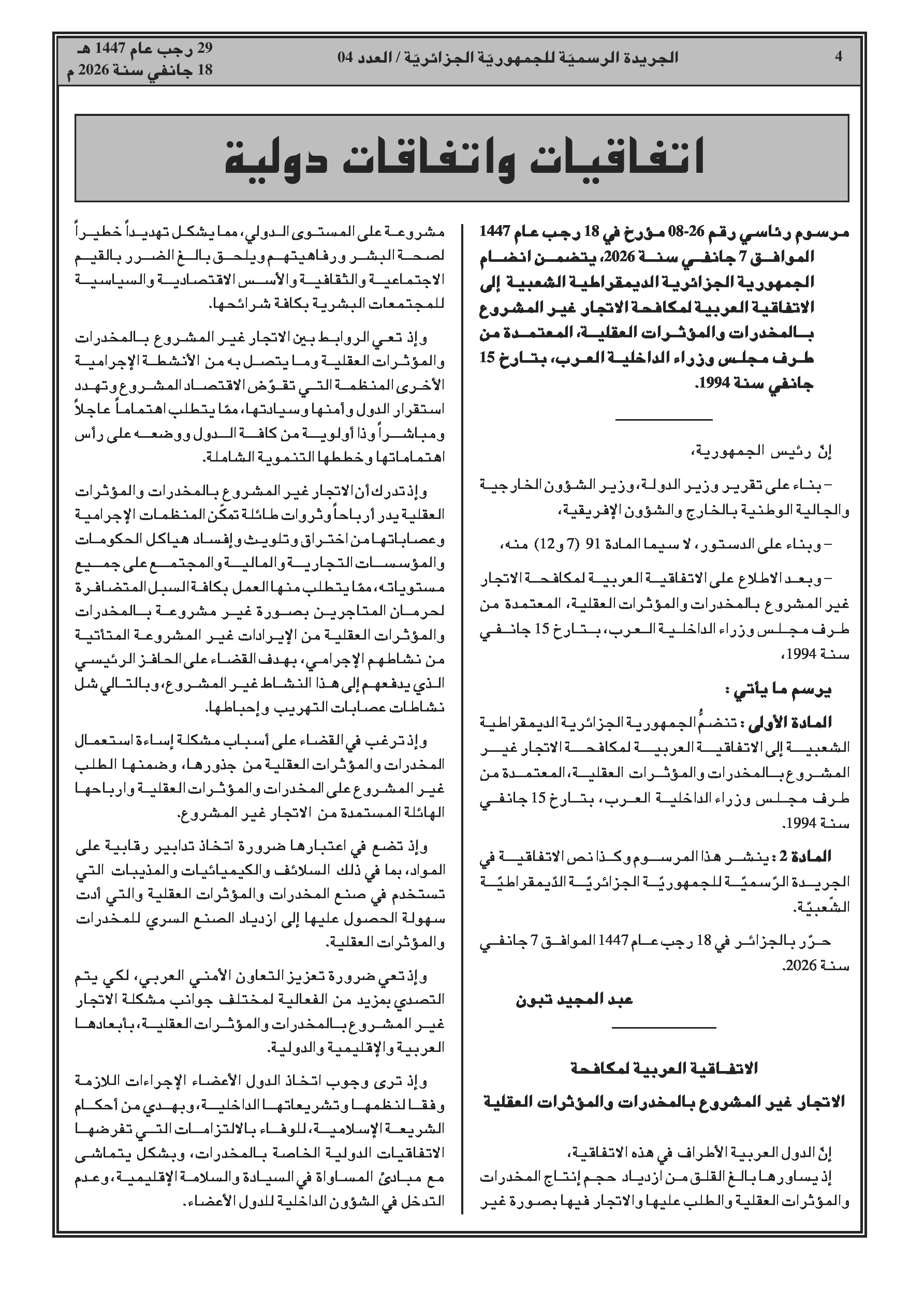 انضمام الجزائر للاتفاقية العربية لمكافحة الاتجار غير المشروع بالمخدرات والمؤثرات العقلية.