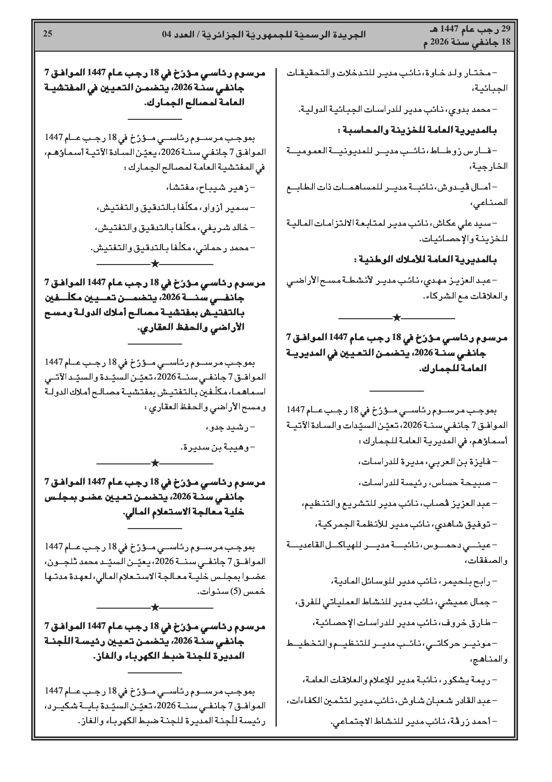 تعيين اللواء سيد أحمد برومانة قائداً للدرك الوطني؛ تعيينات جديدة في المديرية العامة للجمارك ووزارة المالية ورئاسة الجمهورية.