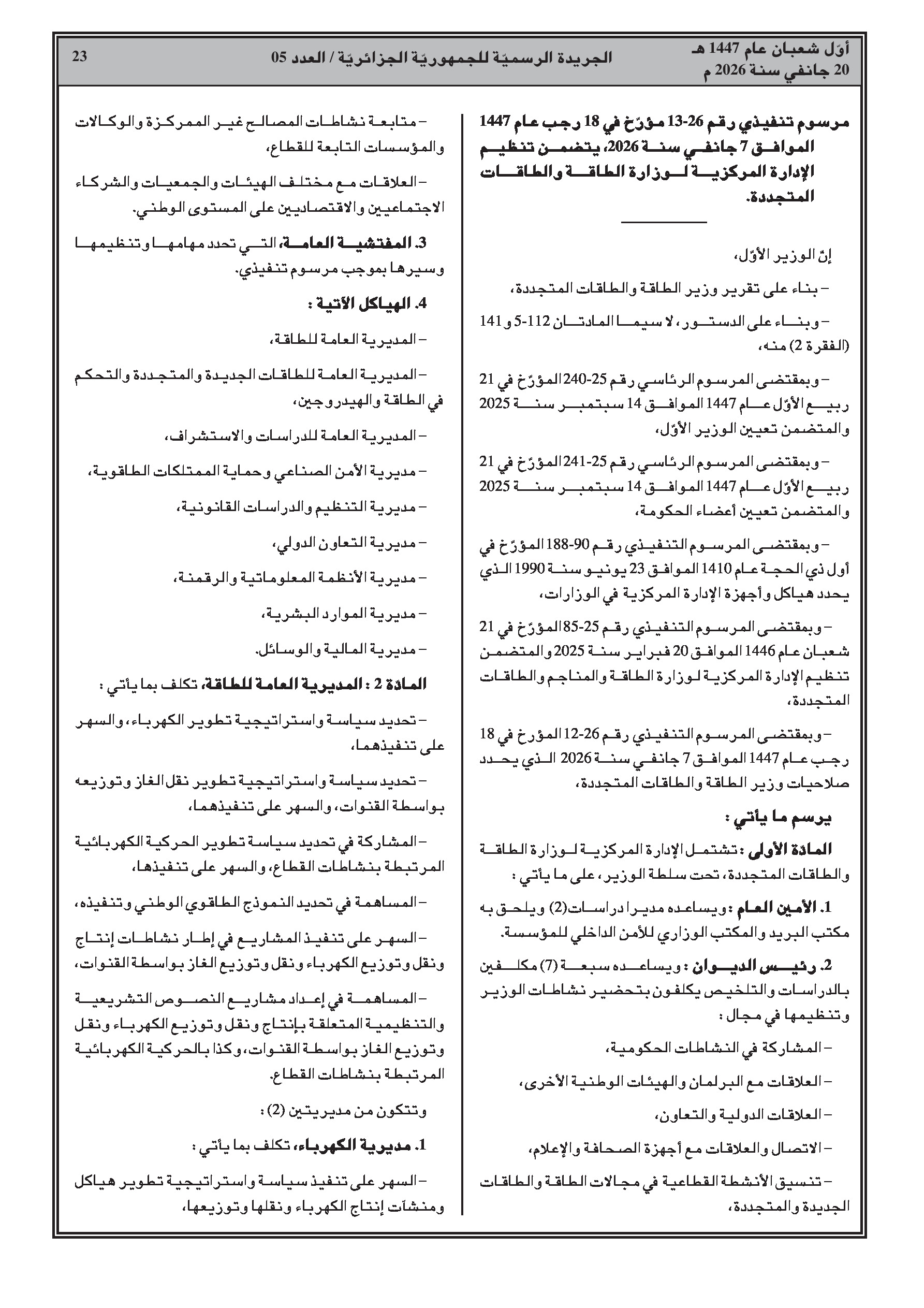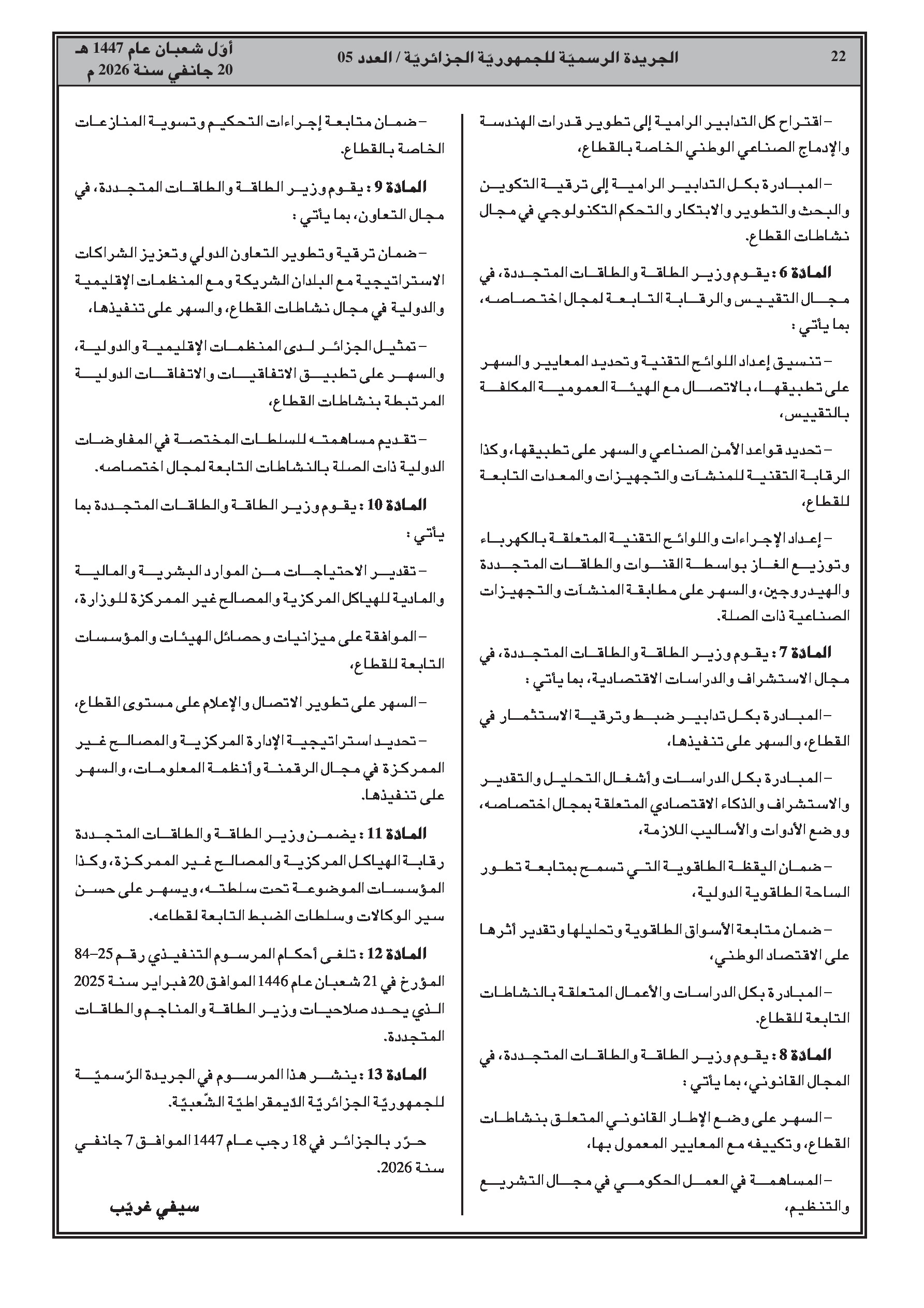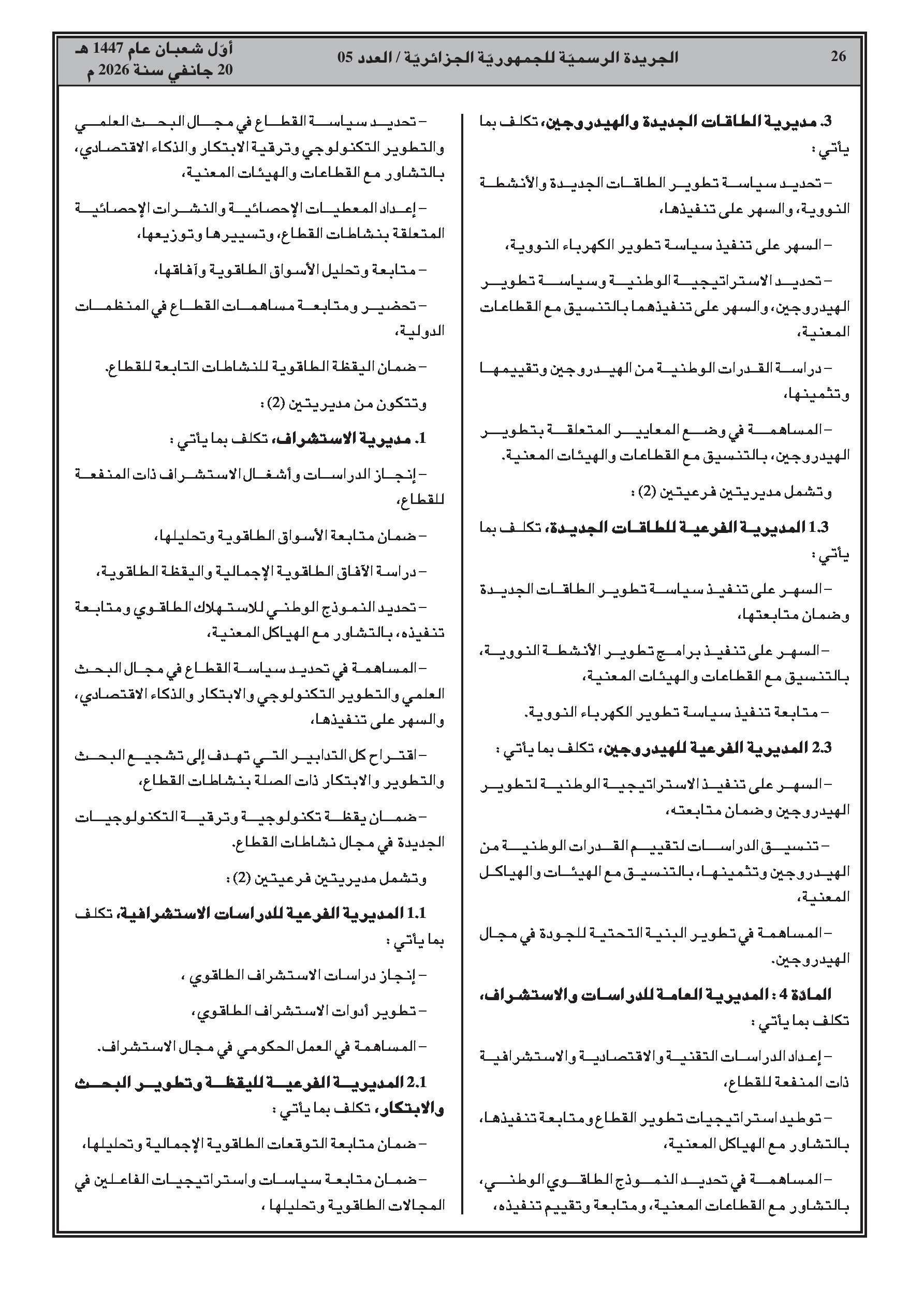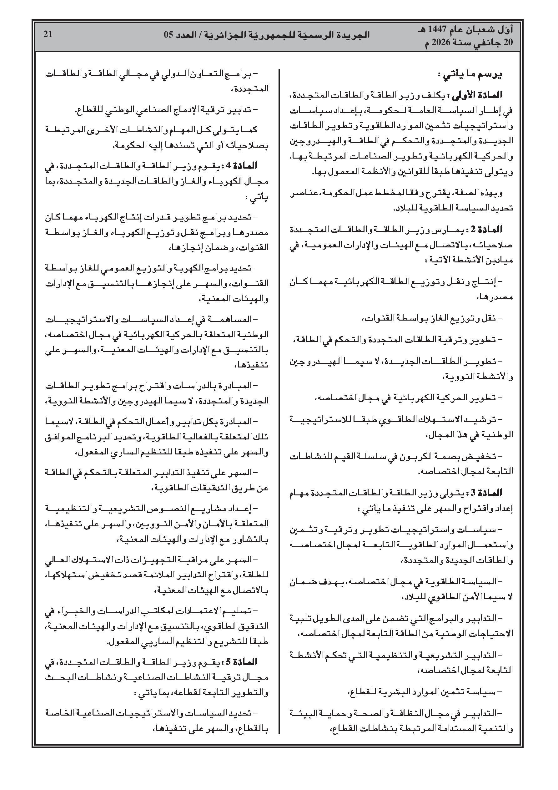 مراسيم تنفيذية تحدد مهام الوزير والهيكل التنظيمي للوزارة مع التركيز على الانتقال الطاقوي.