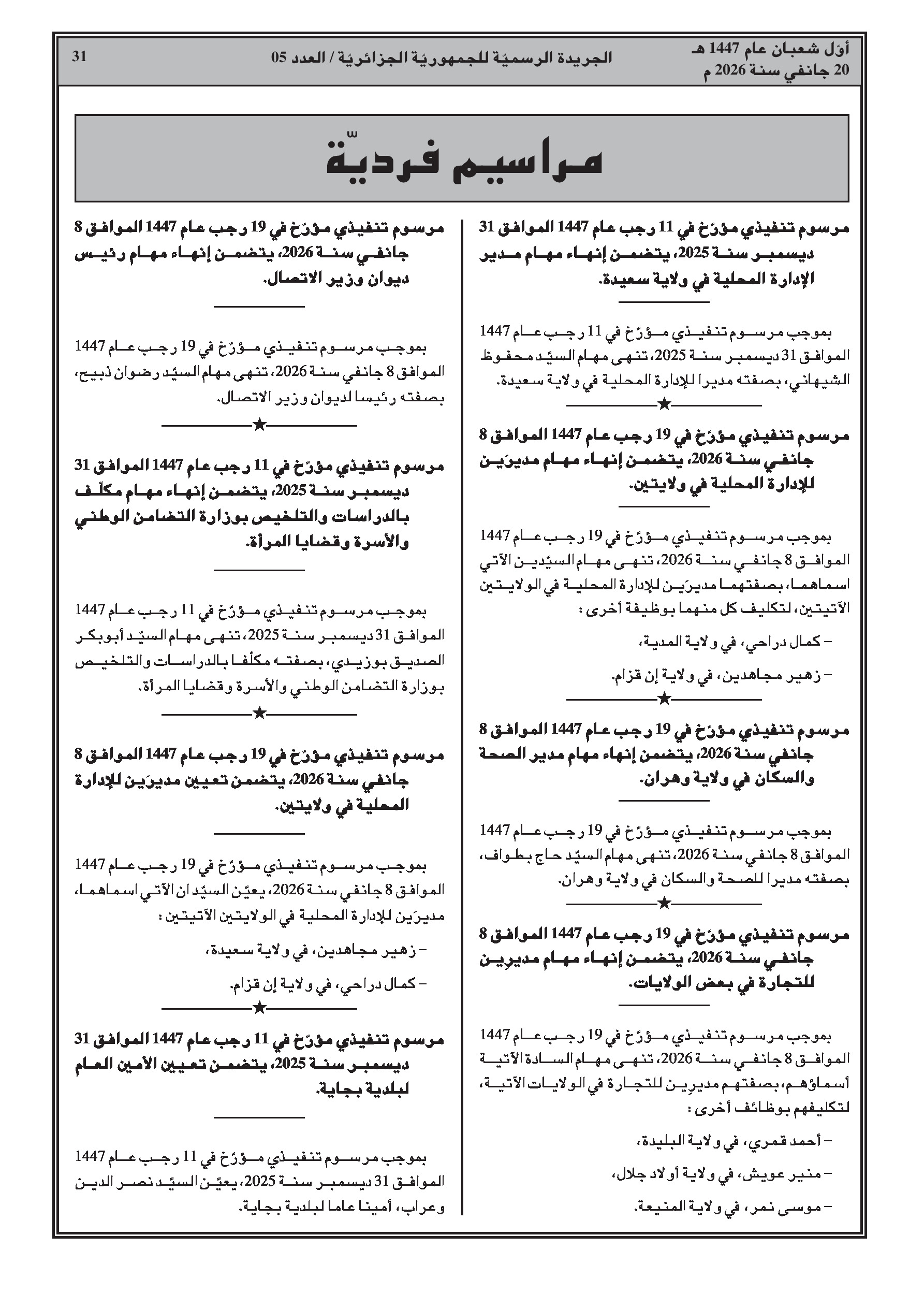إنهاء مهام وتعيين مدراء للإدارة المحلية، التجارة، الضرائب، ومدراء صحة ولائيين. تعيينات في مناصب عليا بجامعات (سطيف، بسكرة) ووزارة البريد.
