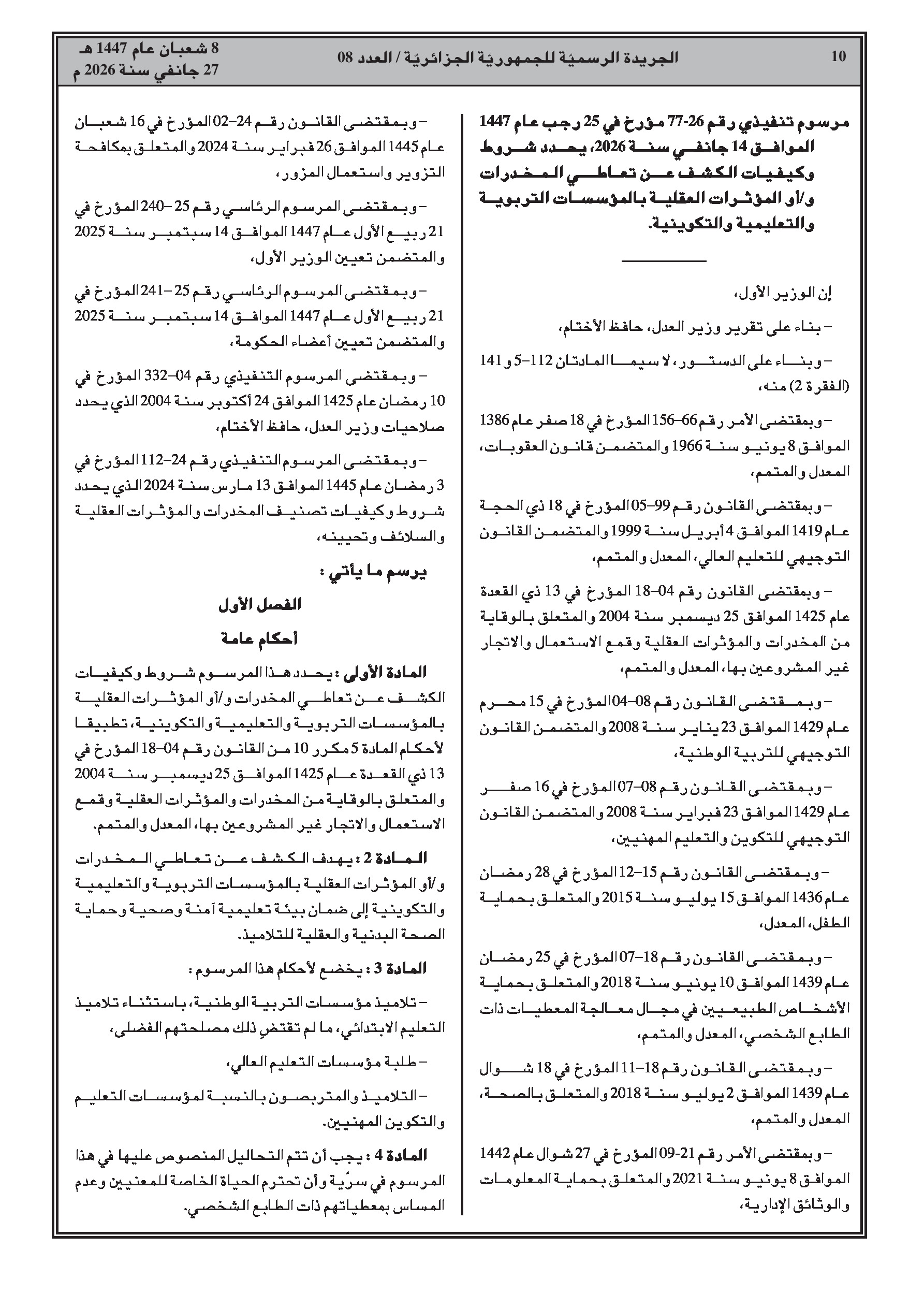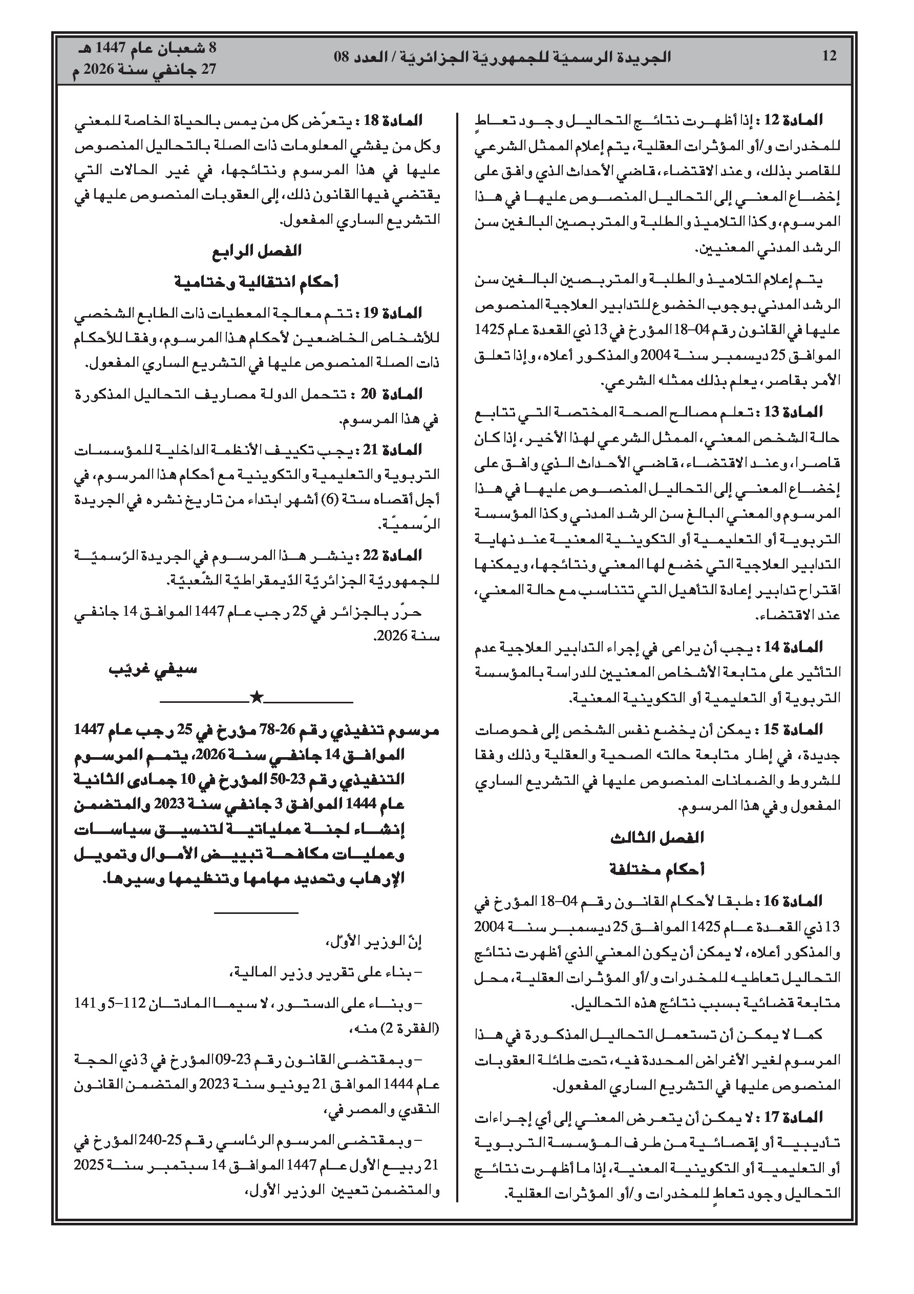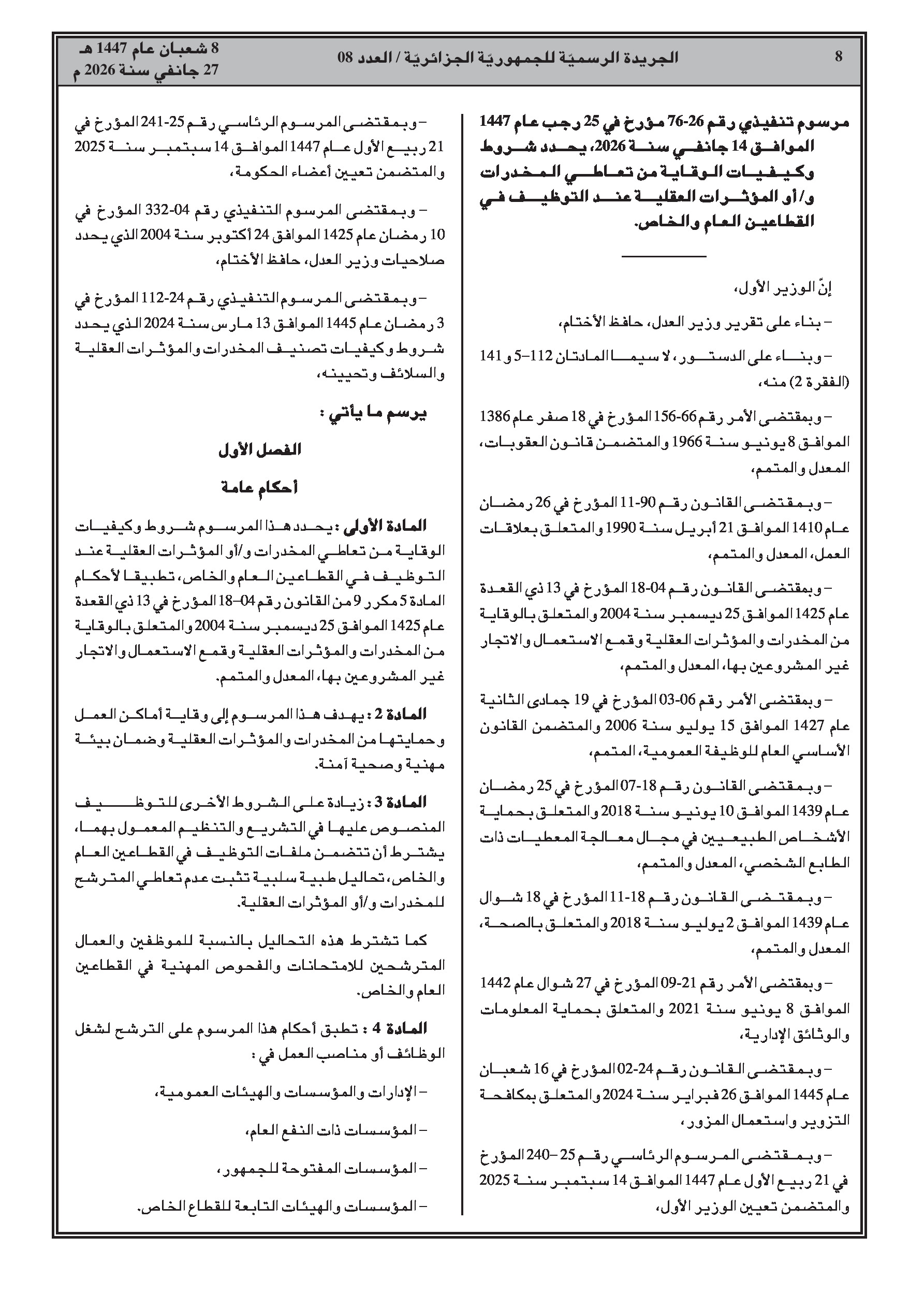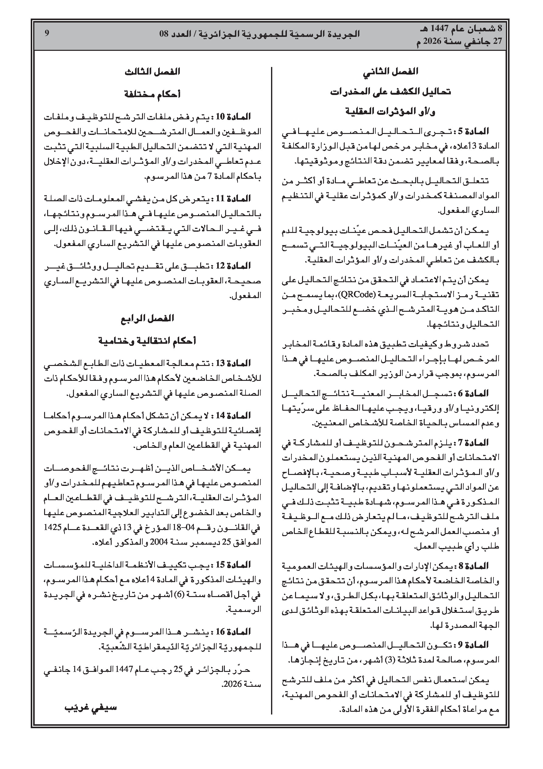 مراسيم تحدد شروط الكشف عن تعاطي المخدرات والمؤثرات العقلية عند التوظيف وفي المؤسسات التعليمية.