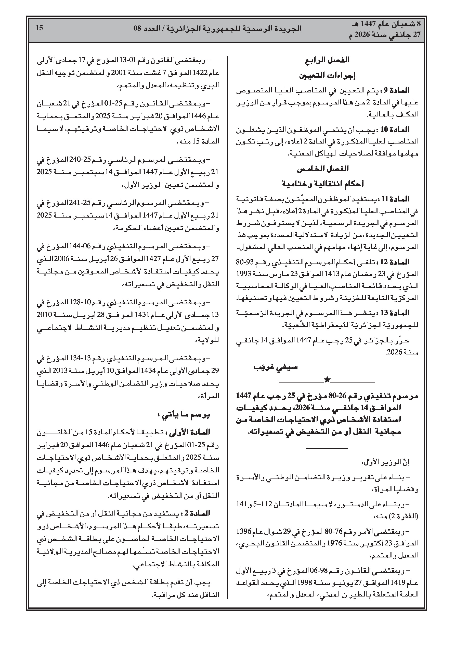 تحديد كيفيات استفادة الأشخاص ذوي الاحتياجات الخاصة من مجانية النقل أو تخفيض التعريفات.