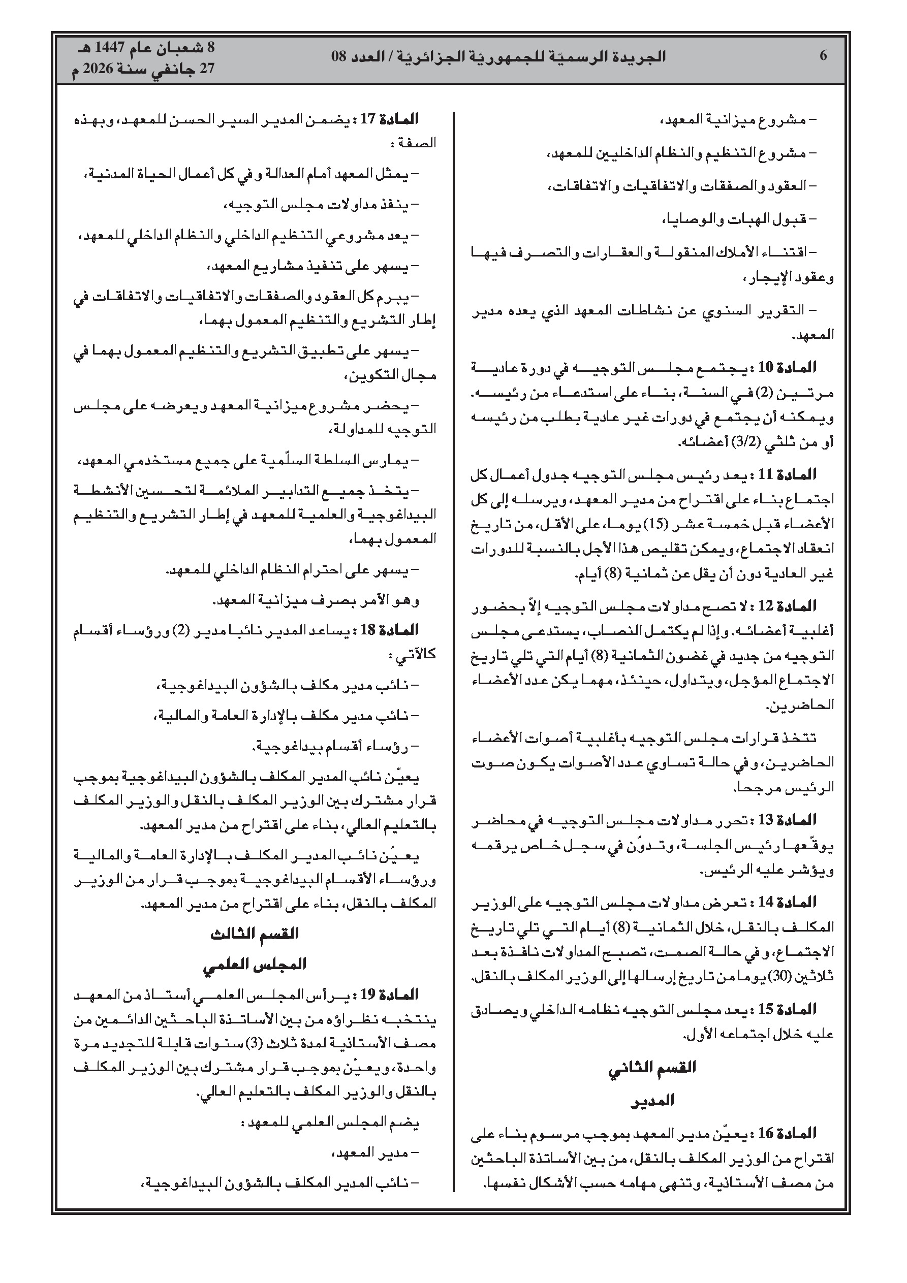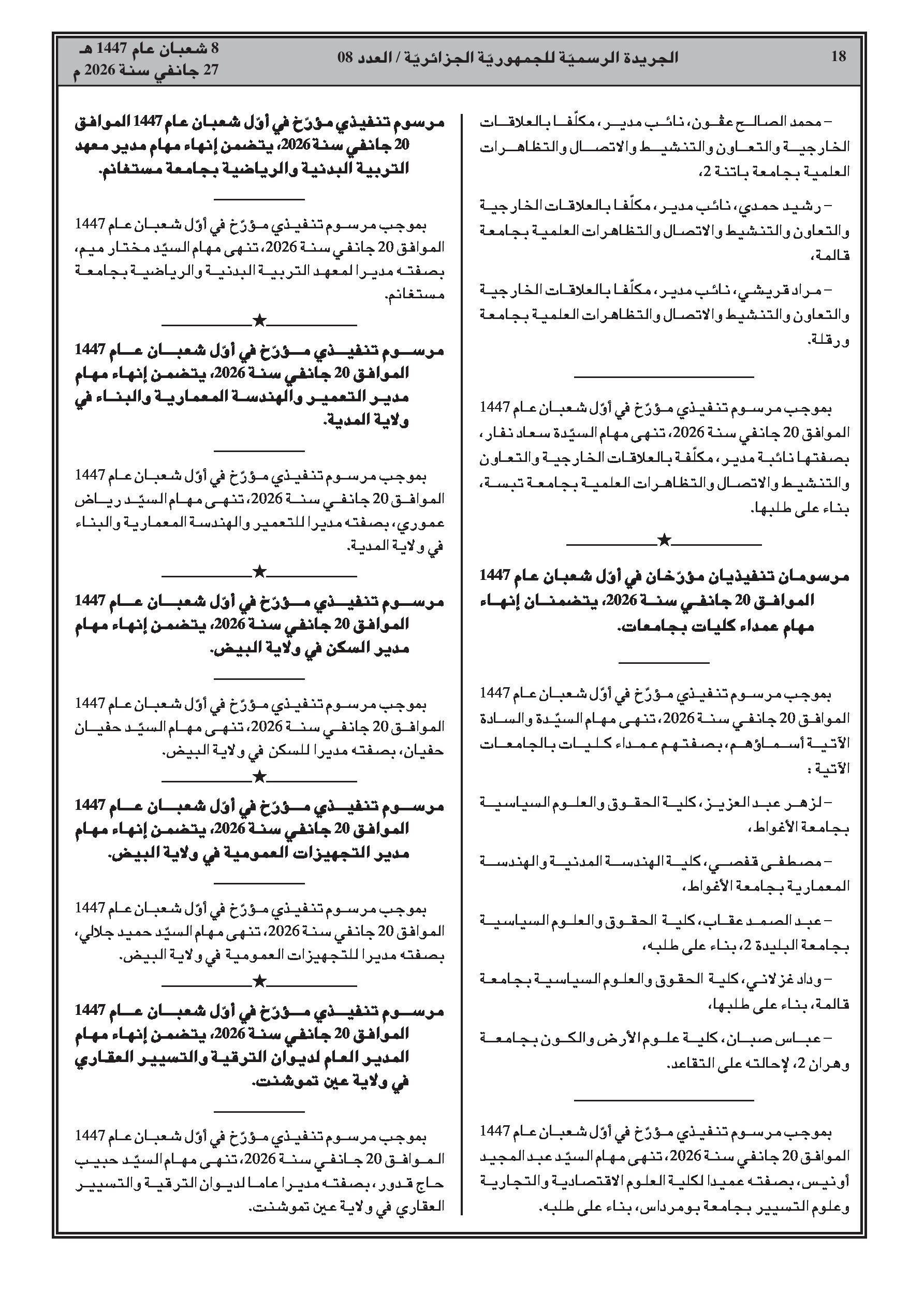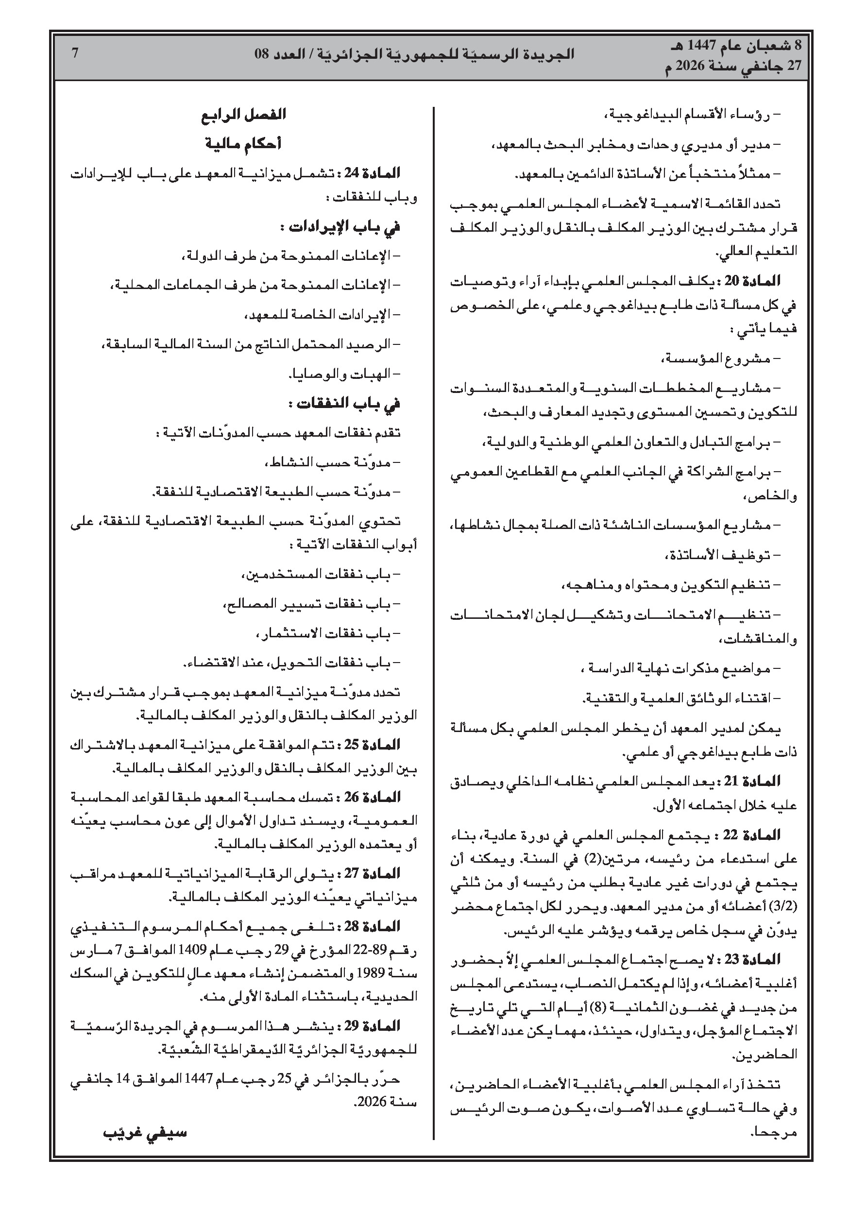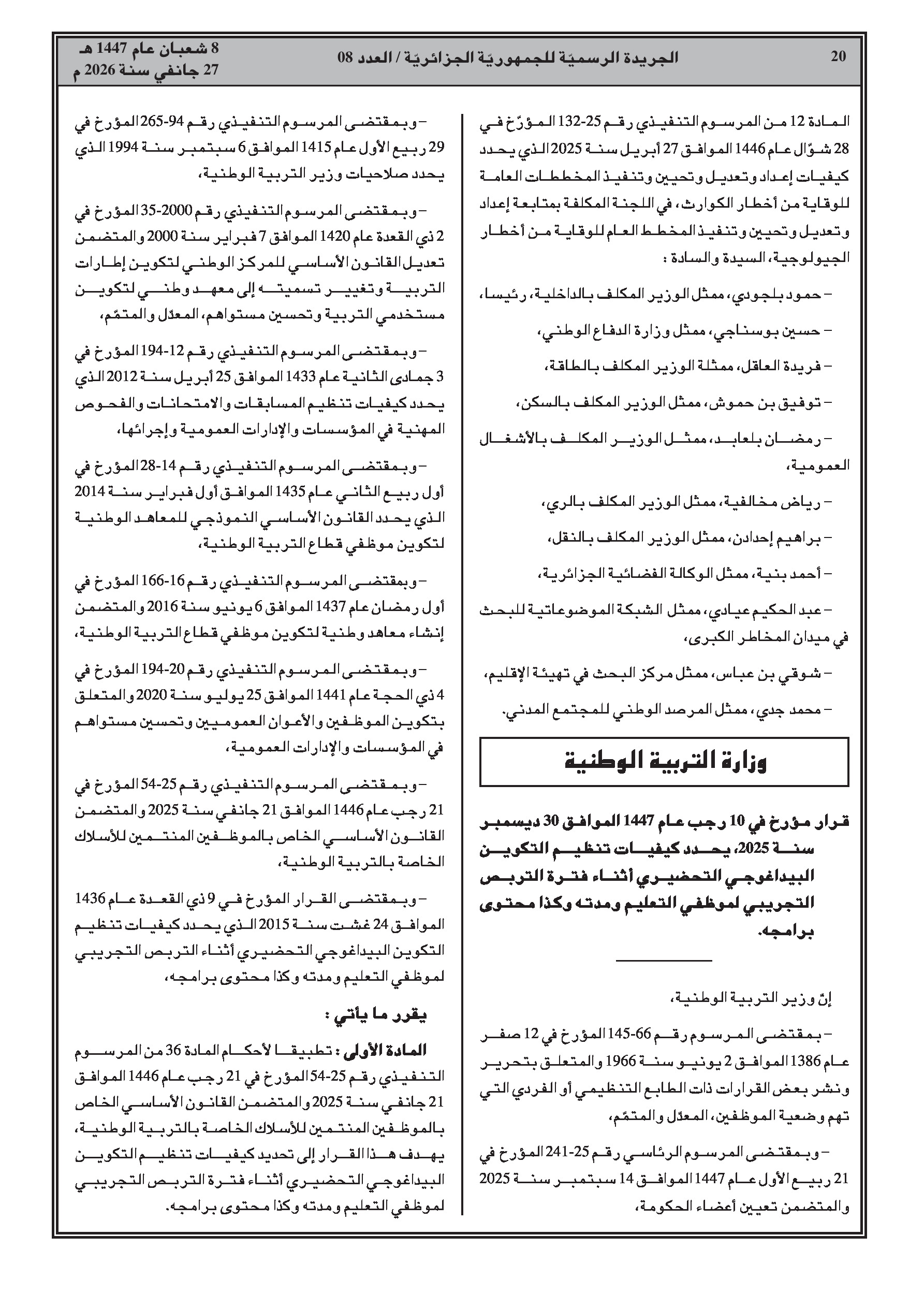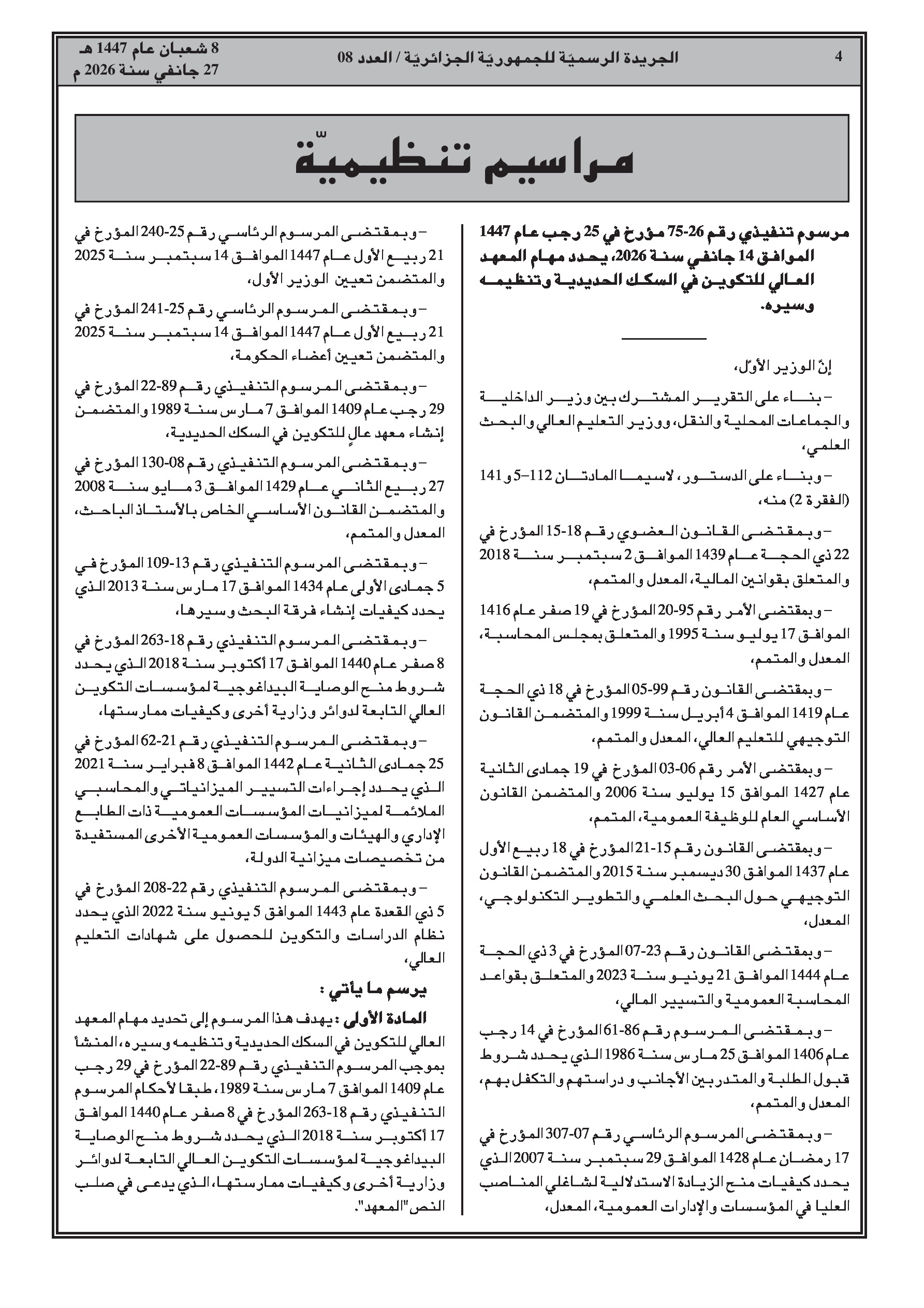تحديد مهام وتنظيم المعهد العالي للتكوين السككي برويبة؛ تعديل تشكيلة اللجنة العملياتية لتنسيق سياسات مكافحة تبييض الأموال وتمويل الإرهاب.