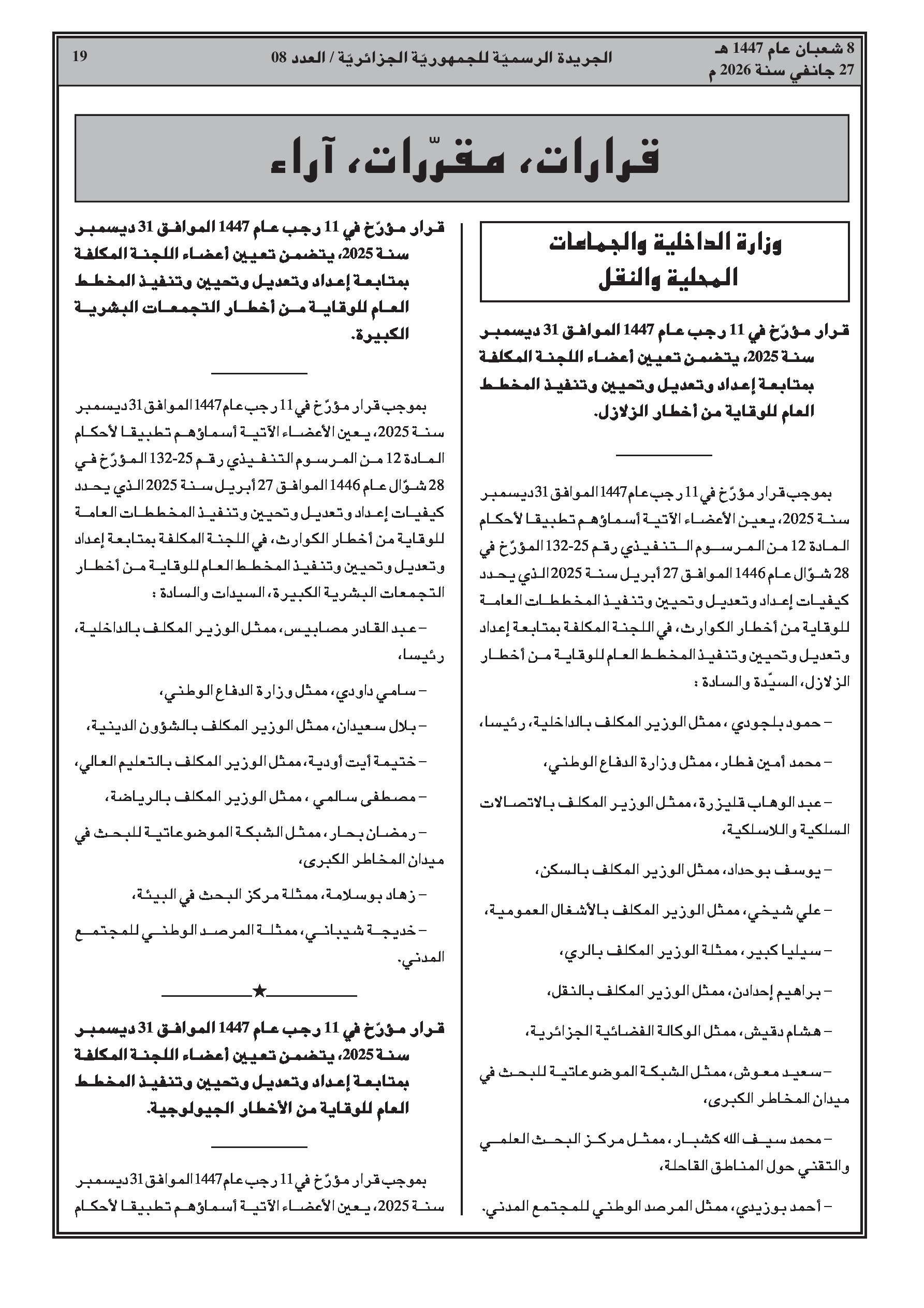 تعيين أعضاء لجان متابعة مخططات الوقاية من المخاطر الزلزالية والجيولوجية.