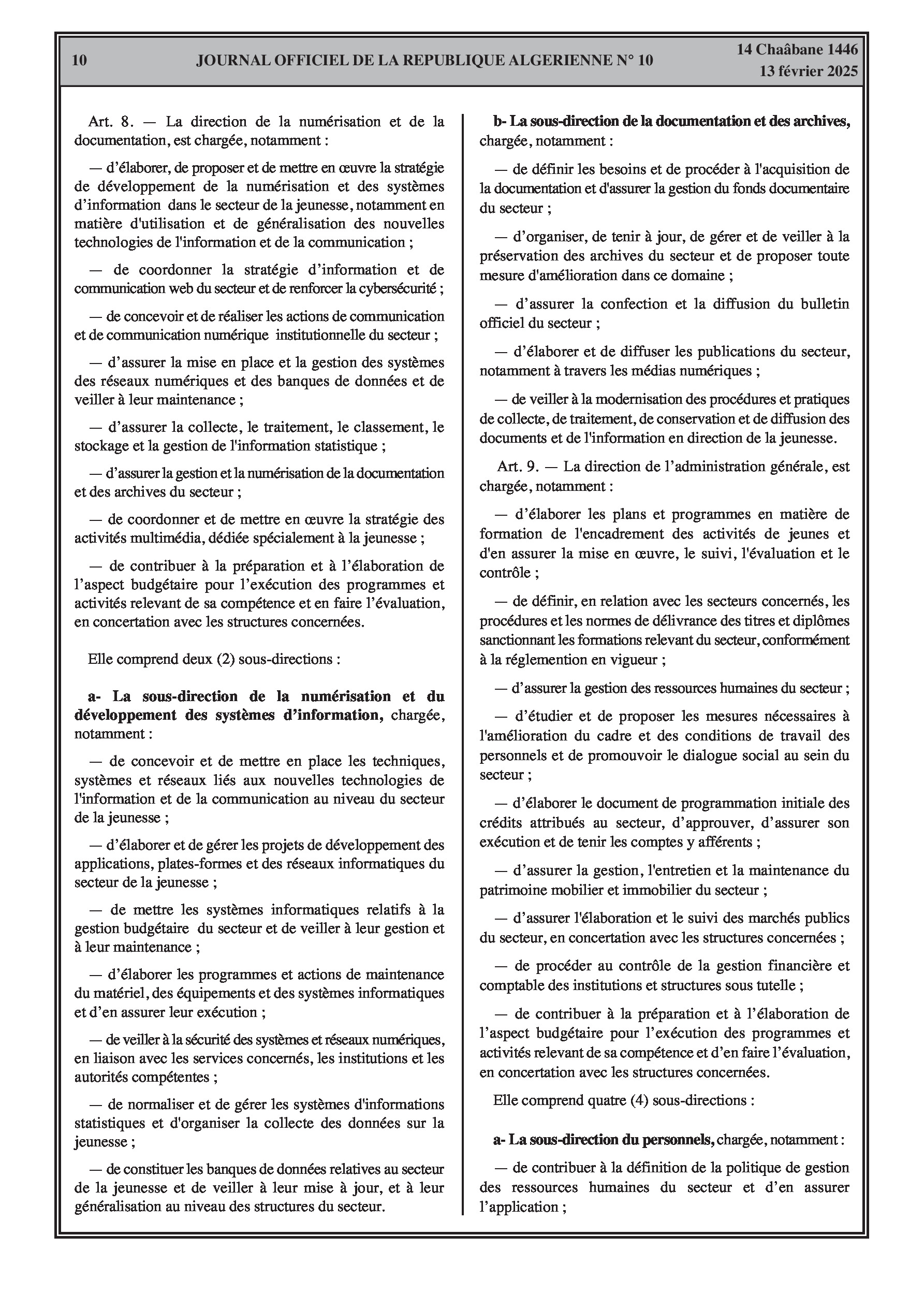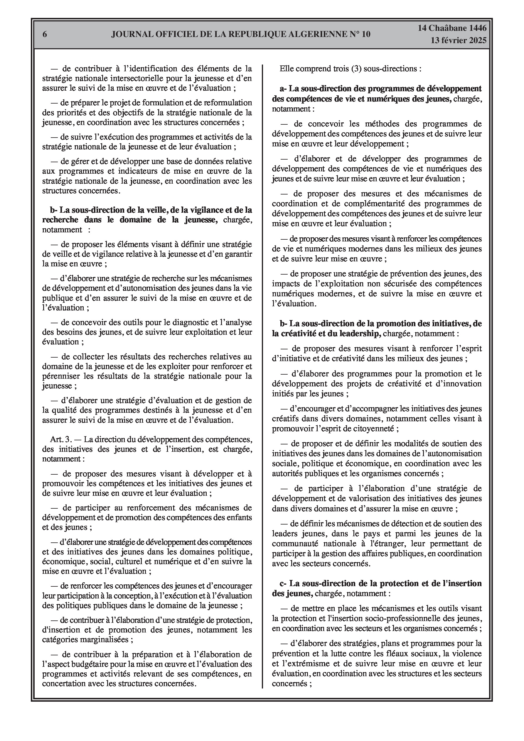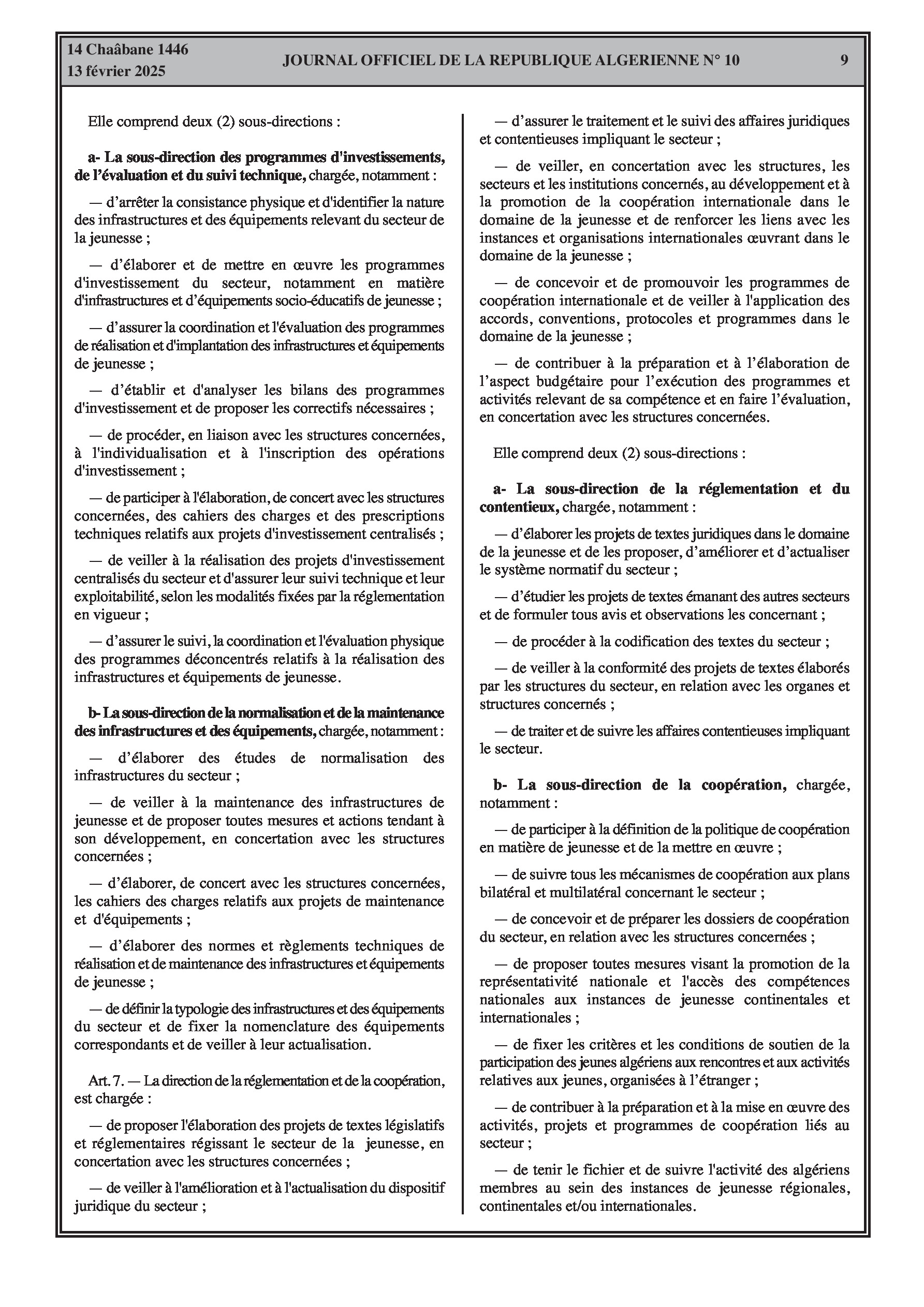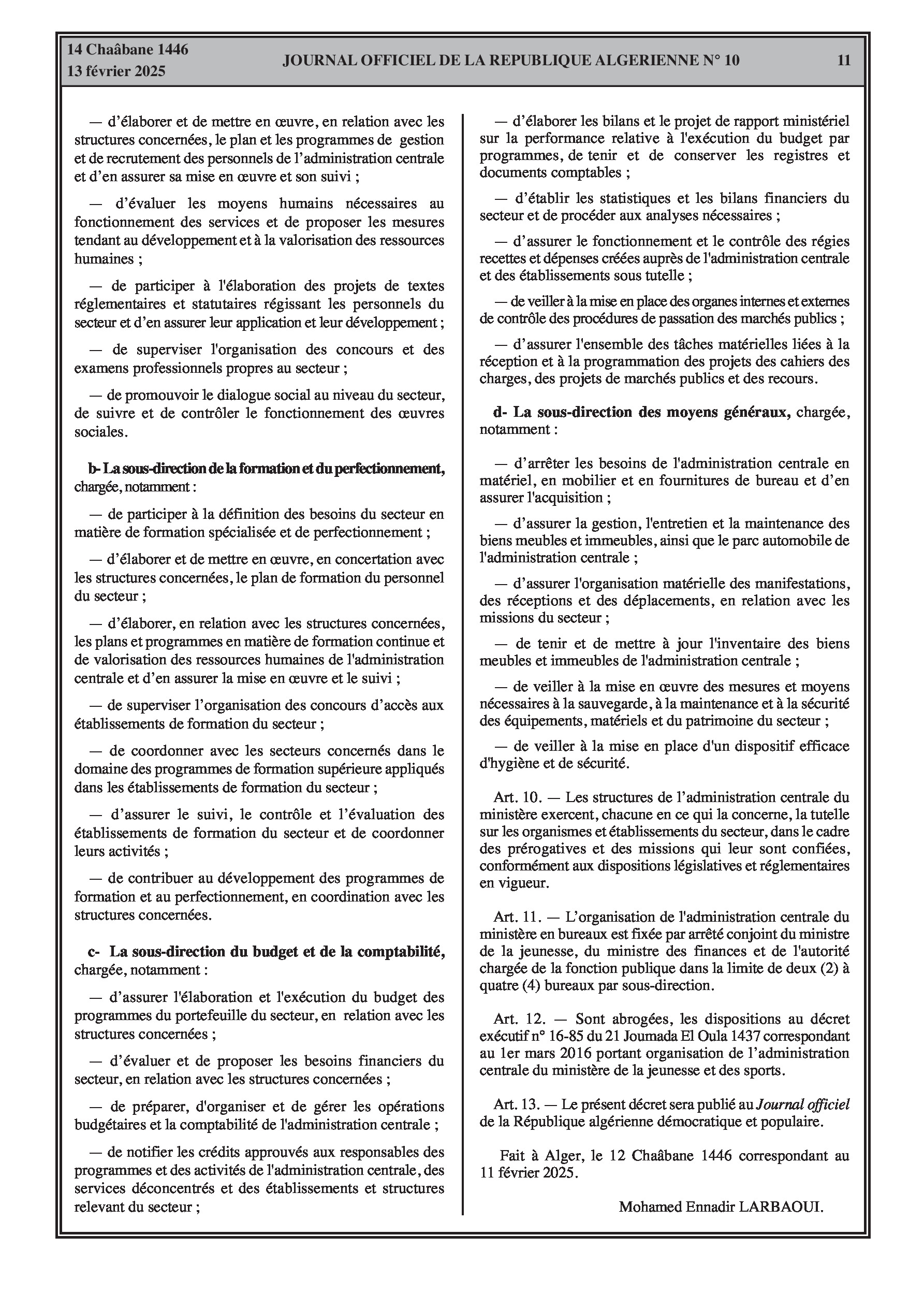 Le décret exécutif n° 25-75 définit la structure organisationnelle de l'administration centrale du ministère de la Jeunesse.