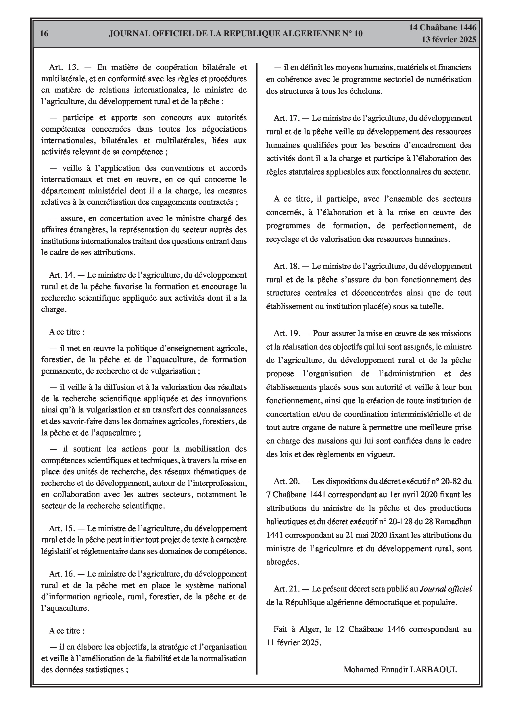 Le décret exécutif n° 25-76 établit les attributions du ministre de l'Agriculture, du Développement Rural et de la Pêche, couvrant l'agriculture, le développement rural, les forêts, la pêche et l'aquaculture.