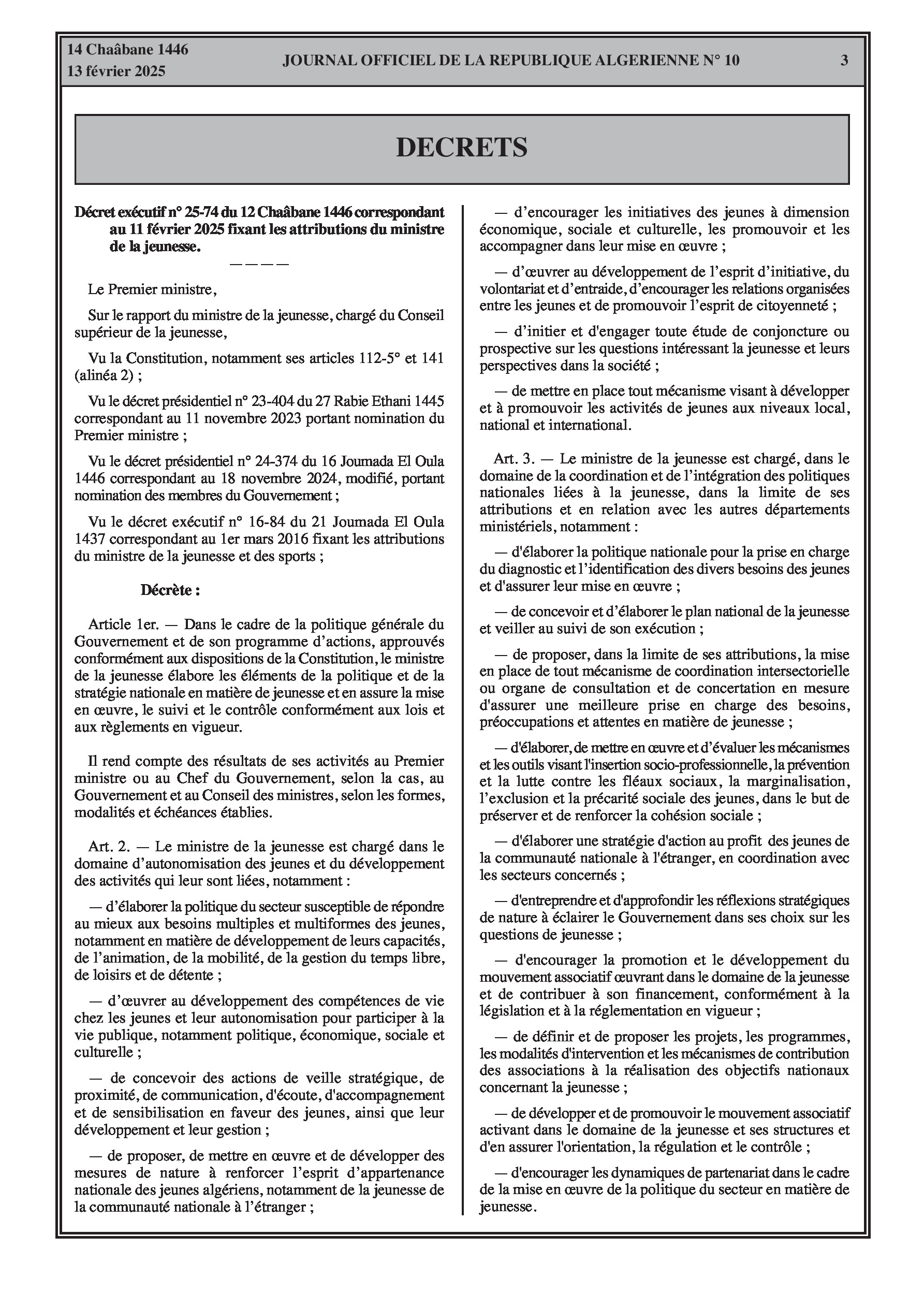 Le décret exécutif n° 25-74 définit les pouvoirs et responsabilités du ministre de la Jeunesse, axés sur l'autonomisation des jeunes et le développement des activités.