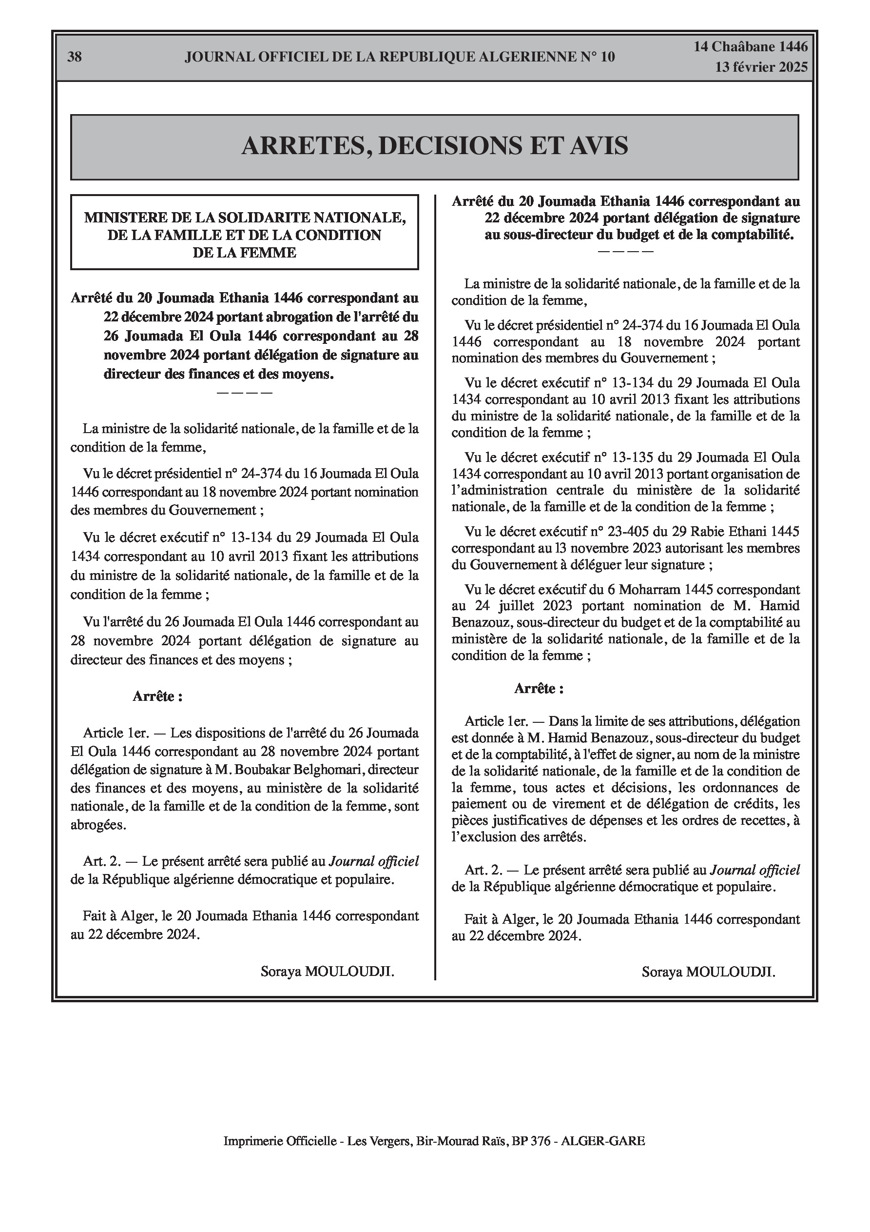 Arrêté du 22 décembre 2024 abrogeant l'arrêté du 28 novembre 2024 portant délégation de signature au directeur des finances et des moyens. Un autre arrêté du 22 décembre 2024 délègue la signature à M. Hamid Benazouz, sous-directeur du budget et de la comptabilité, pour des actes financiers spécifiques.