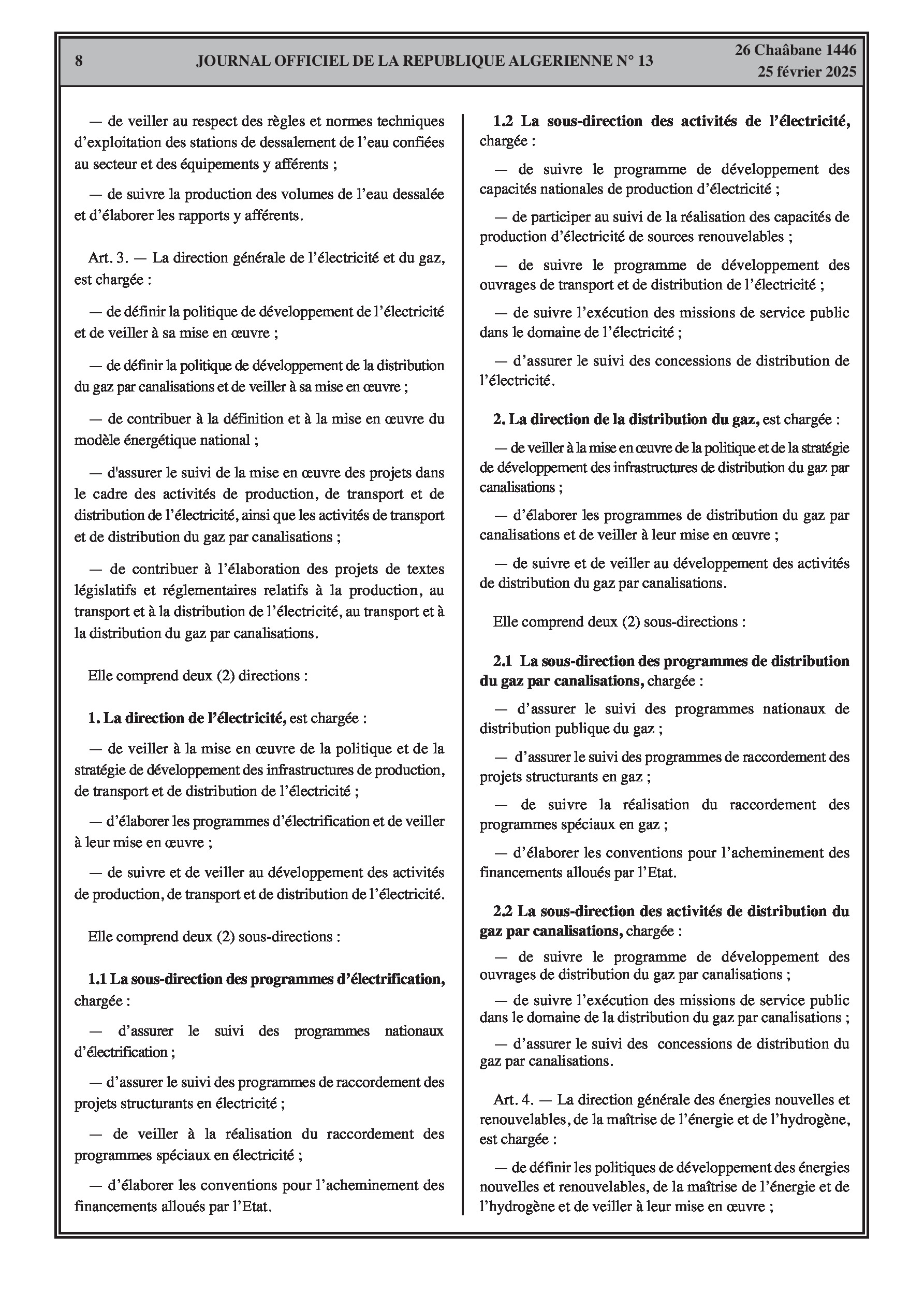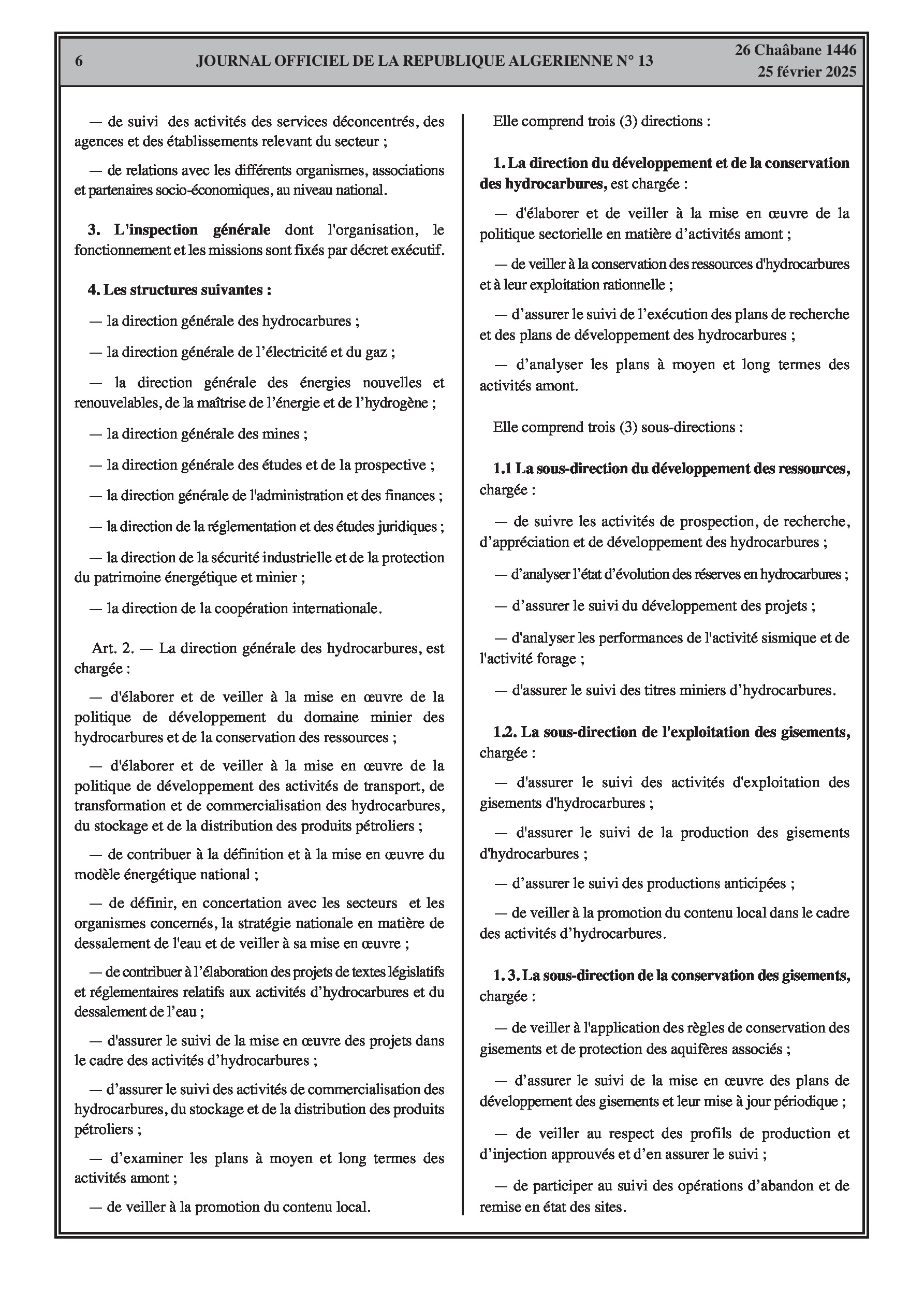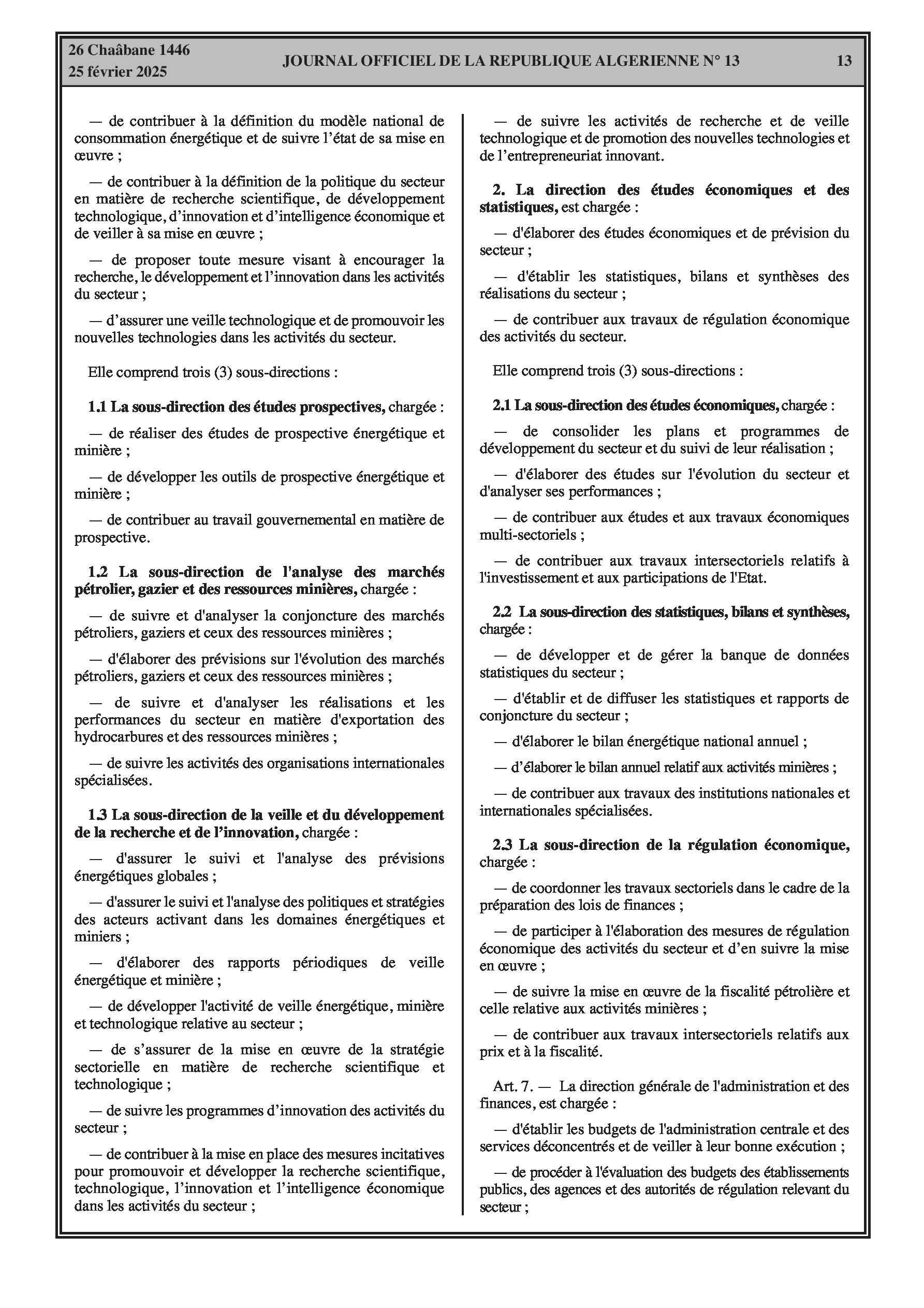 Le décret exécutif n° 25-84 fixe les attributions du ministre de l'énergie, des mines et des énergies renouvelables. Le décret exécutif n° 25-85 porte organisation de l'administration centrale du même ministère, incluant le secrétariat général, le cabinet du ministre, l'inspection générale, et les directions générales.