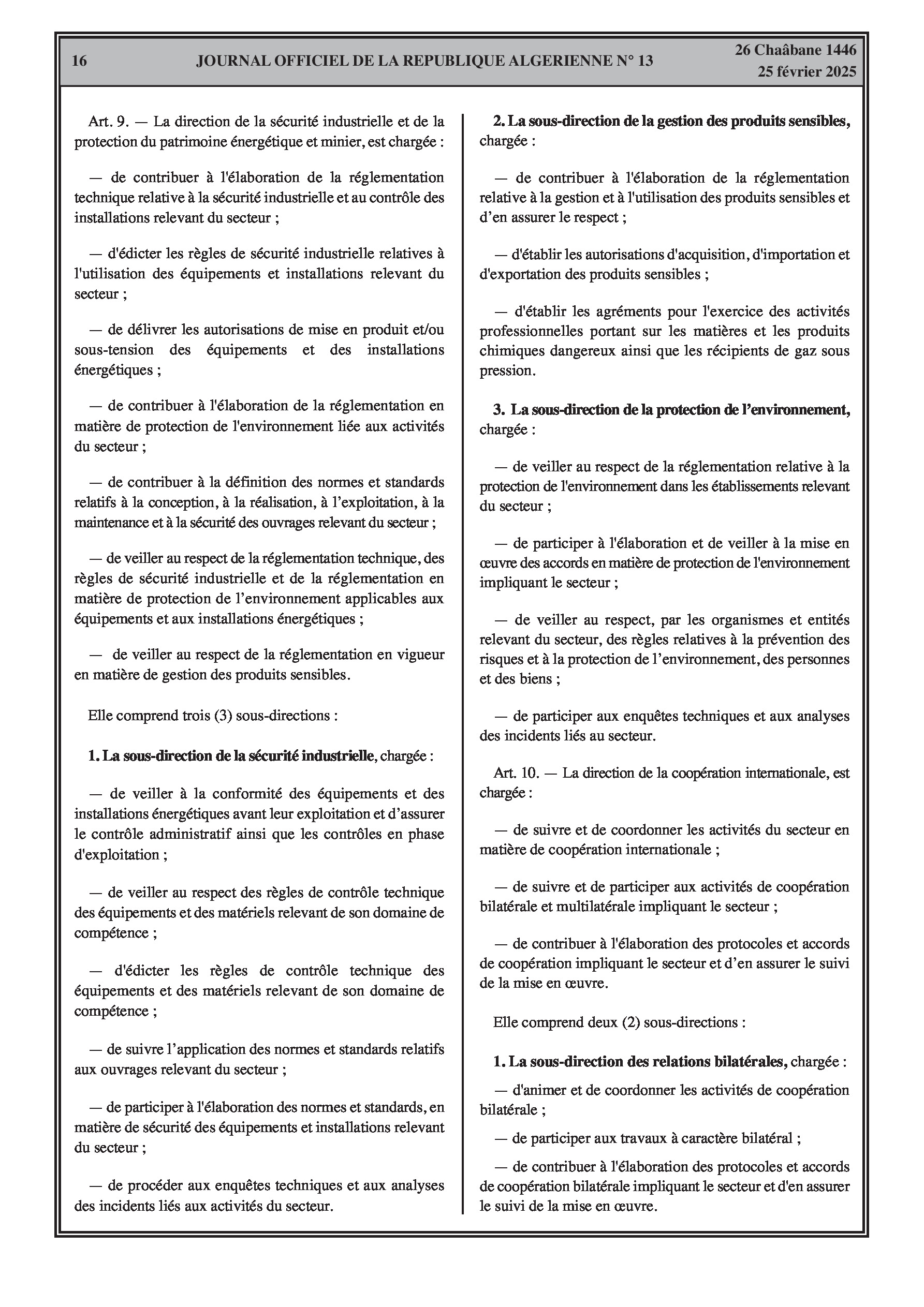 Deux arrêtés du ministère du Tourisme et de l'Artisanat du 5 février 2025 portant prescription d'établissement des plans d'aménagement touristique des zones d'expansion et sites touristiques « Hammam Sidi Mansour » (35 hectares) et « Hammam Sidi Amor » (38 hectares) (wilaya de Sétif), détaillant leur procédure d'élaboration en trois phases sur 12 mois. Un arrêté du ministère de l'Industrie Pharmaceutique du 20 février 2025 autorisant la commercialisation des dispositifs médicaux (fabriqués localement ou importés) n'ayant pas encore obtenu de décision d'homologation, pour une durée de deux ans.