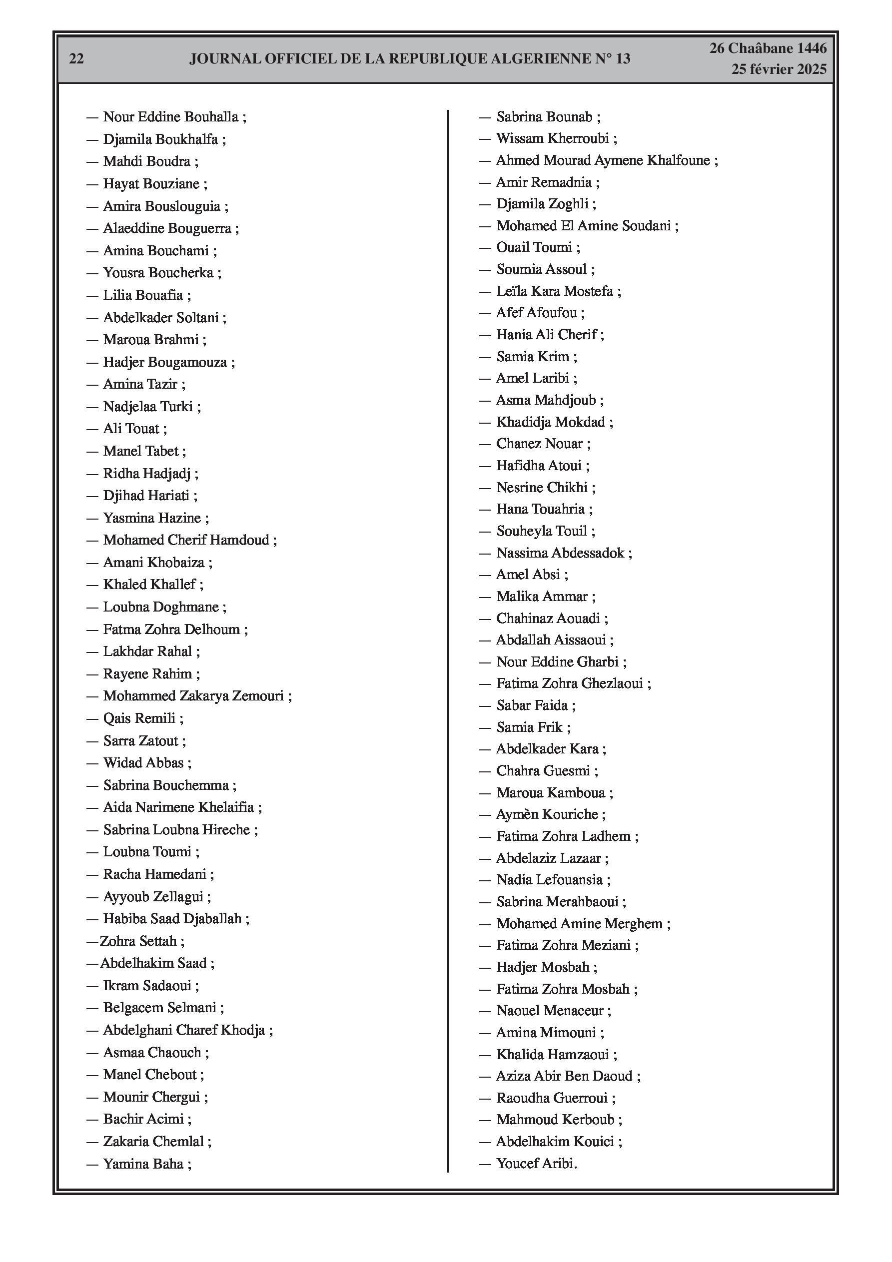 Décrets présidentiels du 18 février 2025 concernant des fins de fonctions et nominations de hauts fonctionnaires au ministère de l'Intérieur, des Collectivités locales et de l'Aménagement du territoire (directeurs généraux, directeur, sous-directeur), des fins de fonctions de magistrats (pour admission à la retraite) et nominations de nouveaux magistrats, la nomination d'un membre au conseil de l'Autorité de régulation de la poste et des communications électroniques, et la nomination d'une sous-directrice du budget et de la comptabilité au rectorat de Djamaâ El Djazaïr.