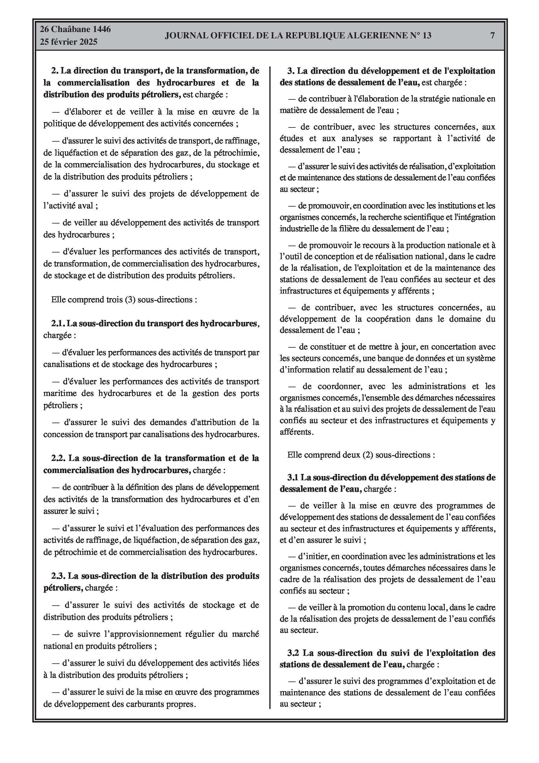 Deux décrets exécutifs définissant les attributions du ministre de l'Énergie, des Mines et des Énergies Renouvelables et l'organisation de l'administration centrale du ministère.