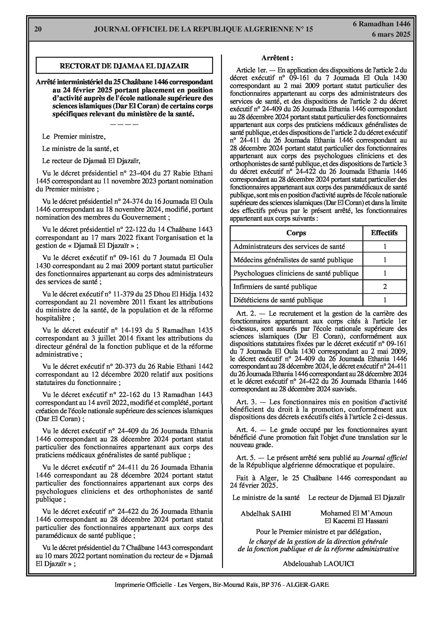 Arrêté interministériel portant placement en position d'activité auprès de l'école nationale supérieure des sciences islamiques (Dar El Coran) de certains corps spécifiques relevant du ministère de la santé.