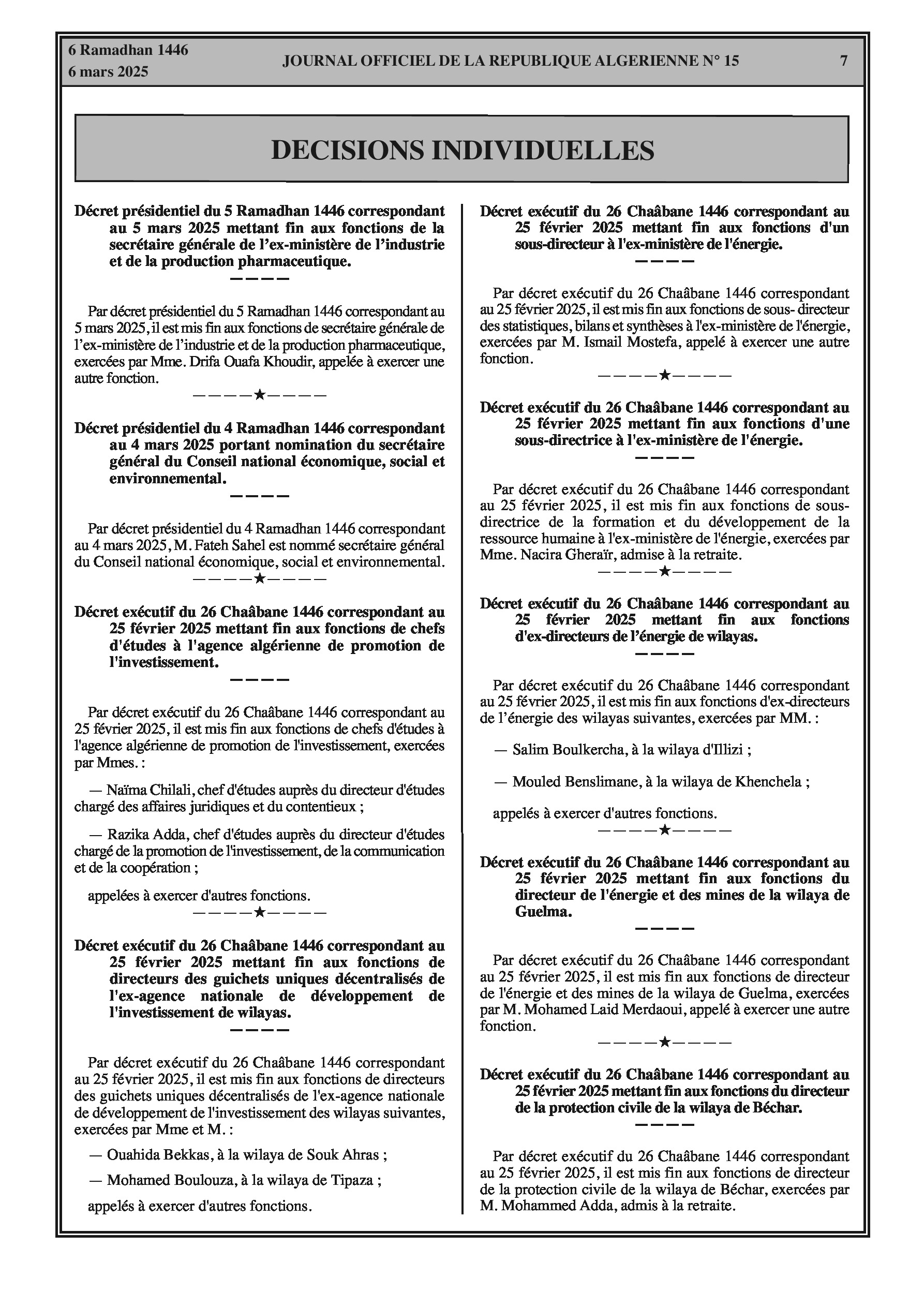Série de décrets présidentiels et exécutifs portant sur des fins de fonctions et des nominations à divers postes de direction au sein de ministères et d'organismes gouvernementaux, incluant le Conseil national économique, social et environnemental, l'Agence algérienne de promotion de l'investissement, et les secteurs de l'industrie, de l'énergie, de l'enseignement supérieur, et des travaux publics.