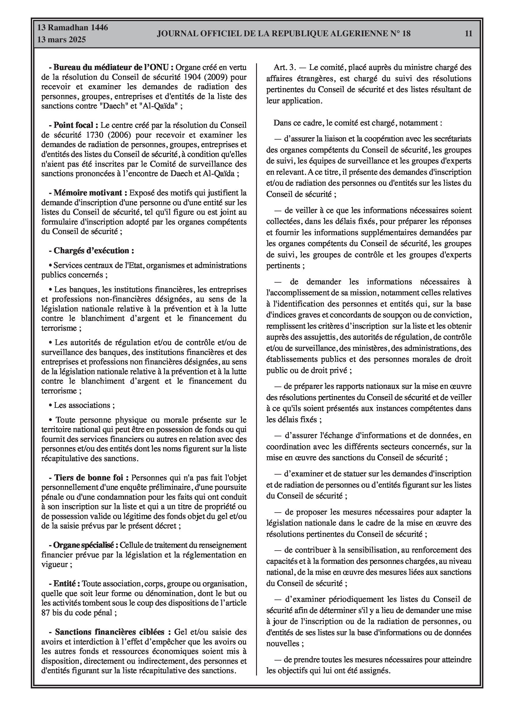 - Le comité est présidé par un représentant du ministre des Affaires étrangères et comprend des représentants de divers secteurs (Défense, Intérieur, Justice, Finances, et organismes de sécurité). - Les missions incluent la coordination avec les organes de l'ONU, la soumission des demandes d'inscription/radiation, la préparation des rapports nationaux, et la proposition d'amendements législatifs. - Abroge le décret exécutif n° 23-431.