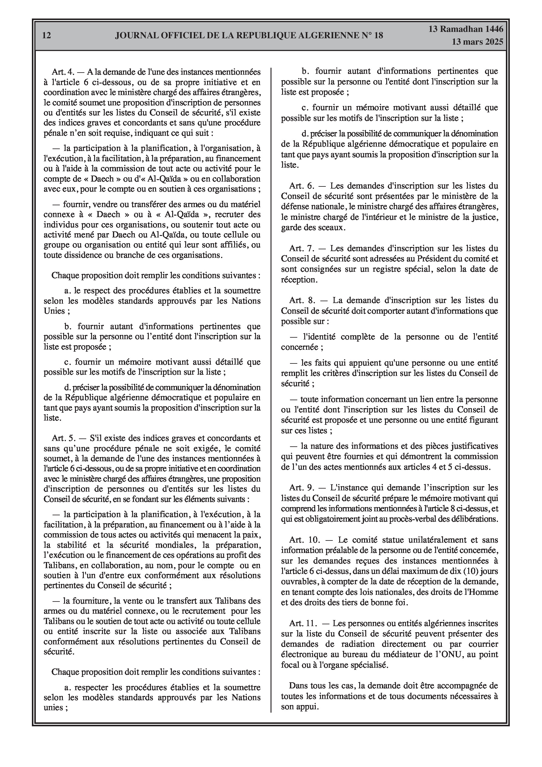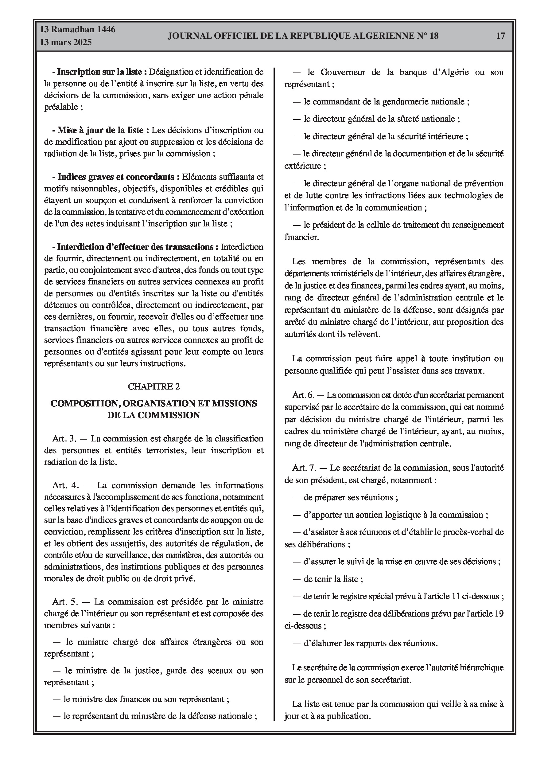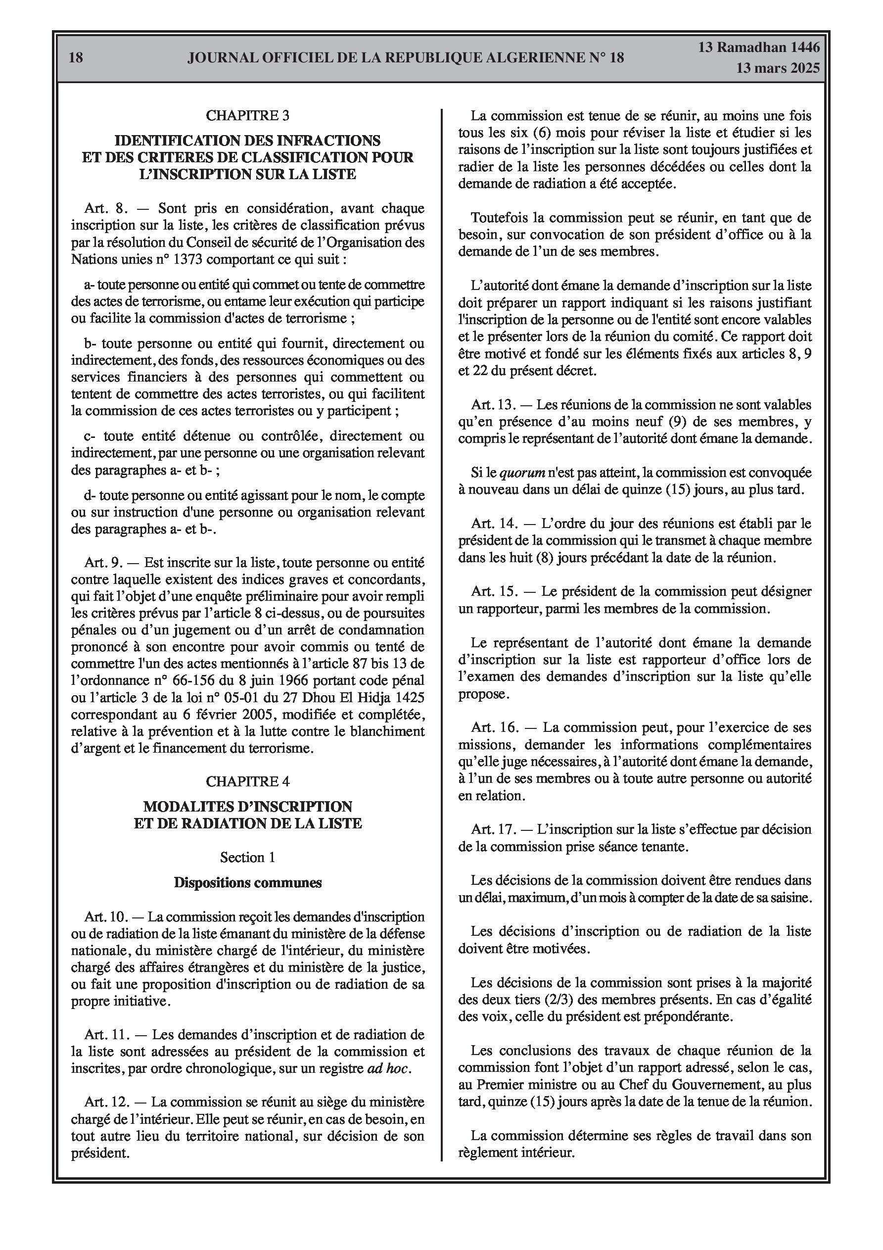 - Instauration d'une commission de classification des personnes et entités terroristes, présidée par le ministre de l'Intérieur. - Définition des critères de classification basés sur les résolutions du Conseil de sécurité et les dispositions légales. - Réglementation des procédures de demande d'inscription, de radiation, de révision de la liste, et de sa publication. - Détail des effets de l'inscription : interdiction d'activité, gel des fonds, interdiction de voyager. - Abroge le décret exécutif n° 24-243.